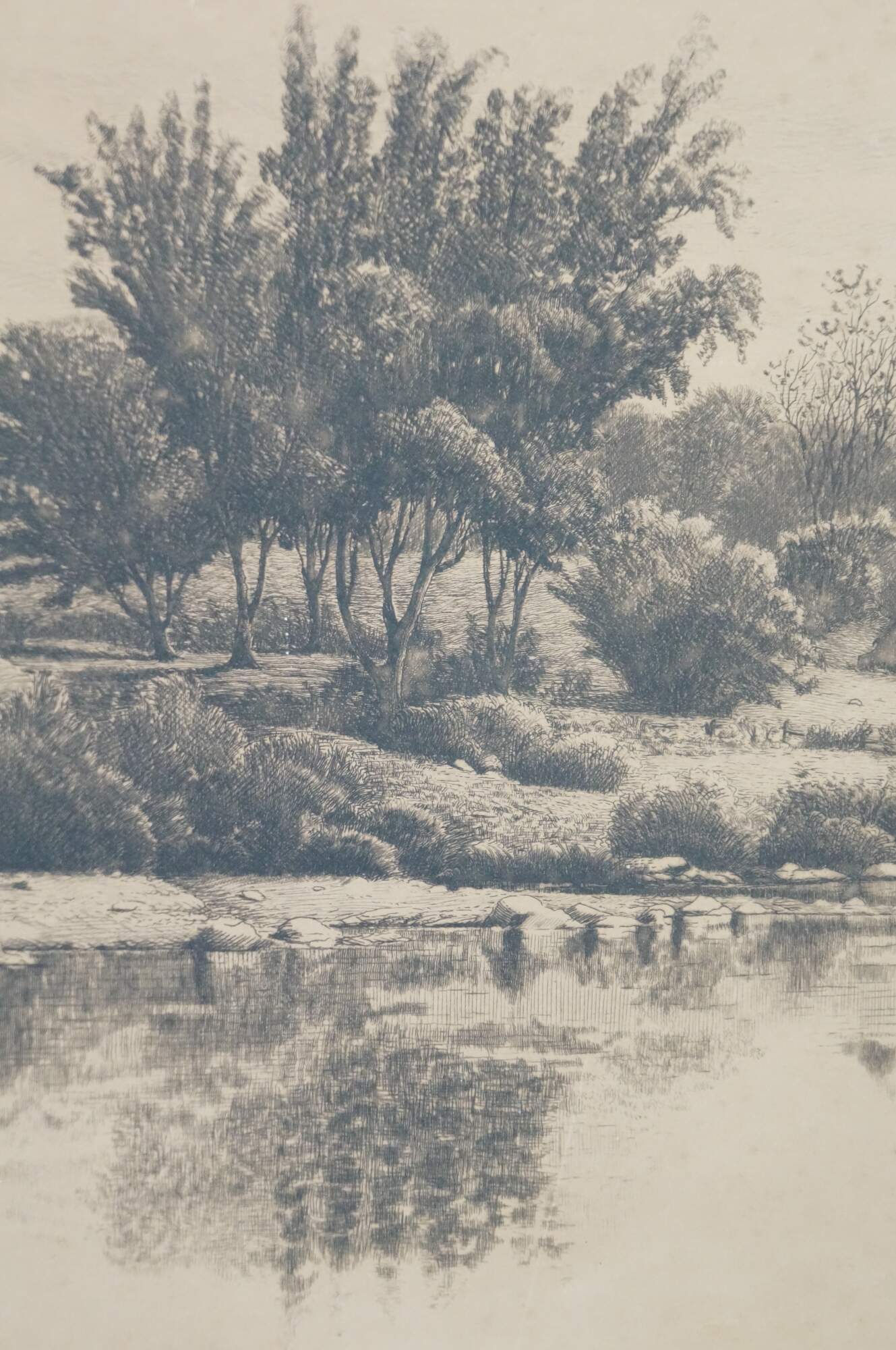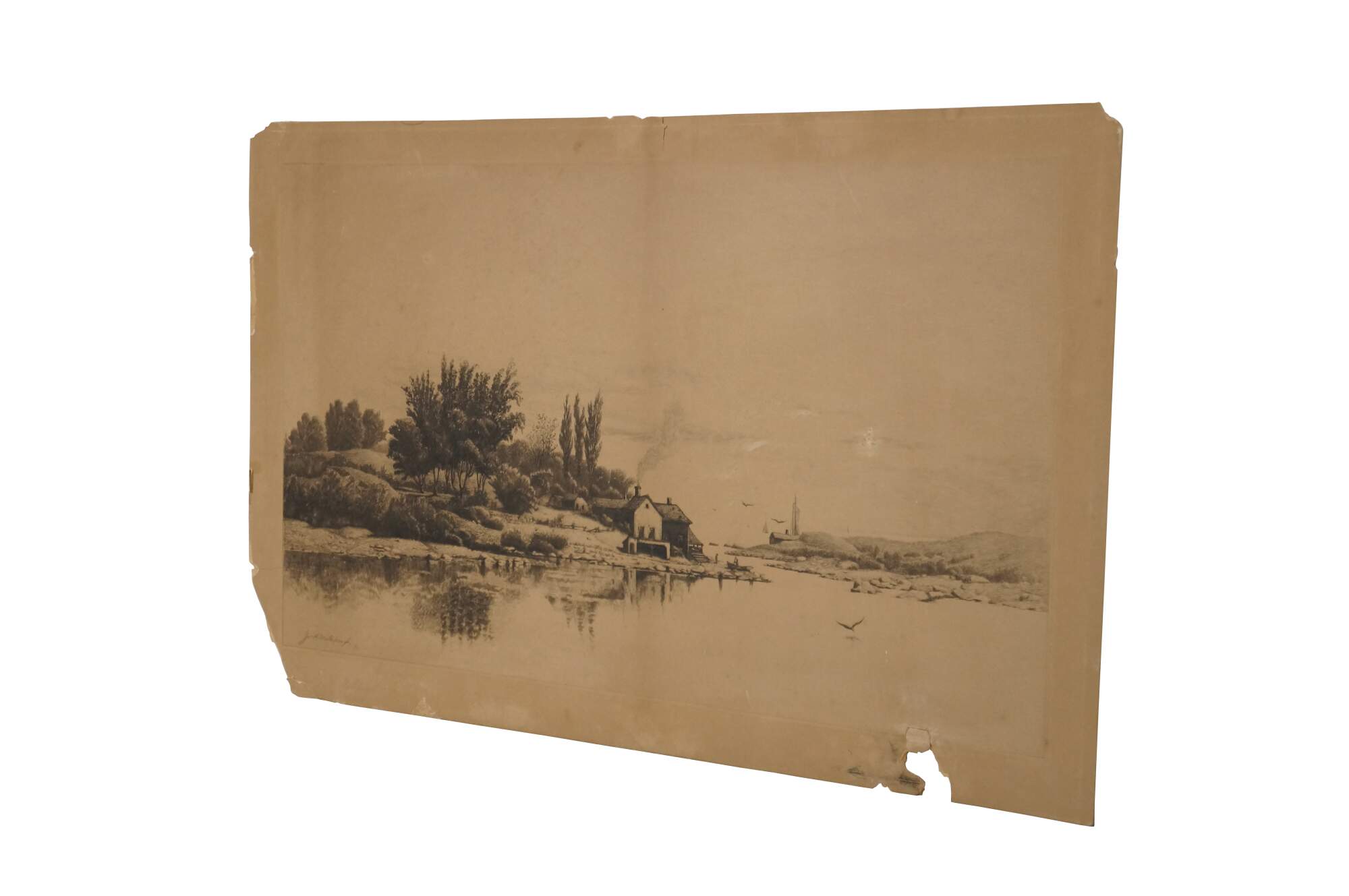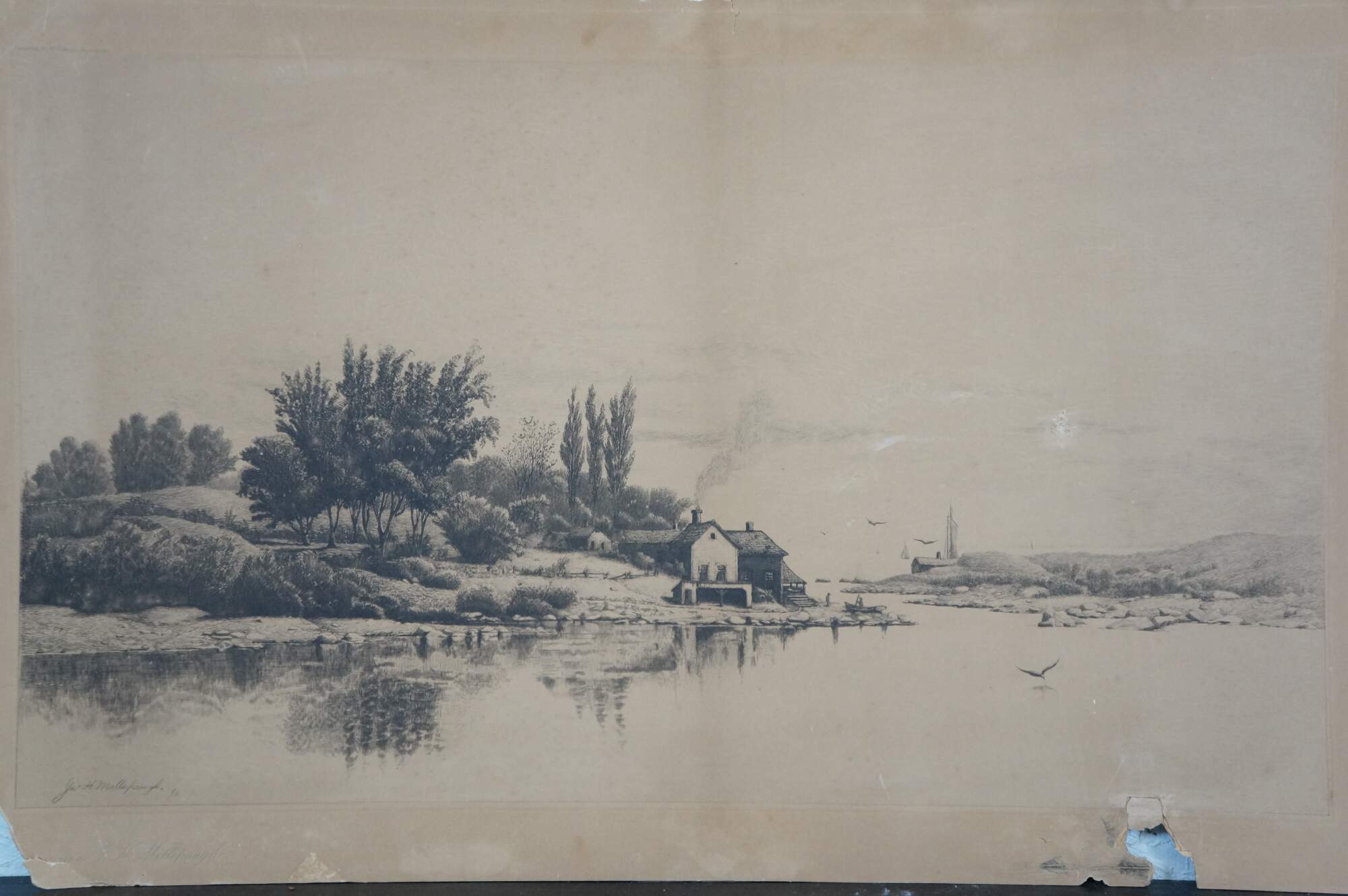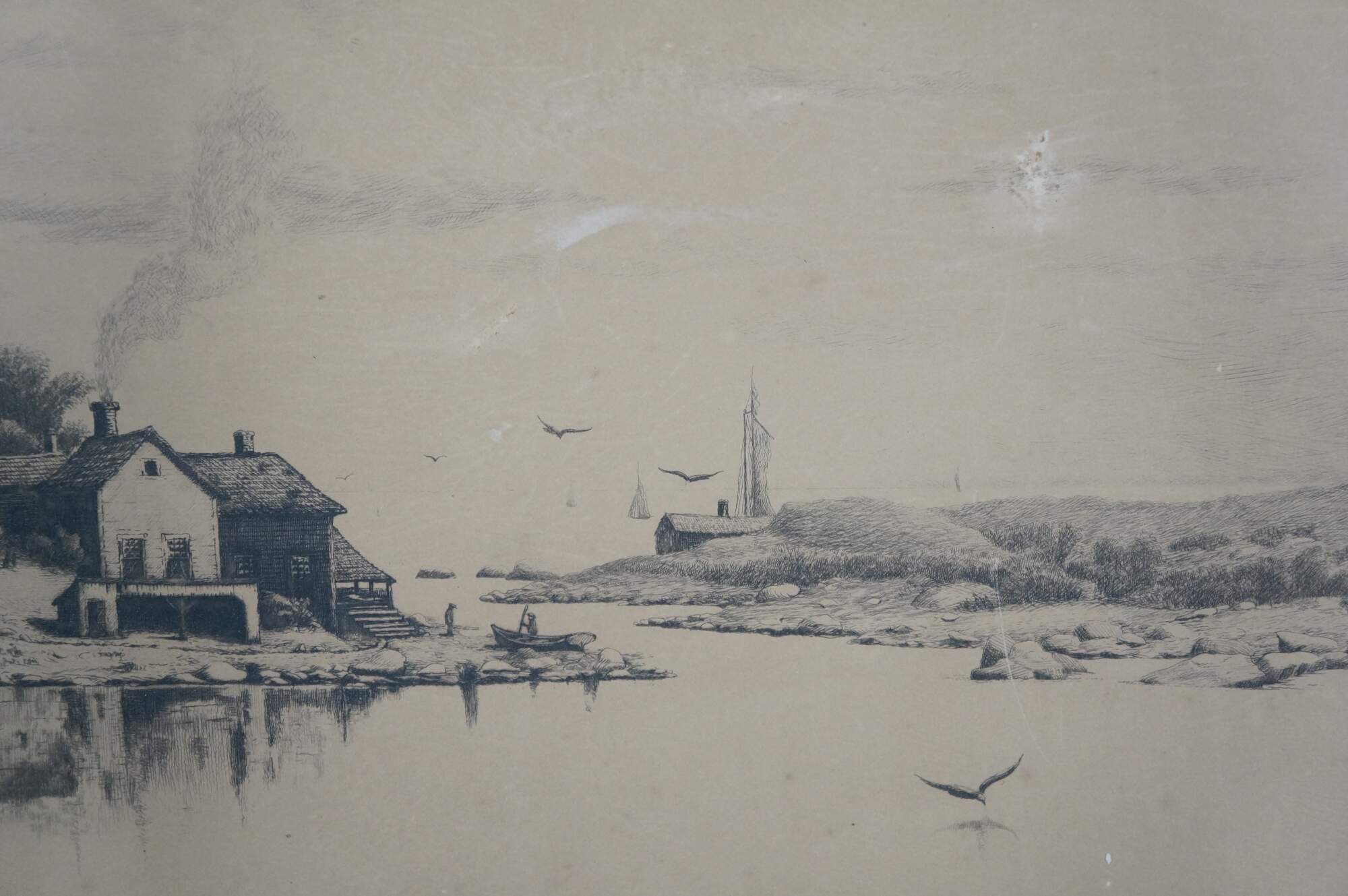 Late 19th century black and white etching by John Hill Millspaugh. Coastal landscape of a house at the edge of a large inlet. Signed in plate/dated 90, lower left. Copyrighted by John H. Millspaugh, New York 1891. Cardboard; unframed.