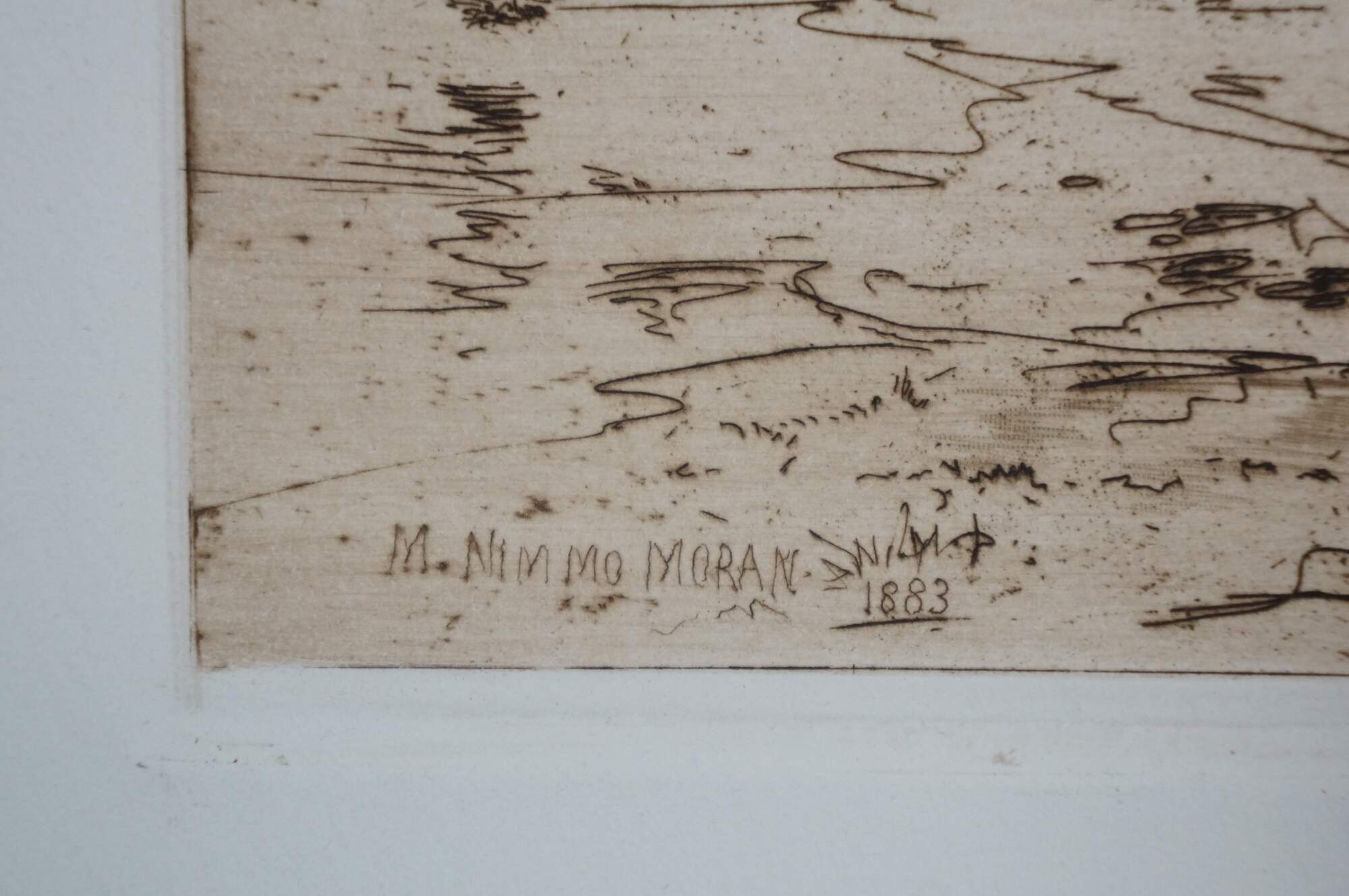 "Mary Nimmo Moran (1842 - 1899) was active/lived in New York / Scotland. Born in Strathaven, Scotland, Mary Moran established a reputation as one of the foremost 19th-century landscape etchers in the United States. Many of her etchings were made on location directly onto the copper plate. She finished about 70 landscape etchings that included scenes of England and Scotland as well as New Jersey, Long Island, Pennsylvania and Florida. Her father, Archibald Nimmo, was a weaver, and when her mother died when Mary was five years old, the father brought her and her brother to America where they settled in Crescentville, Pennsylvania, near Philadelphia. They were neighbors of the Moran family whose son and panoramic landscape painter, Thomas, she married in 1862. Mary learned to draw and paint in oil and watercolor from him and made her first etching in 1879. Soon she was exhibiting at the Pennsylvania Academy (1878-1889) and in New York at the National Academy of Design (1877-1896). Other exhibition venues were the Boston Art Club, Brooklyn Art Association, and the Women Etchers of America exhibition at the Union Club in New York. She worked primarily on the East Coast and Florida but also in Europe. The Morans had three children, and with their family, they painted in France, Italy and Switzerland in 1867. Upon their return, Thomas Moran's painting "The Grand Canyon of the Yellowstone" sold for ten-thousand dollars, and they used the money to buy a home in Newark, New Jersey. Mary Moran did many paintings of the surrounding New Jersey countryside, managed the business aspects of her husband's career, and ran a drawing school for children. Because of poor health, she could not accompany her husband on his many western trips. To occupy her in addition to her painting while he was away, Thomas Moran gave her copper plates and suggested that she take up etching. When he returned, he was so pleased with her work that he submitted then to the New York Etching Club. The positive reception was immediate. "Mary Moran had indeed found her metier; she worked furiously, and in the 1880s, was recognized as the leading American woman etcher." (Rubinstein 71). She was elected to the New York Etching Club and to the Society of Painters and Etchers in New York. In 1881, in recognition of her printmaking abilities, she was elected an original fellow of the Royal Society of Painters-Etchers, the only woman among 65 members. English critic John Ruskin gave her much praise for her entries as did other critics. In 1893, she won a medal at the World's Columbian Exposition in Chicago for her prints. Six years later, she died at age fifty seven from typhoid fever, having exhausted herself by nursing her daughter through the same illness. The Smithsonian Institution held a retrospective of her work in 1950." (askART)