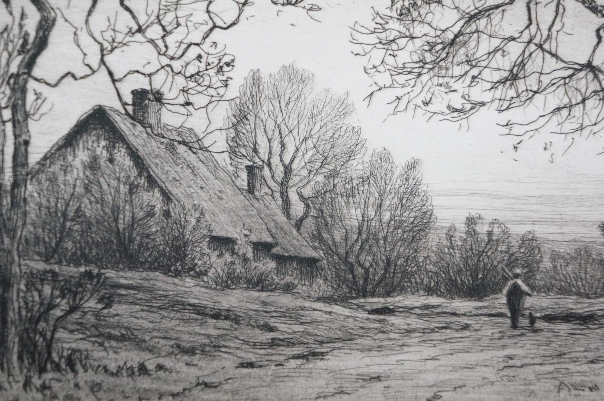 Pair of late 19th century book plate etchings from the 1883 folio "Original Etchings by American Artists." Included are "'Tween the Gloamin' and the Mirk, When the Kye Come Hame" by Mrs. Mary Nimmo Moran and "Winter Evening" by Henry Farrer. Both signed in plate/dated 1883. Both include title pages. Winter Evening also includes page of information about the piece/artist.