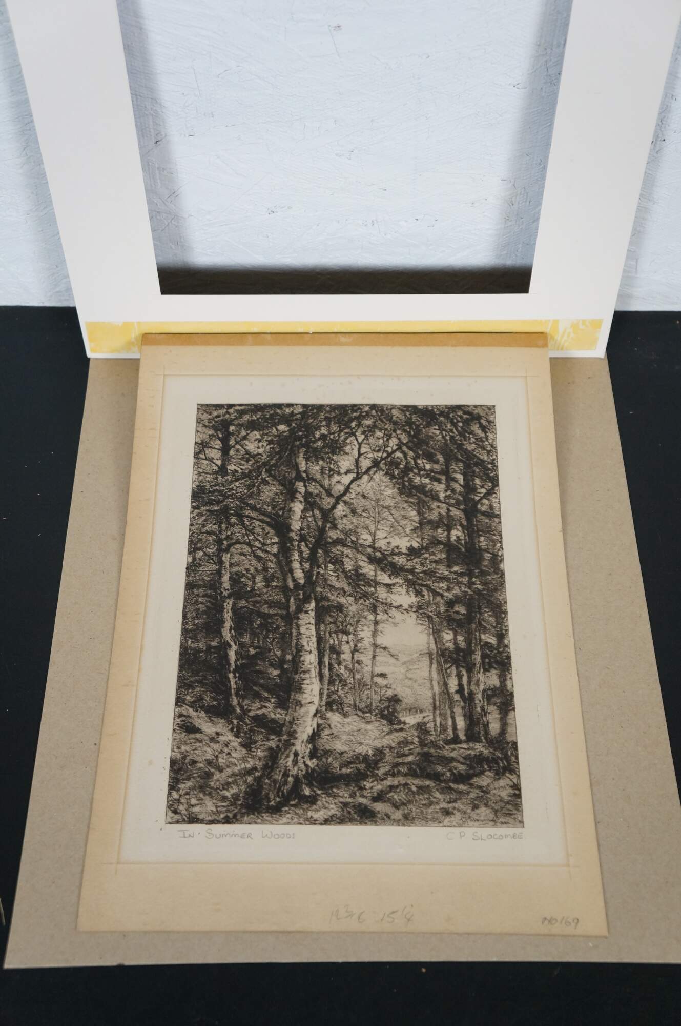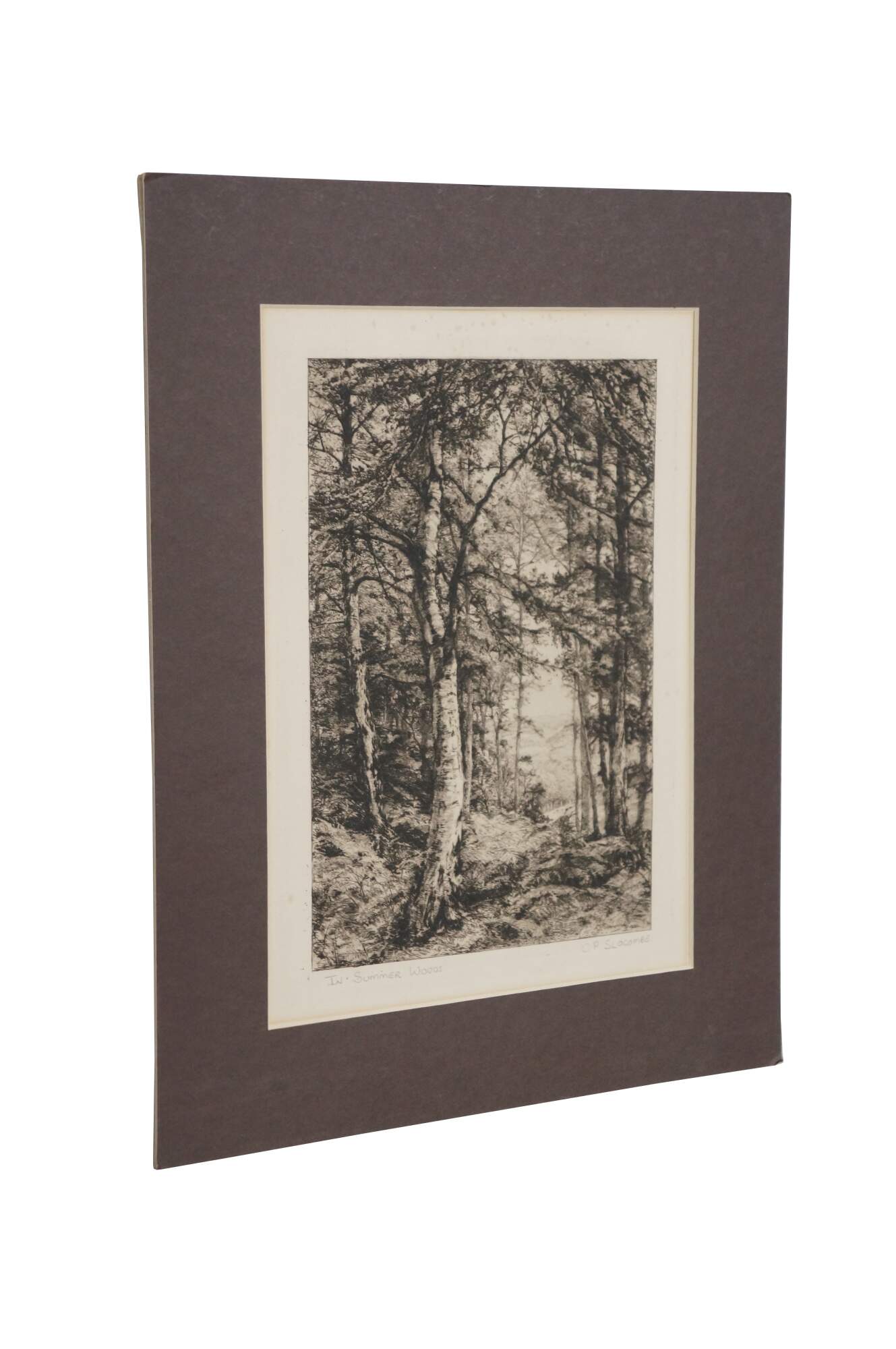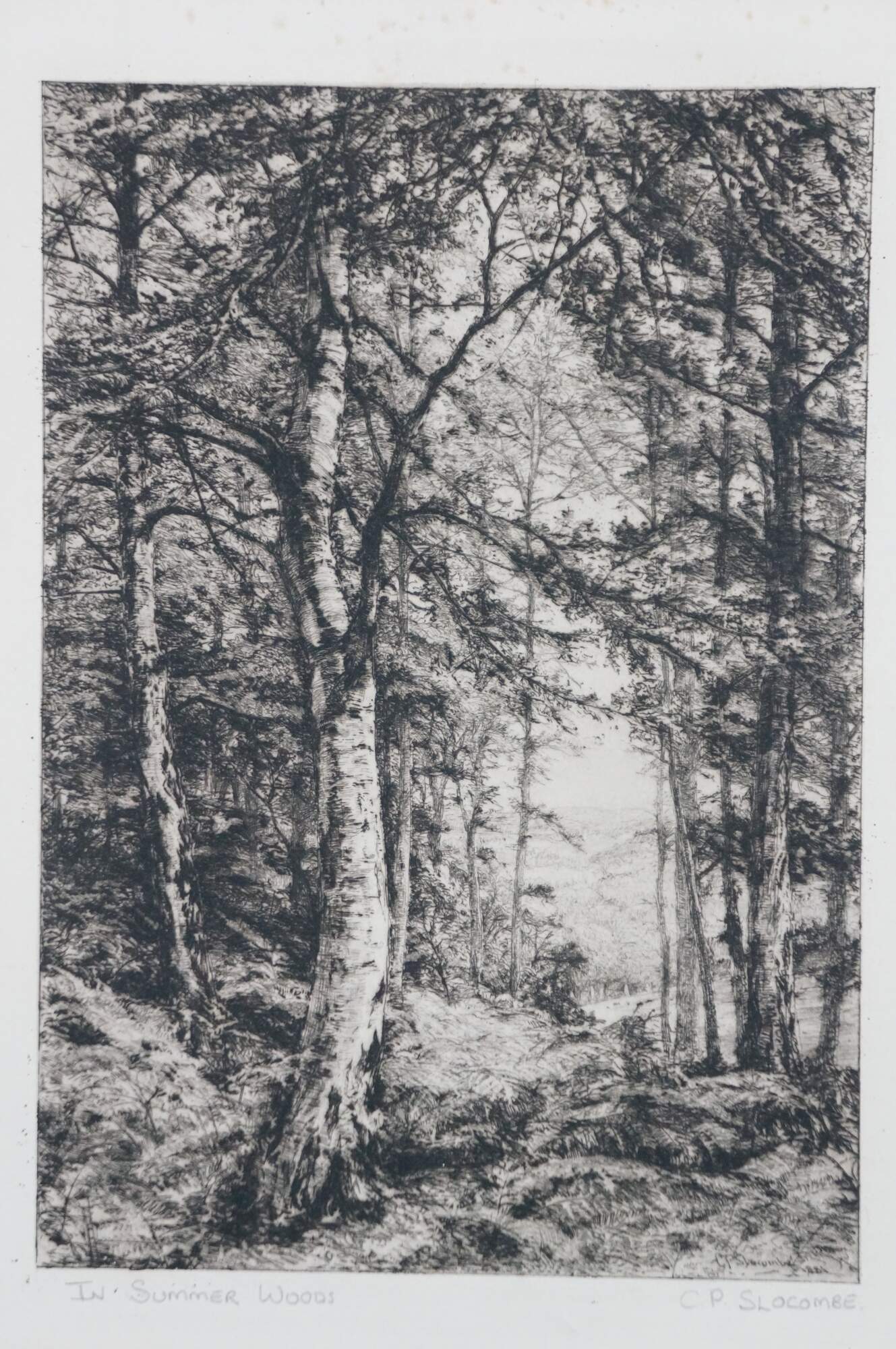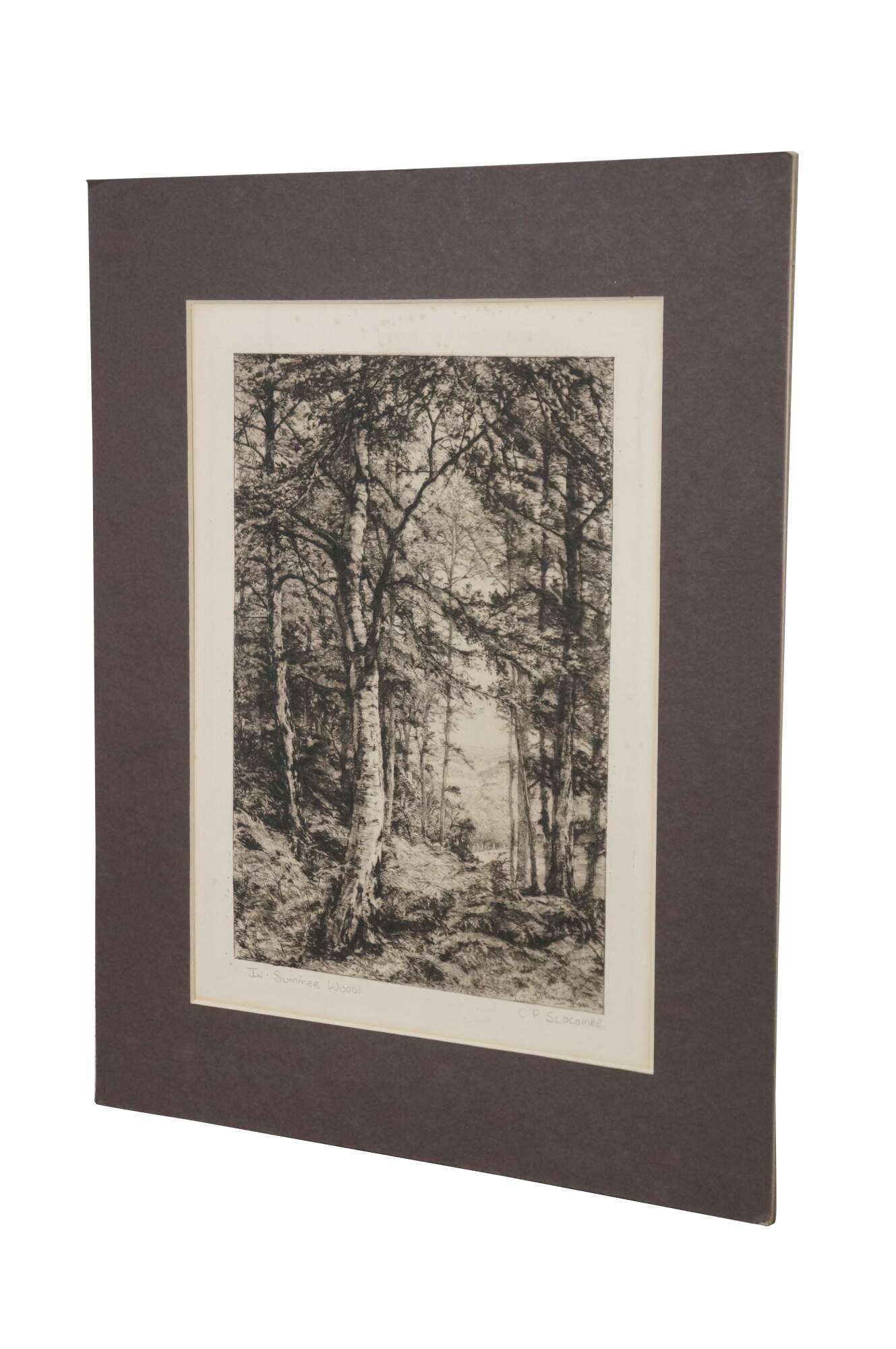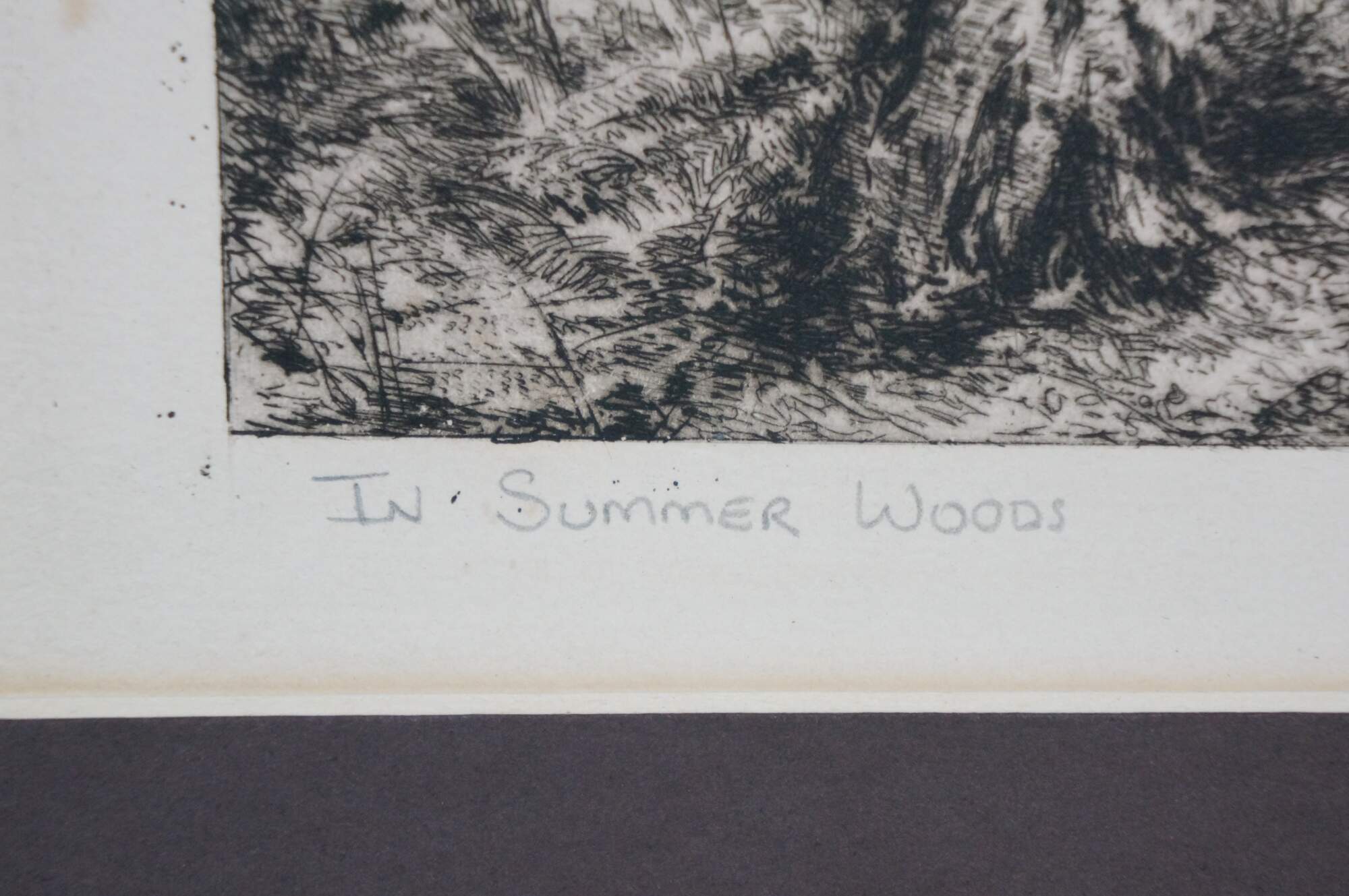 Late 19th century black and white etching titled "In Summer Woods" by Charles Philip Slocombe. Forest landscape. Signed in plate/dated 1881. Pencil marked along lower edge. Paper; dark brown mat; unframed