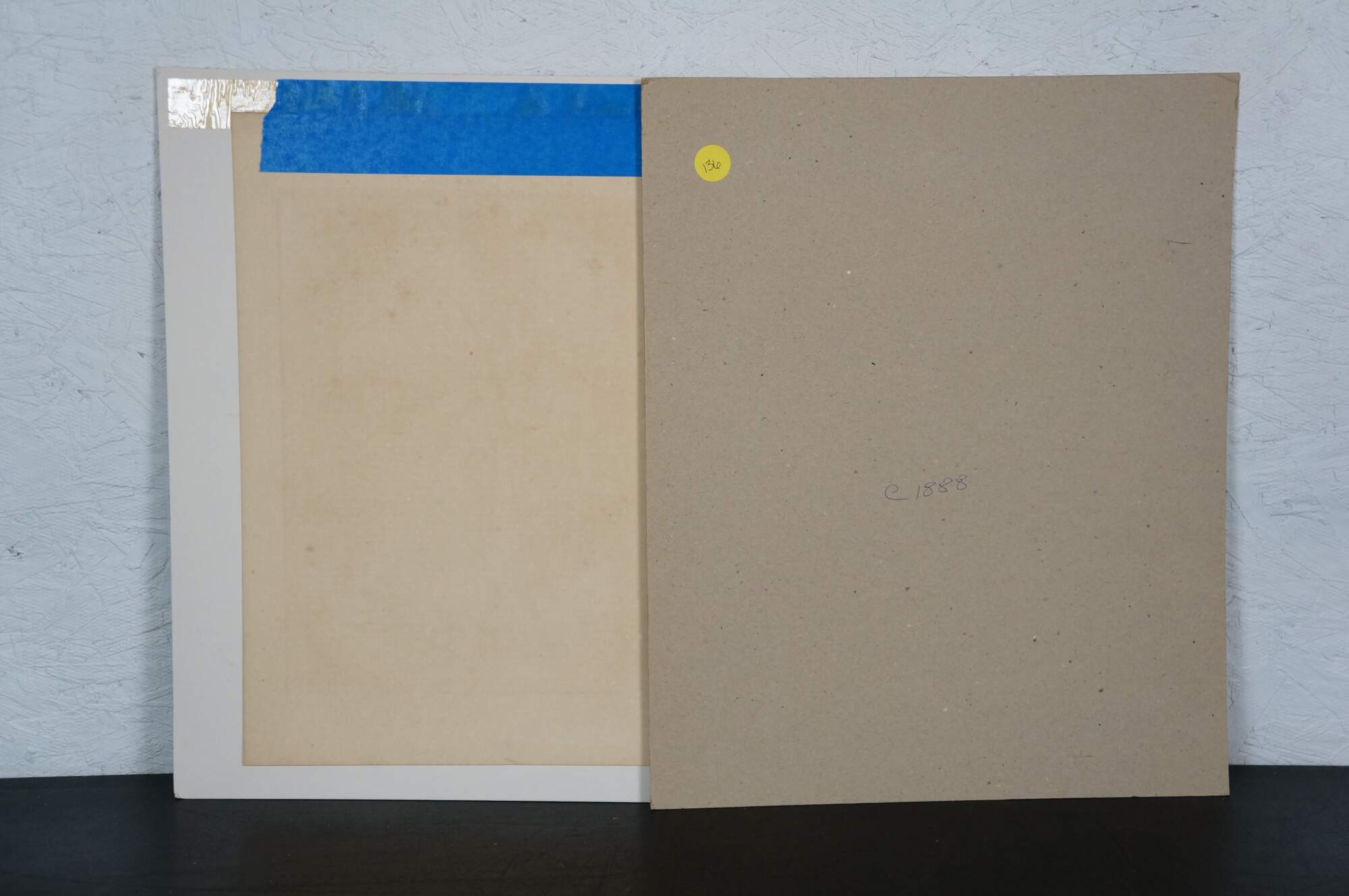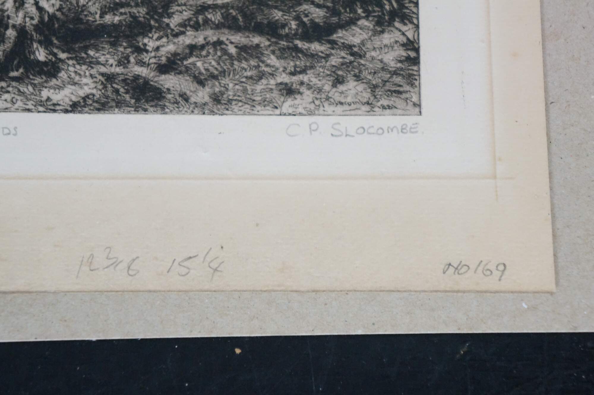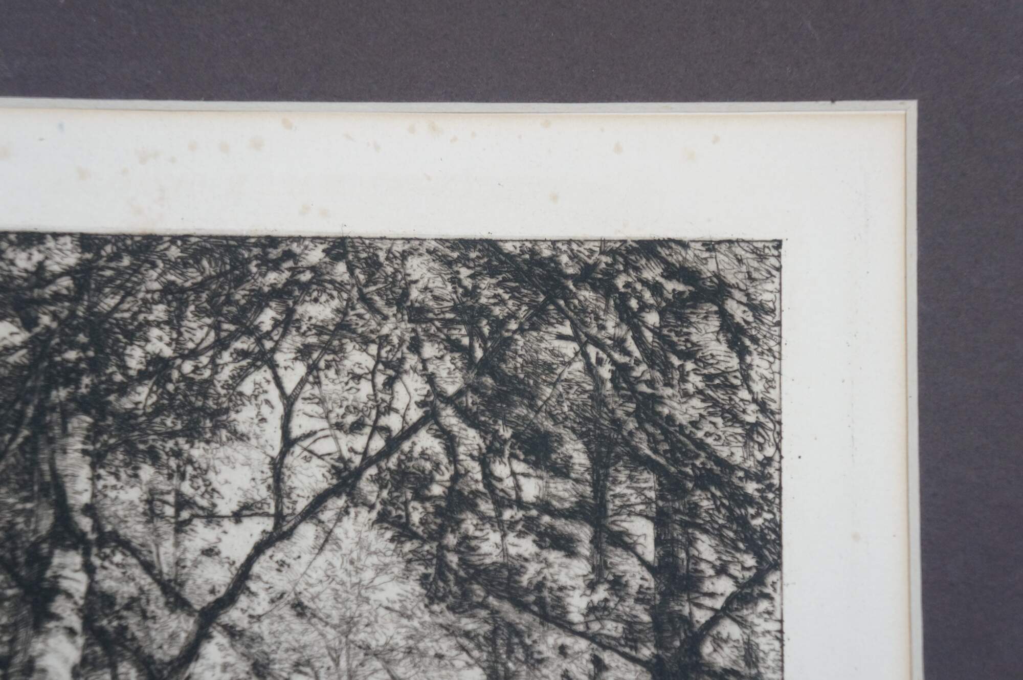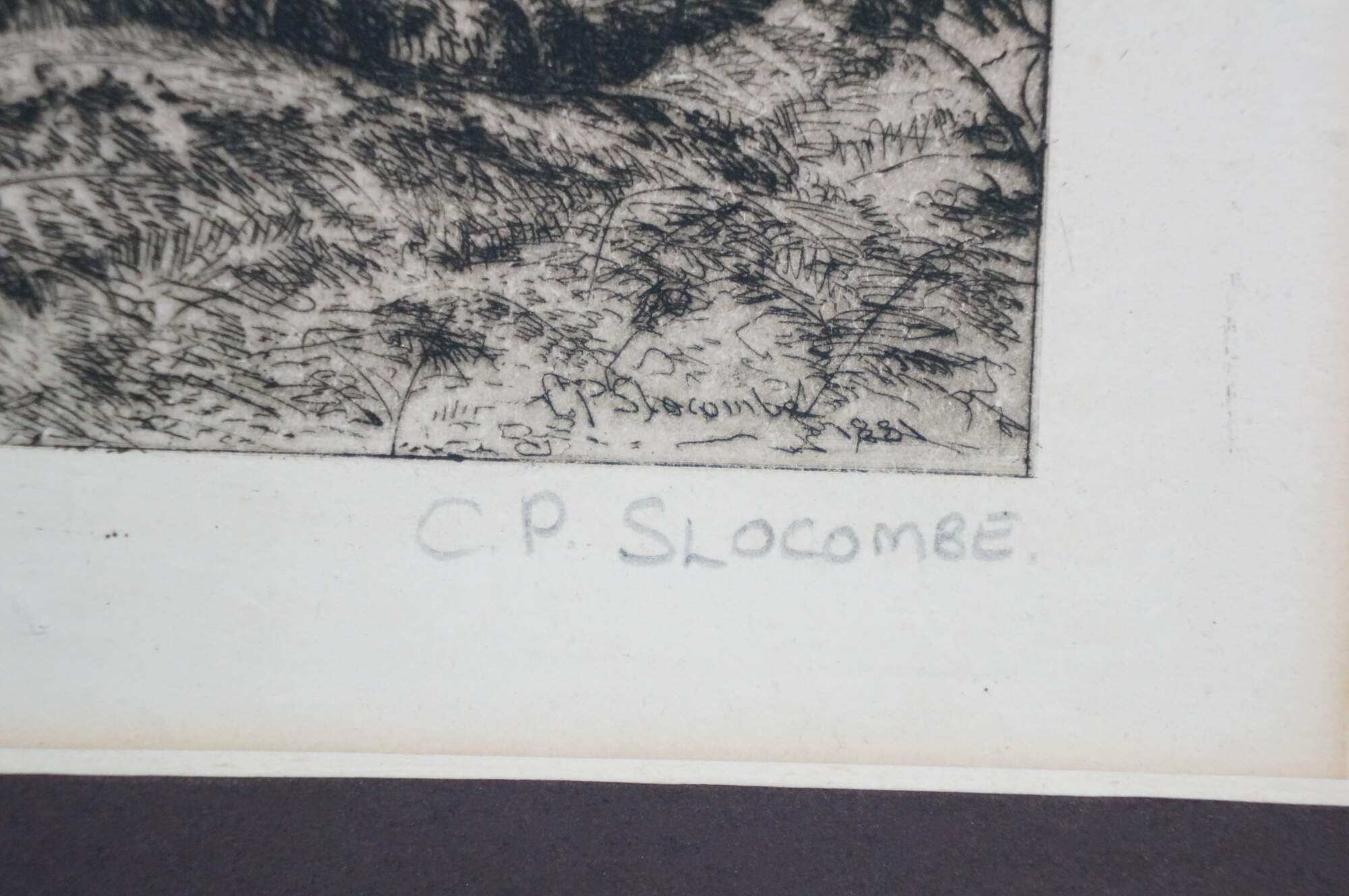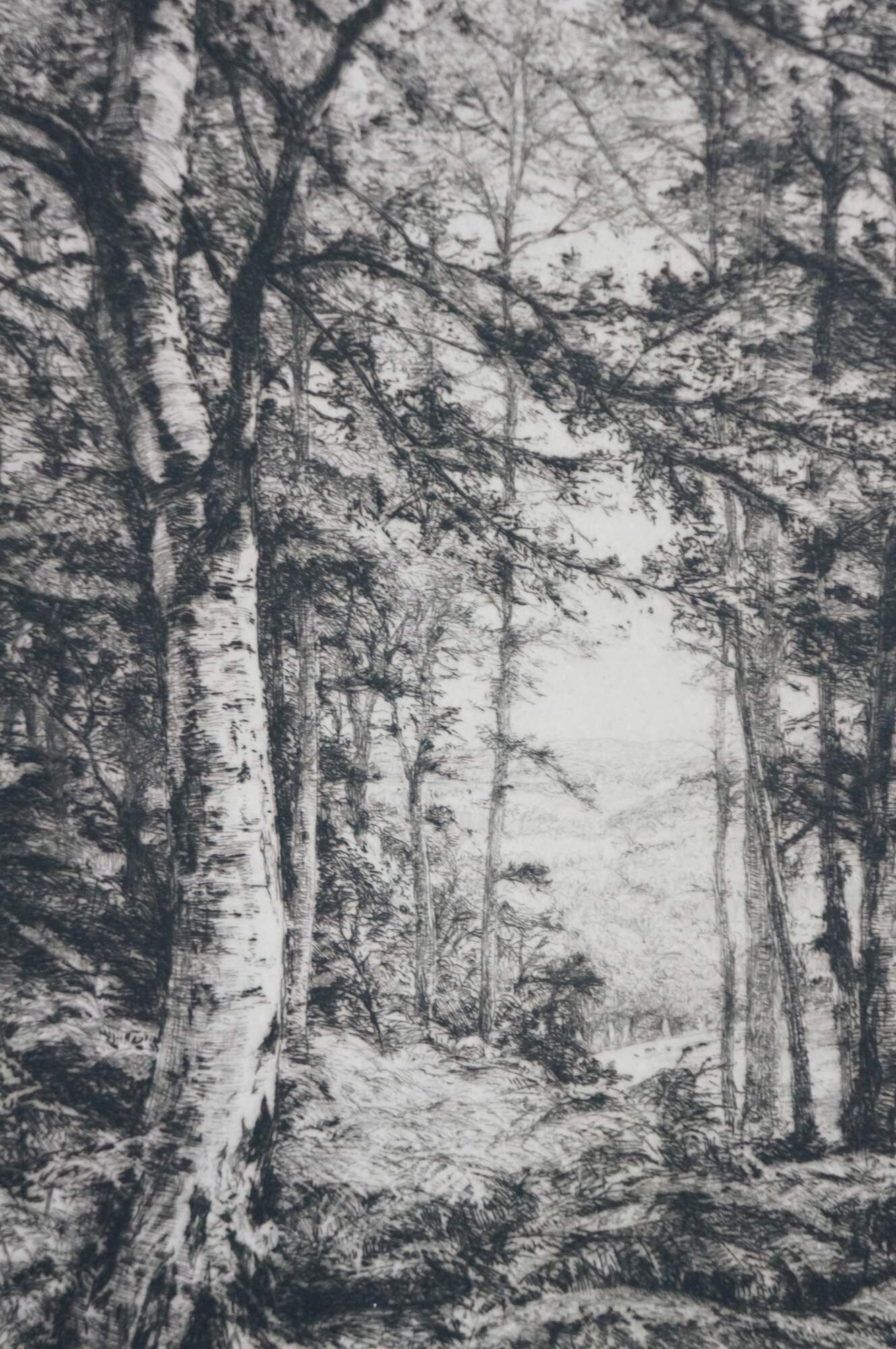 Late 19th century black and white etching titled "In Summer Woods" by Charles Philip Slocombe. Forest landscape. Signed in plate/dated 1881. Pencil marked along lower edge. Paper; dark brown mat; unframed