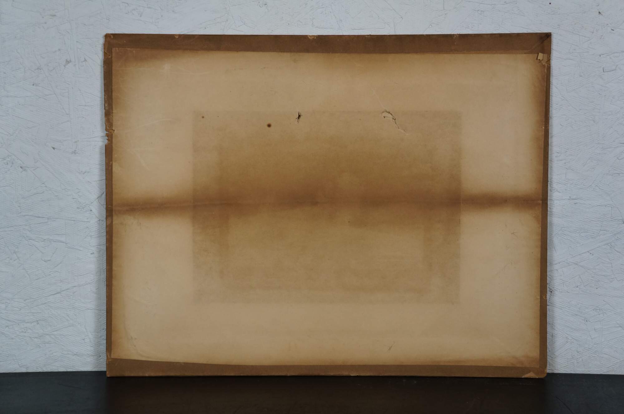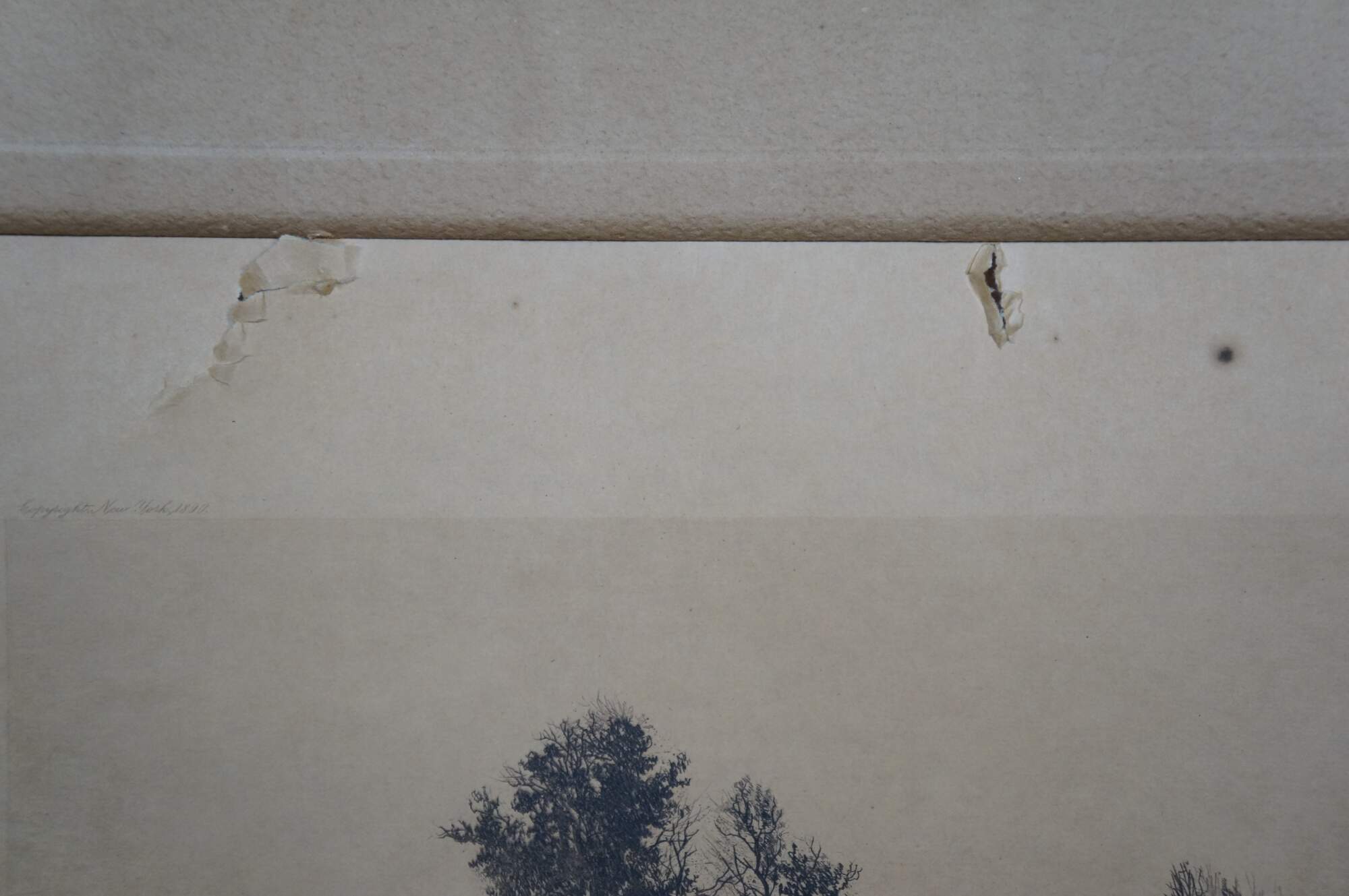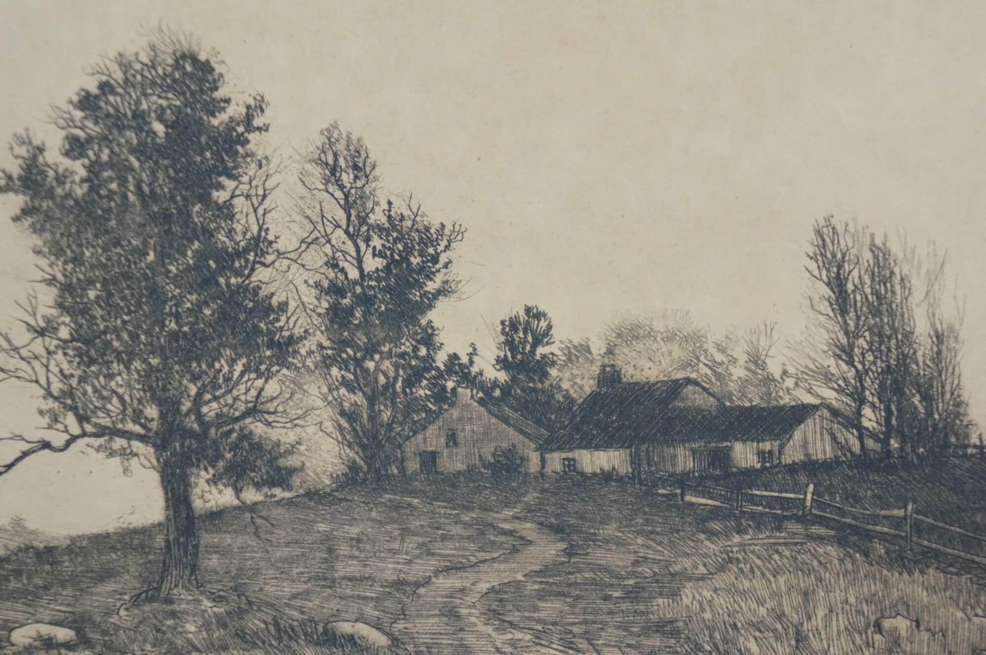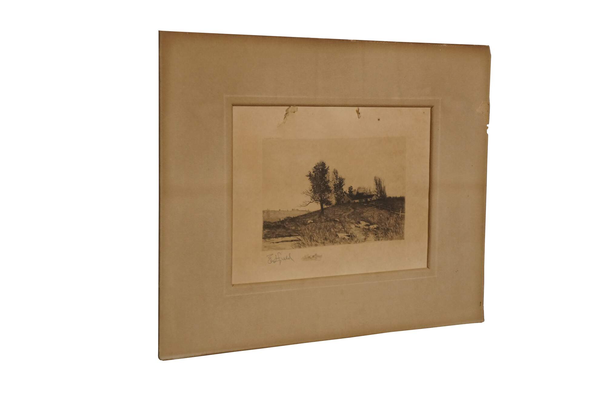 Late 19th century black and white etching of "Hillside" by Nan Lindahl. Country landscape of a house surrounded by trees on a small hill. Copyright New York 1890. Remarke of a smal landscape with houses, lower edge. Pencil signed EL Field, lower left. Paper; mat; unframed.