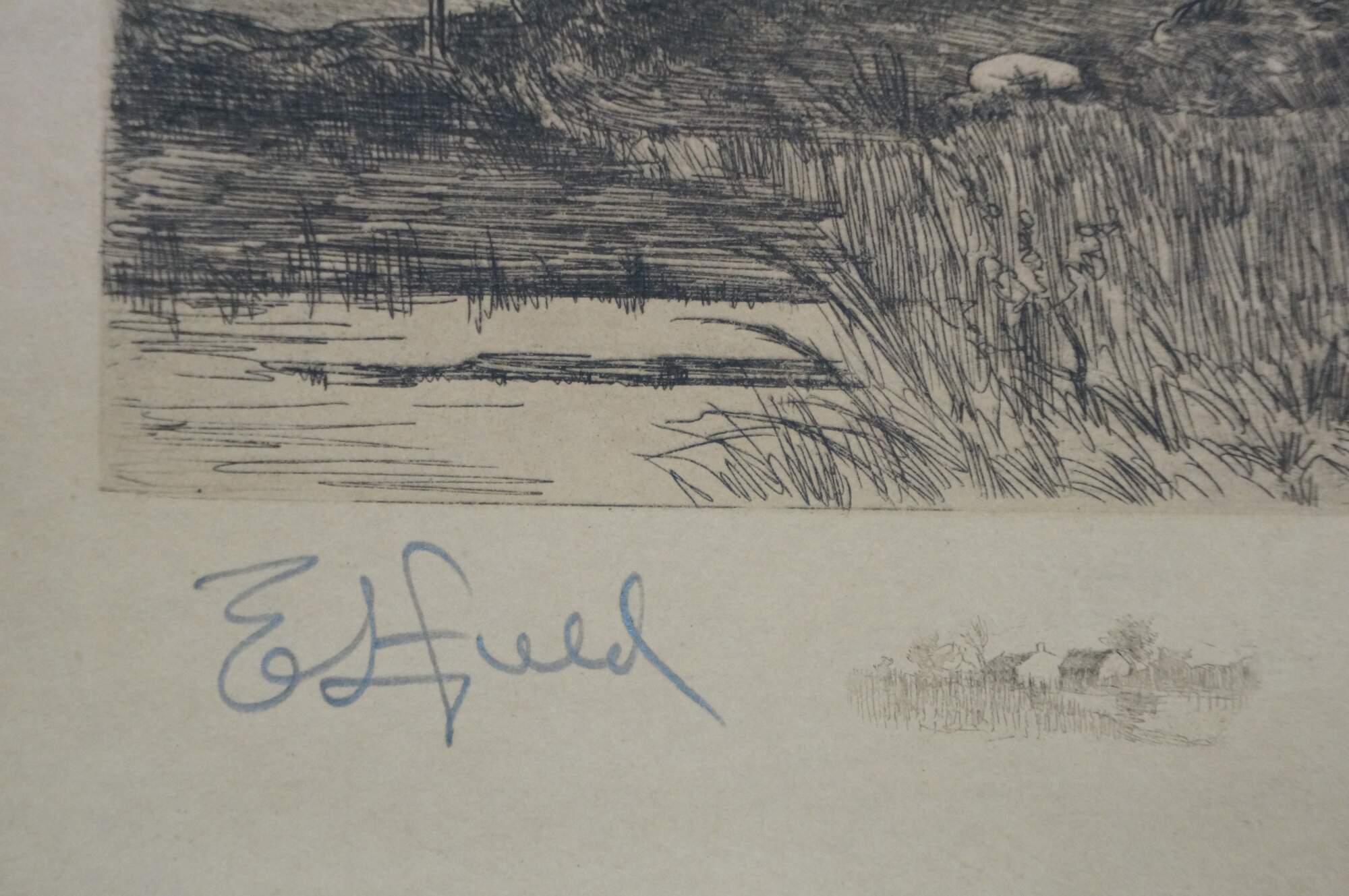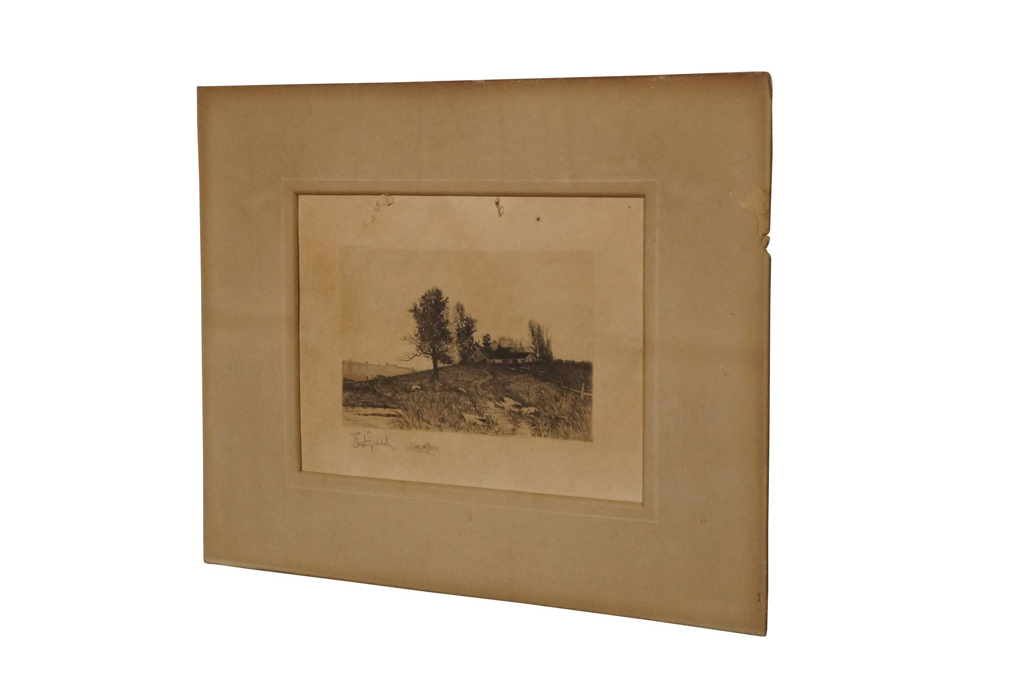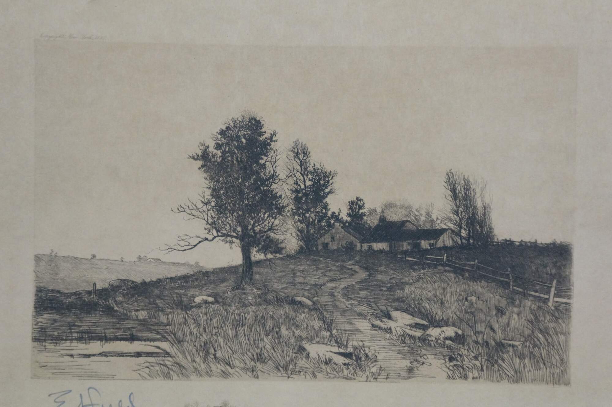 "Edward Loyal Fields (January 4, 1856 – March 22, 1914) (aka E. L. Field ; Edward L. Field ; E. Loyal Field ; Edward Field) was an American artist renowned for his rural landscape drawings and etchings. He utilized various mediums, including pen and ink, oil, watercolor, and graphite, and his primary techniques encompassed drawing, painting, and etching. Fields is especially noted for his idyllic depictions of towns, farmhouses, and landscapes. Edward Loyal Fields was born on January 4, 1856, in Galesburg, Knox, Illinois, to Loyal Case Field, a machinist, inventor, and manufacturer of machinery, and Clara Armeda (Davison) Field, a housewife. He grew up with three siblings—Frank Smith Field, Kate Elnora Field, and Carrie Luella Field—though the latter two sadly died in infancy. Fields spent the first part of his life in the Midwest, residing in Galesburg from 1856 to 1874, and briefly in 1880. In 1874, he relocated to Ithaca, New York, where he began studying at Cornell University. His formal art education started here and continued until 1878. Following this, Fields moved to Paris, France, to study at the esteemed Academie Julian under Charles Auguste Carolus Emile Duran, from 1878 to 1879. Duran’s influence was significant in shaping Fields’s artistic style and approach. Fields began to identify as a professional artist by 1880. His work, characterized by detailed rural landscape drawings and etchings, was recognized across the Midwest, East Coast, and Europe. Fields moved between various locations throughout his career. He resided in Paris from 1879 to 1882, in New York from 1885 to 1900, and again from 1905 to 1914, as well as in Delaware, New York from 1900 to 1905. Brief periods were also spent in Boston, Halifax, London, Nutley, and Delaware. Throughout his career, Fields exhibited his work with prestigious art establishments, including the Salmagundi in New York, National Academy of Design in New York, Pennsylvania Academy of the Fine Arts in Philadelphia, Carnegie in Pittsburgh, and Chicago Art Institute. Fields was a resident artist member at Salmagundi from 1899 until his death in 1914, where his work was highly praised, winning the Inness prize in 1904 and the Shaw prize in 1905. Fields married Flora (Stark) Field on November 9, 1891, in Bloomsbury, England. They had one daughter, Catherine Field, who was born in Nutley, New Jersey, in 1892. Fields died on March 22, 1914, in New York, New York, from pneumonia. He was 58 years old. His legacy continues to influence and inspire artists and art enthusiasts worldwide, serving as a testament to his exceptional talent and passion for rural landscape artistry." (Source: Salmagundi)