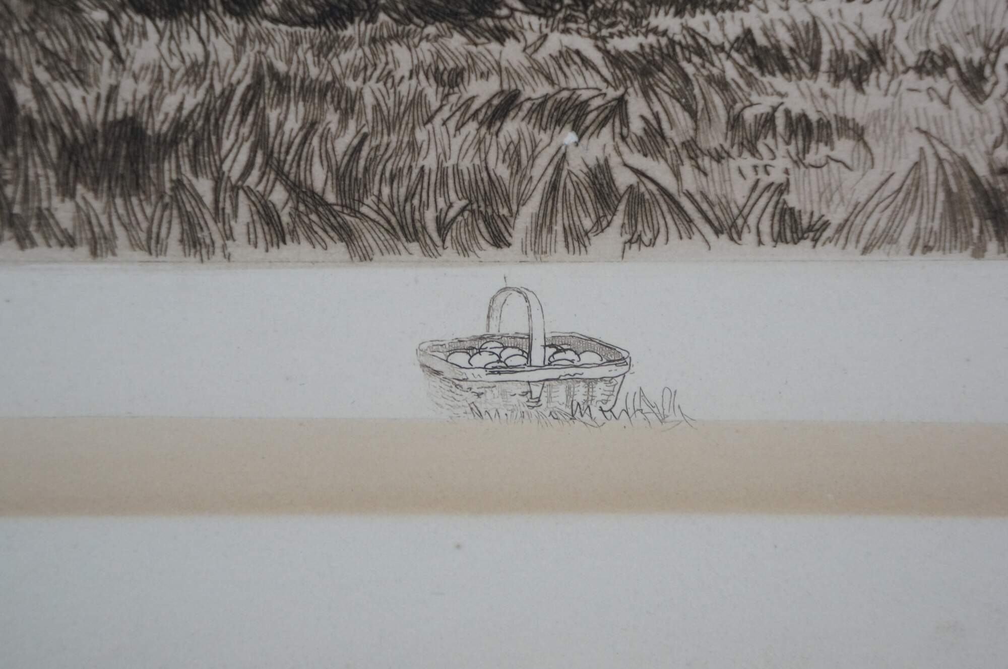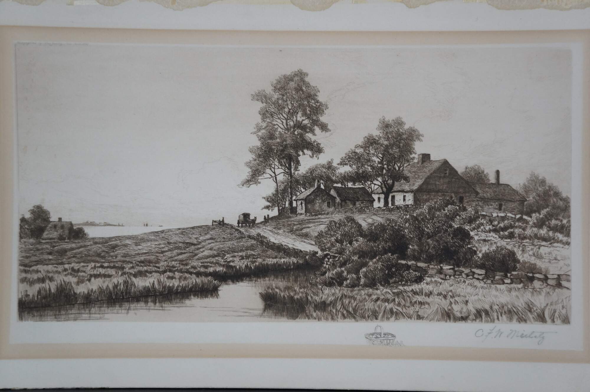 Late 19th century black and white etching titled "In Sight of the Sea" by Charles Frederick Mielatz. Coastal country landscape featuring a horse and buggy beside a thatched cottage overlooking the sea. Pencil signed, lower right. Remarke of a basket of fruit, lower edge. Signed in plate/dated 80, lower right. Copyrighted by Max Jacoby, New York 1890. Paper mounted on cardboard; unframed.