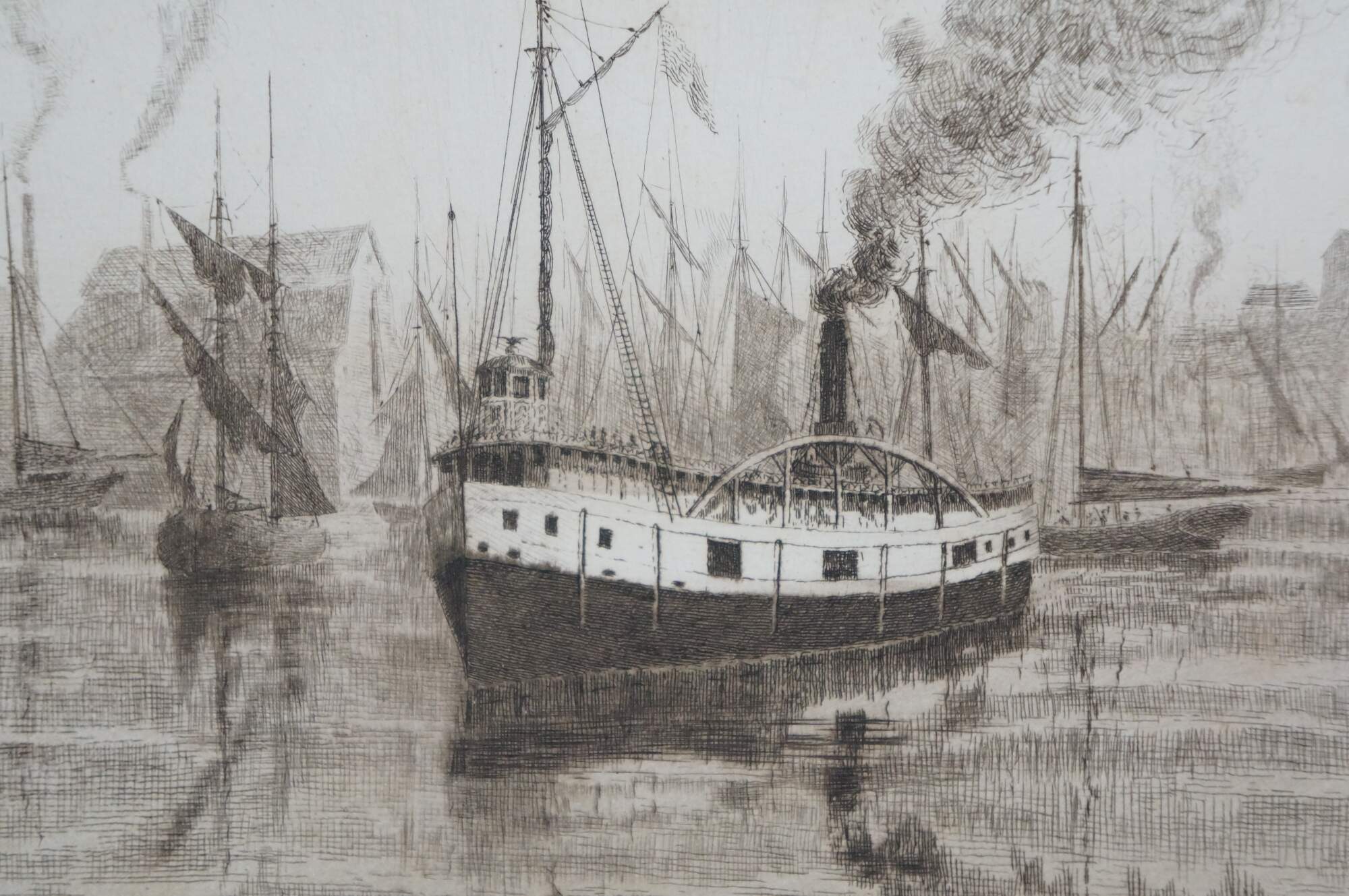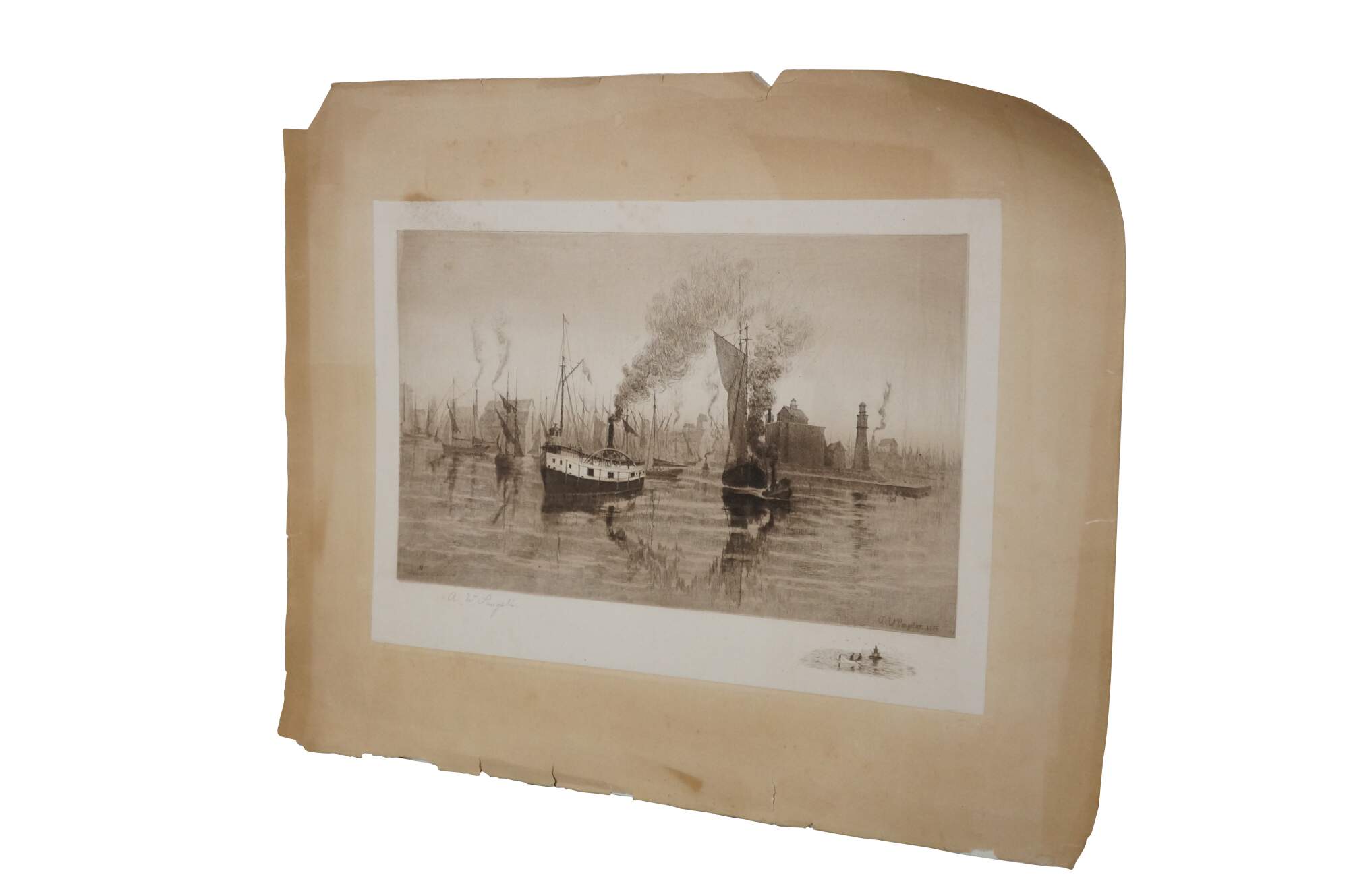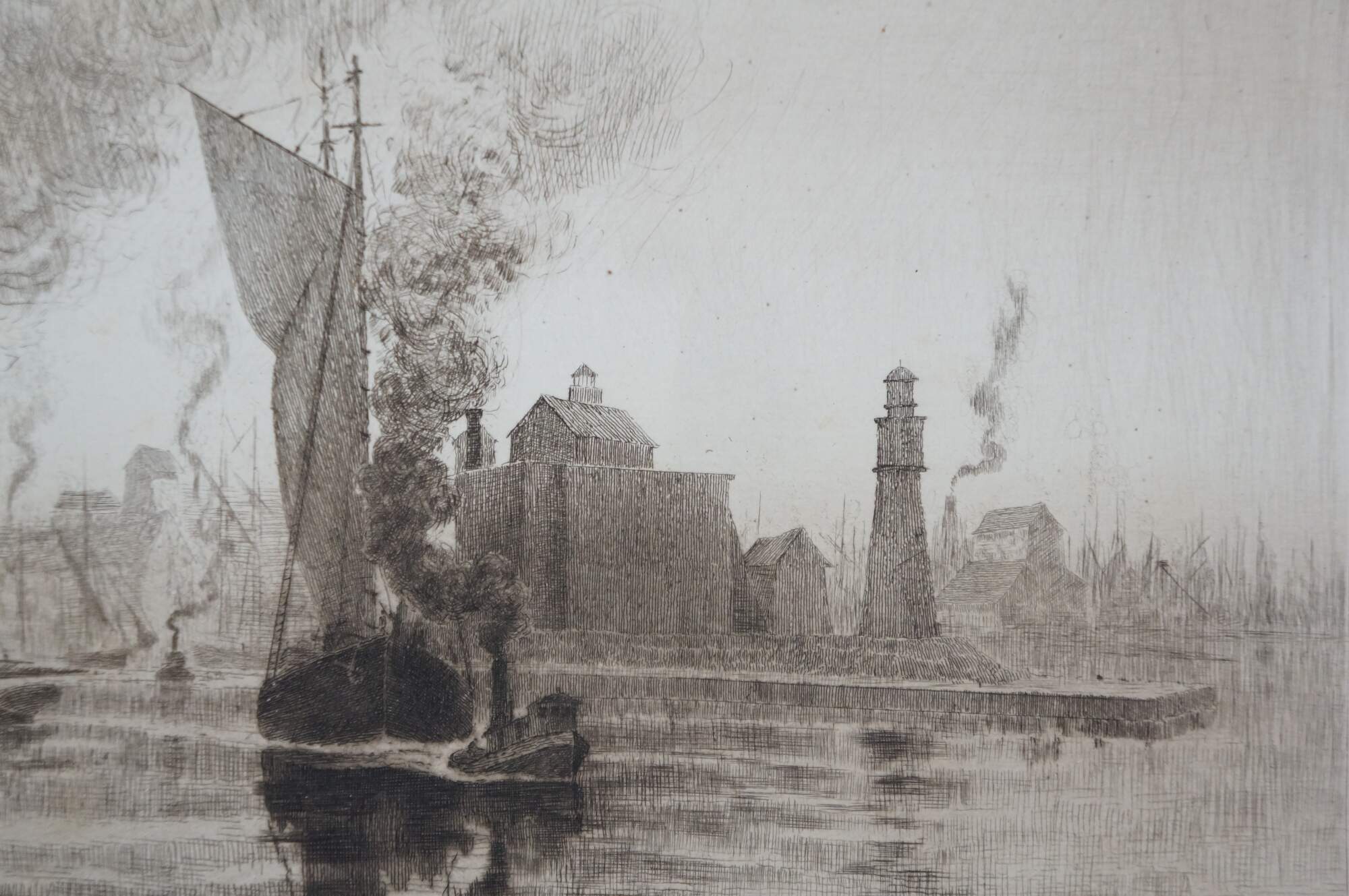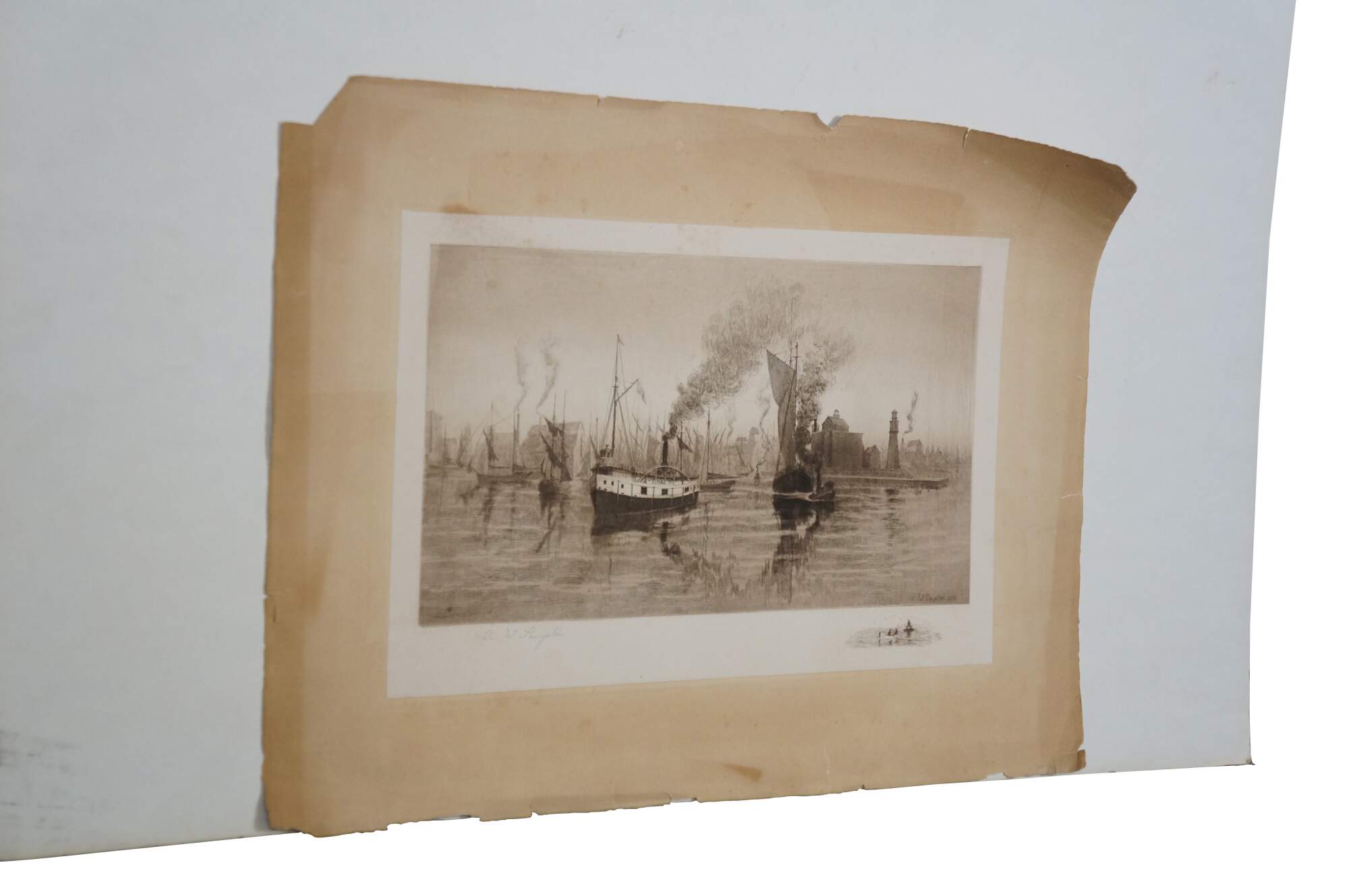 Late 19th century black and white nautical seascape sailboat / boats etching of Buffalo Harbor by Amos W. Sangster, taken from the folio "Niagra River and Falls - From Lake Erie to Lake Ontario." Copyright 1886. Pencil signed, lower left. Remarke of a rowboat by a bouy, lower edge. Signed in plate/dated 1886. Heavy paper; unframed.