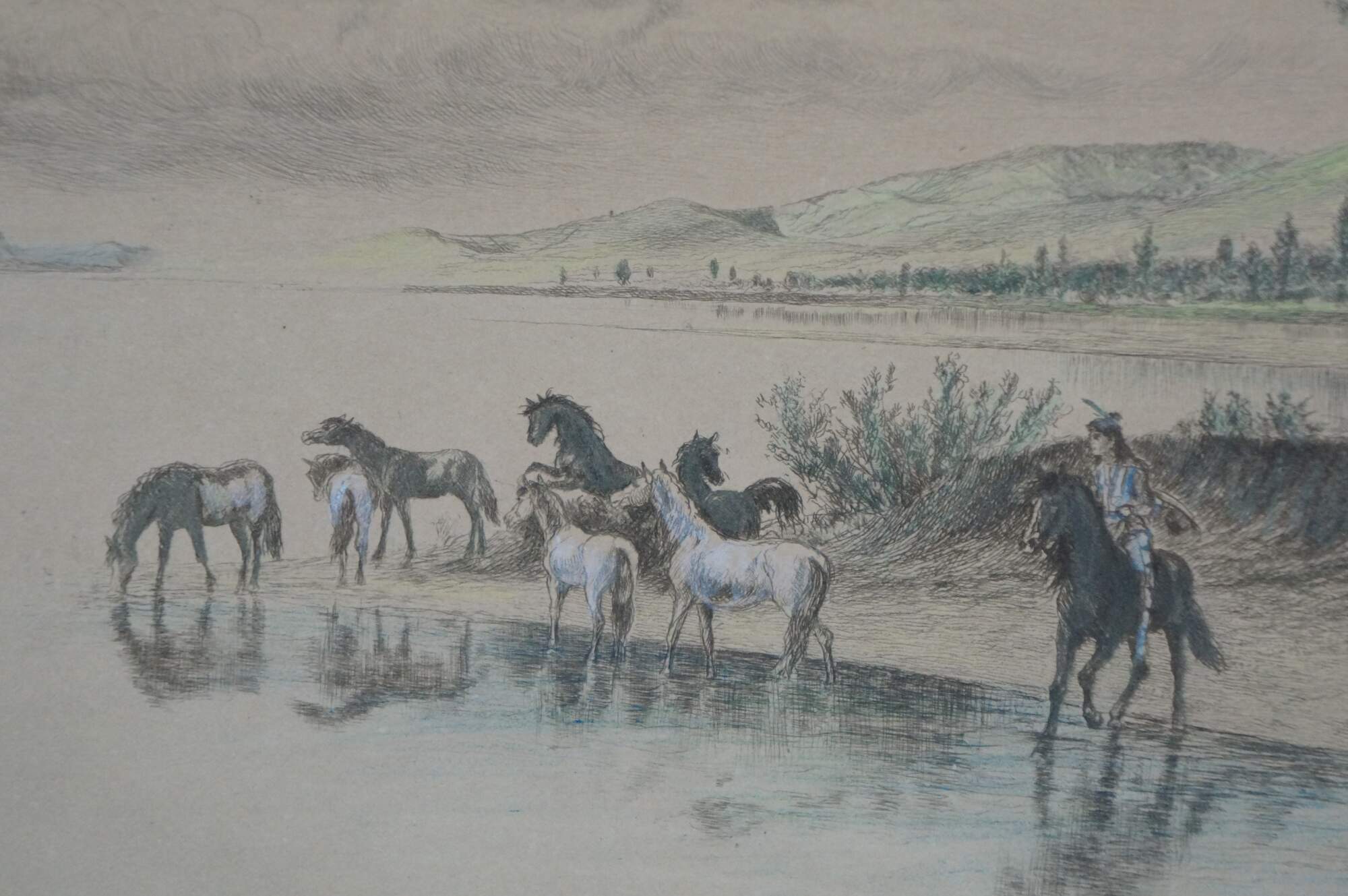 Late 19th century hand colored etching titled "On the Upper Missouri" by William de la Montagne Cary. Panoramic landscape across the Missouri River featuring a Native American village on one side and a figure with a herd of horses on the other. Signed / titled in plate, lower left & lower edge. Paper on cardboard; unframed.
