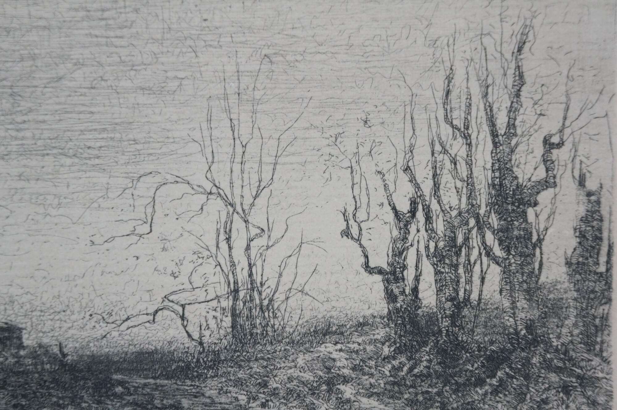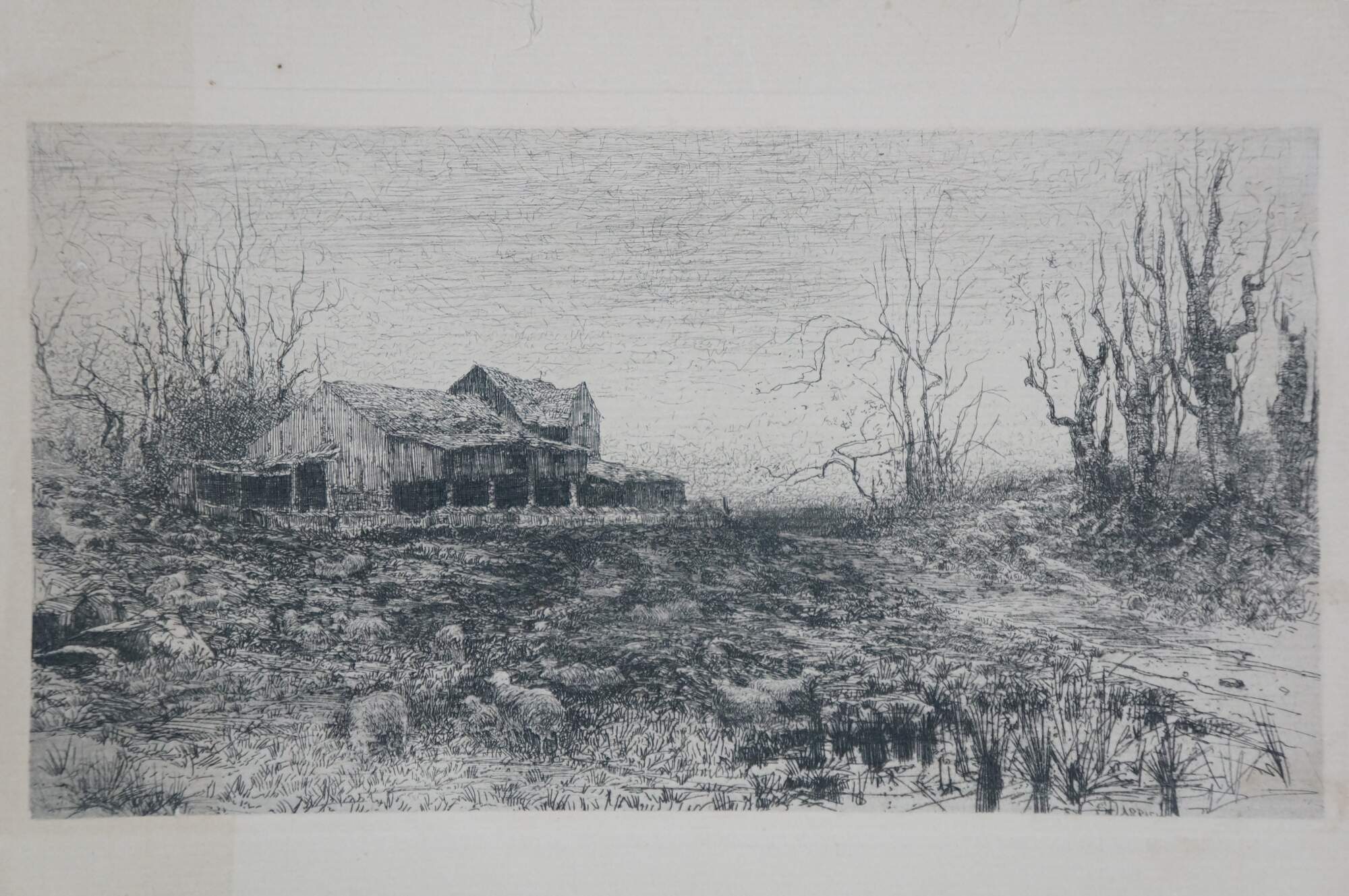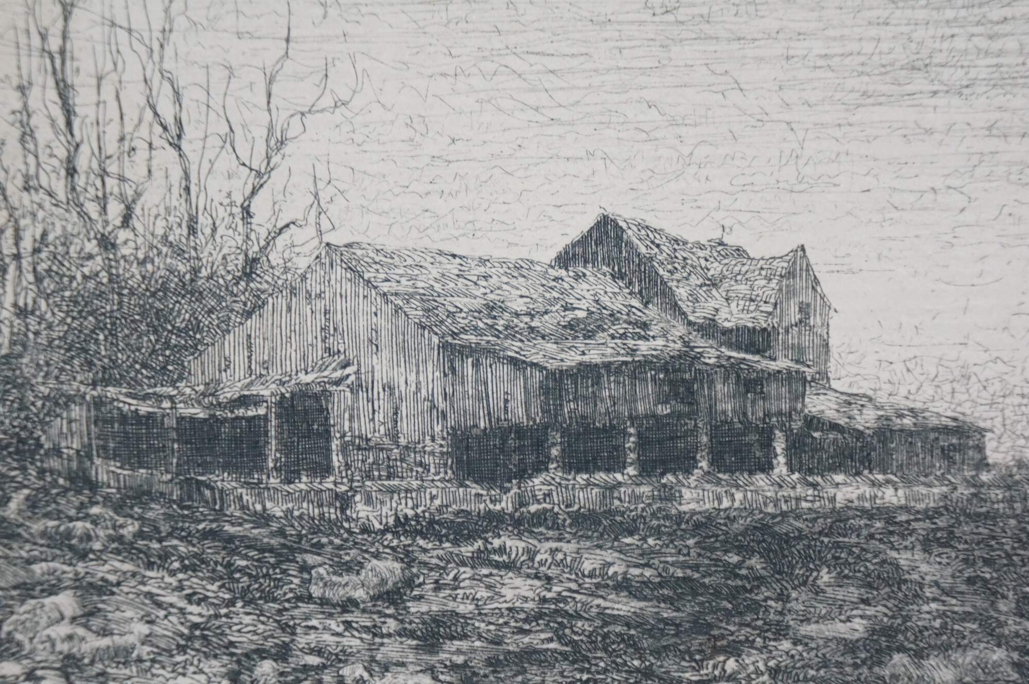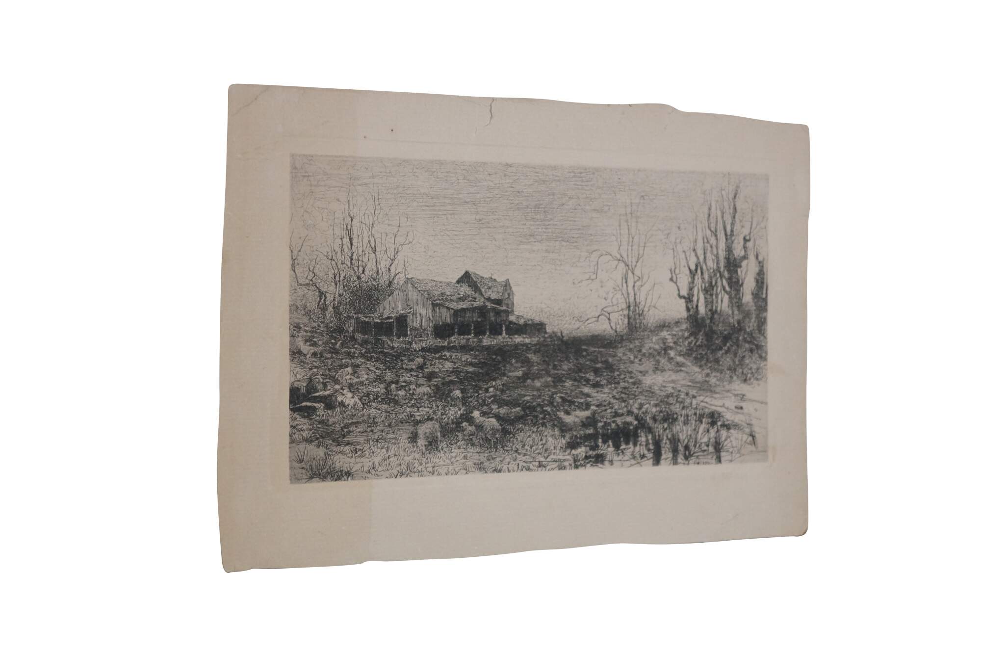 Late 19th century black and white etching titled "November" by Stephen Parrish. Country landscape of a farm in winter. Signed in plate, lower right. Paper; unframed.