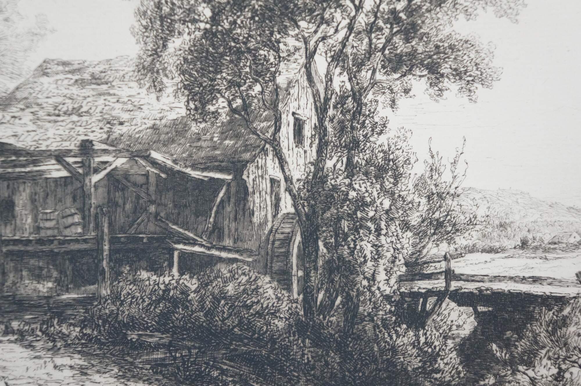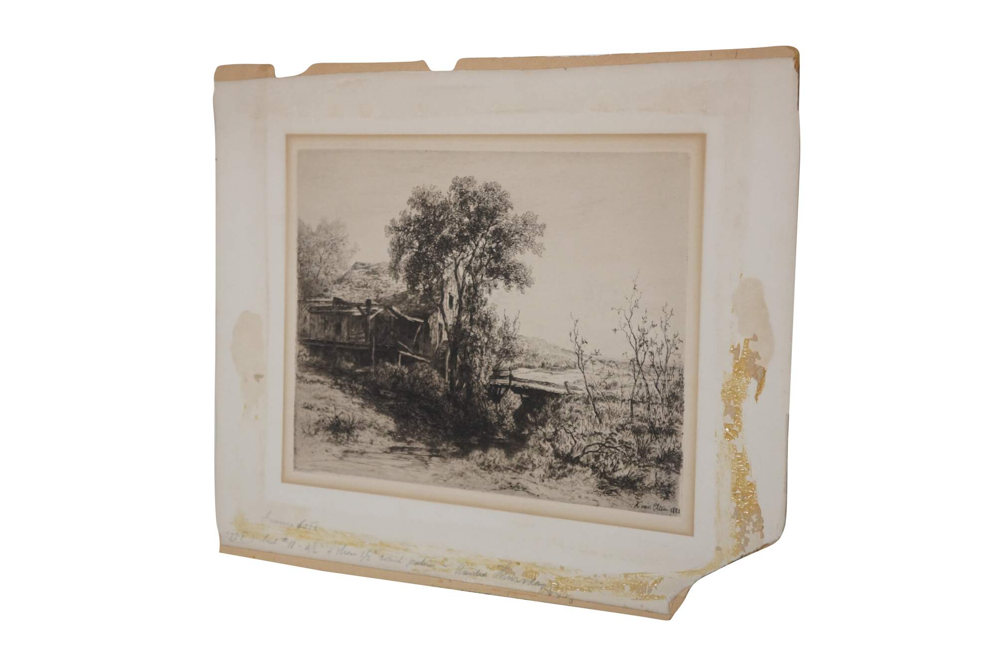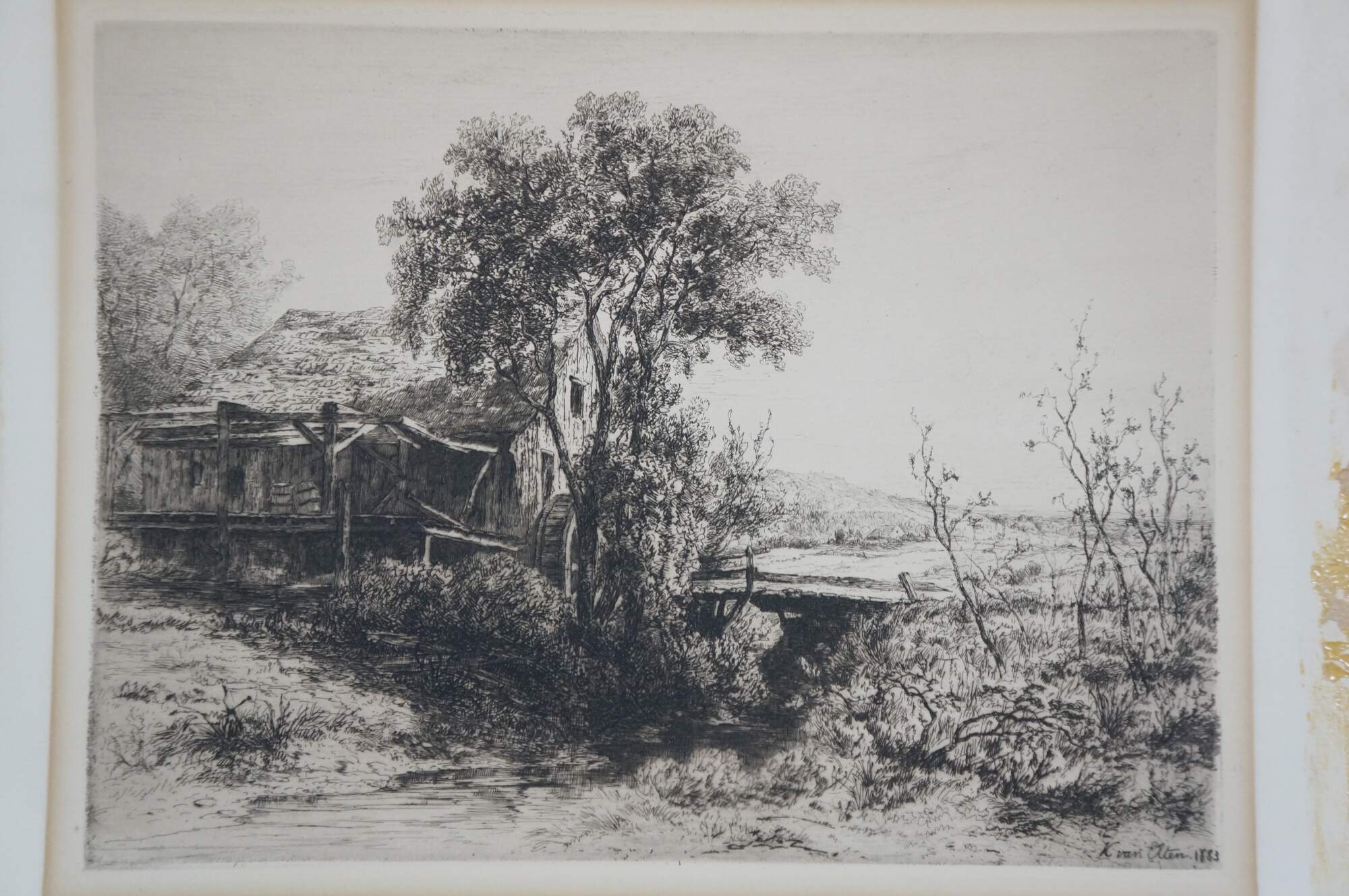 Late 19th century book plate etching from the 1883 folio "Original Etchings by American Artists," titled "The Deserted Mill" by Kruseman van Elten. Country landscape focused on an old water mill. Signed in plate/dated 1883, lower right. Paper mounted on cardboard; unframed.