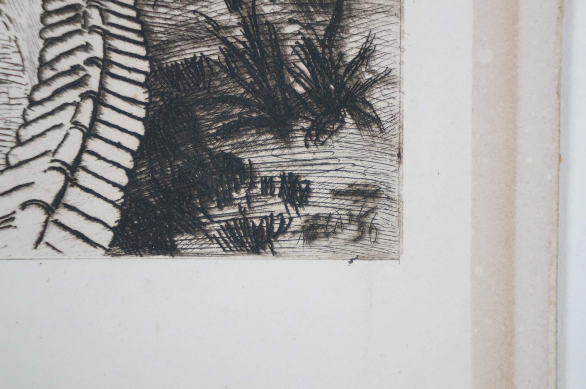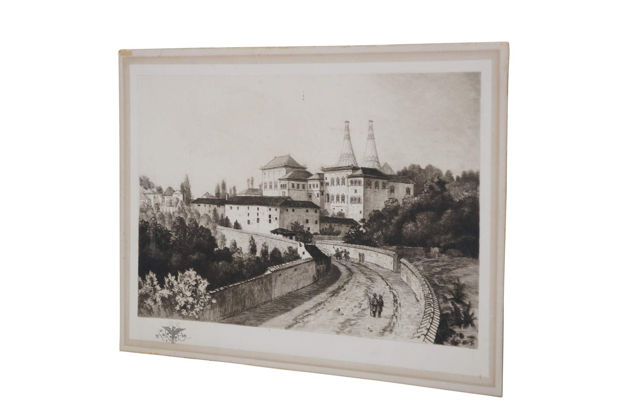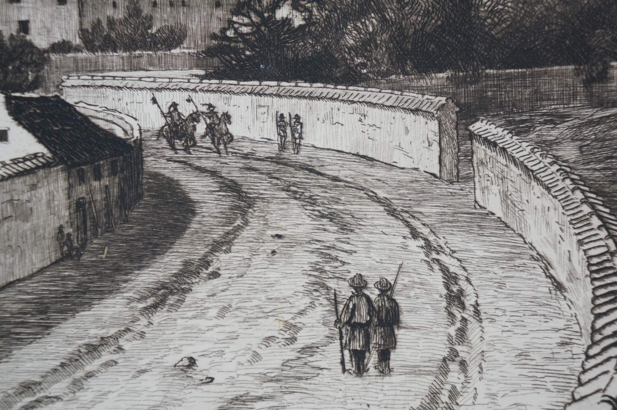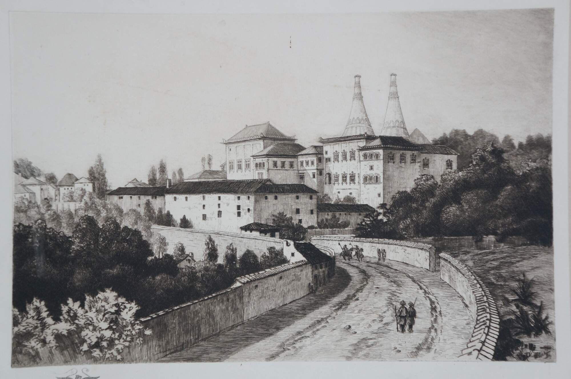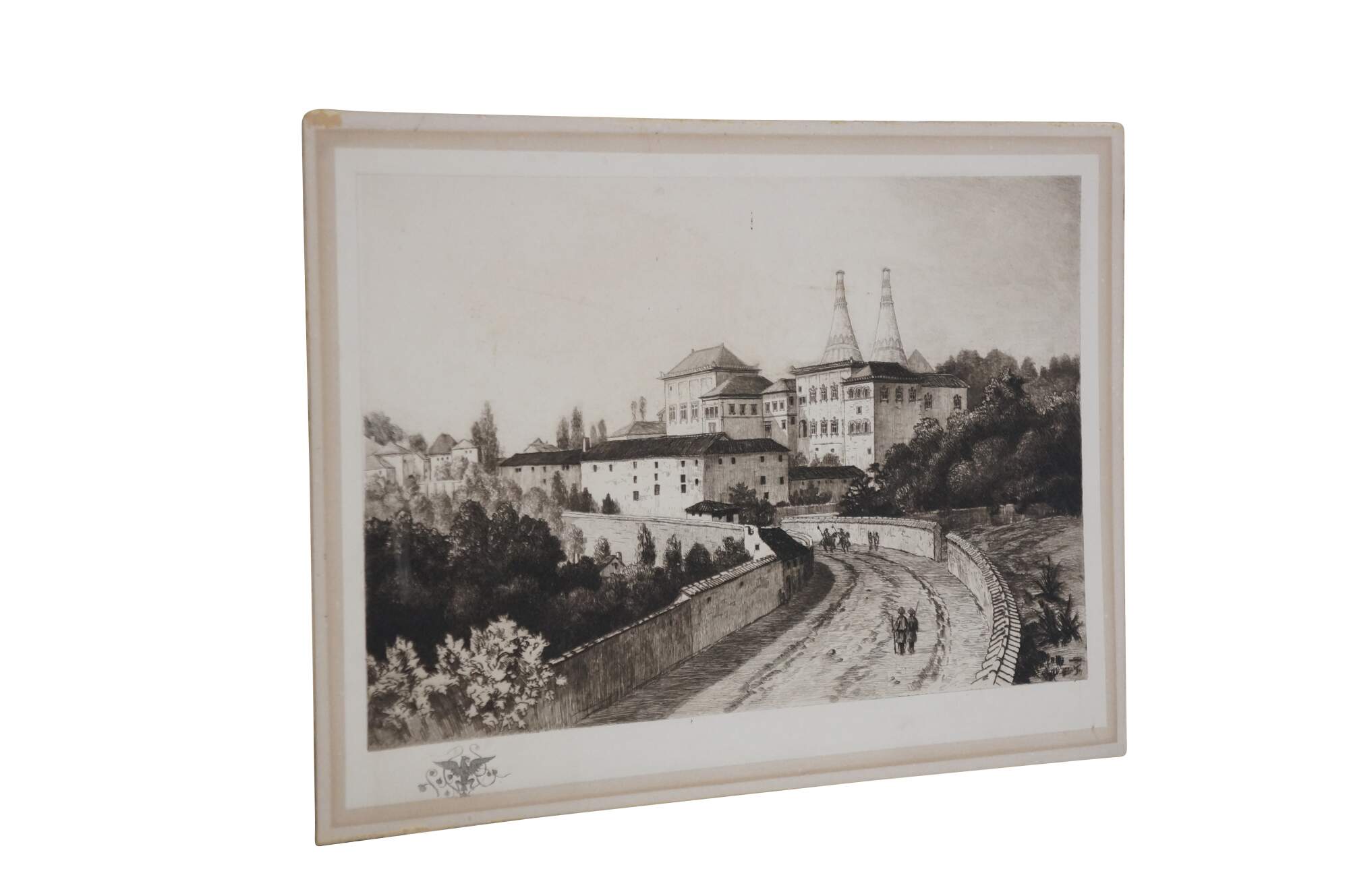 Late 19th century black and white etching titled "On the Bridge" by Charles Frederick Mielatz depicting Portugal's National Palace of Sintra / Cintra. The palace's distinctive white fortress walls and cone shaped towers are view from above the road, crossed with walking and riding soldiers holding large spears. Remarke of coat of arms style eagle, lower edge. Signed in plate/dated 96, lower right. Paper mounted on cardboard; unframed.