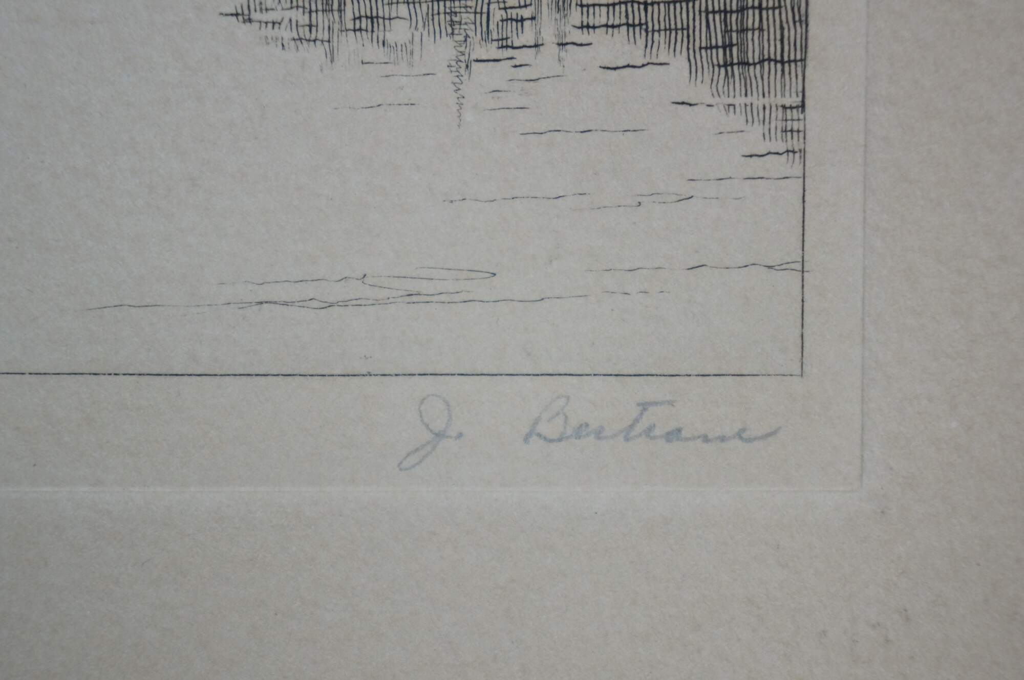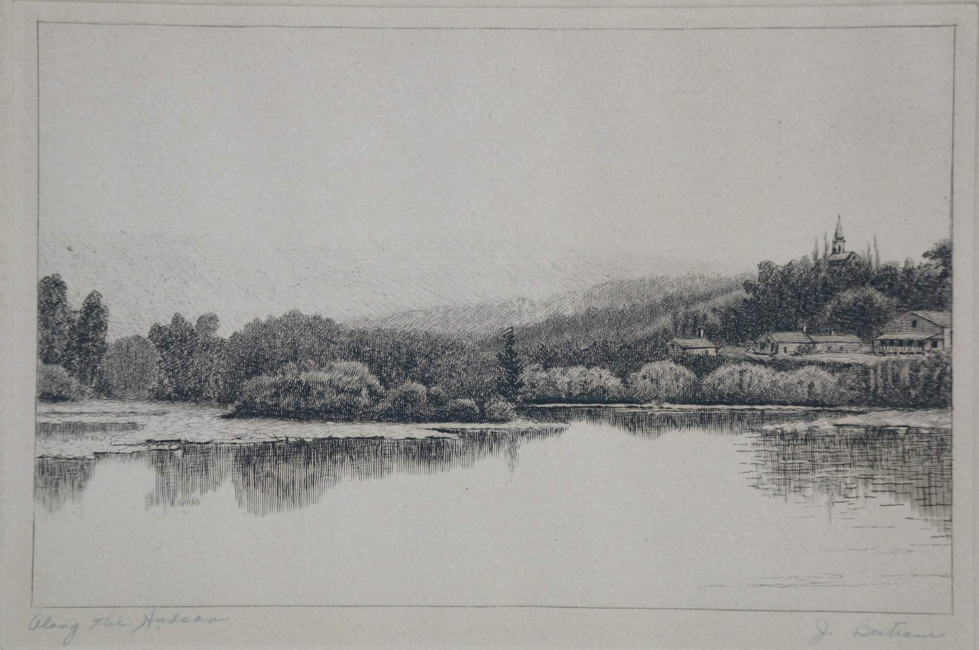 Late 19th to early 20th century black and white etching titled "Along the Hudson" by J. Bertram. A wide riverscape / landscape of a town in the hills above the Hudson River. Pencil signed / titled along lower edge. Paper; unframed.
