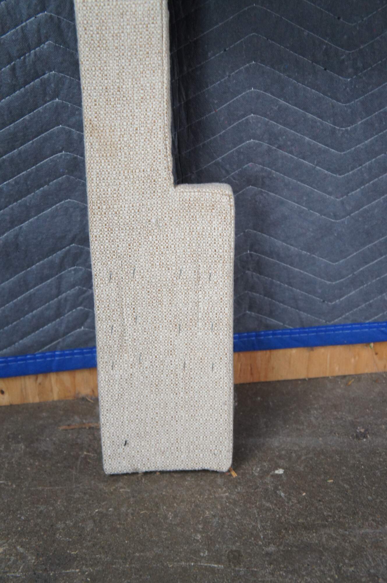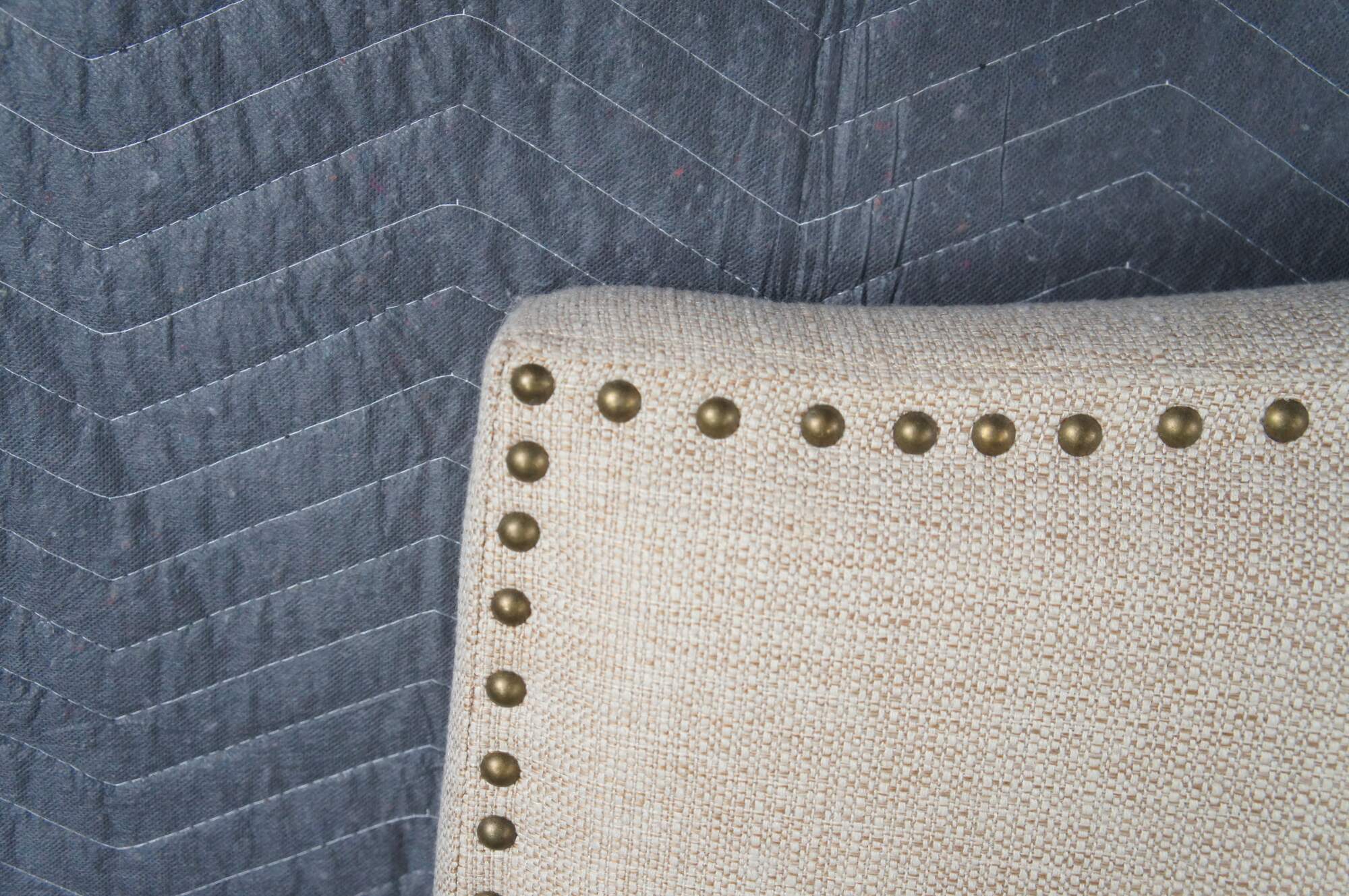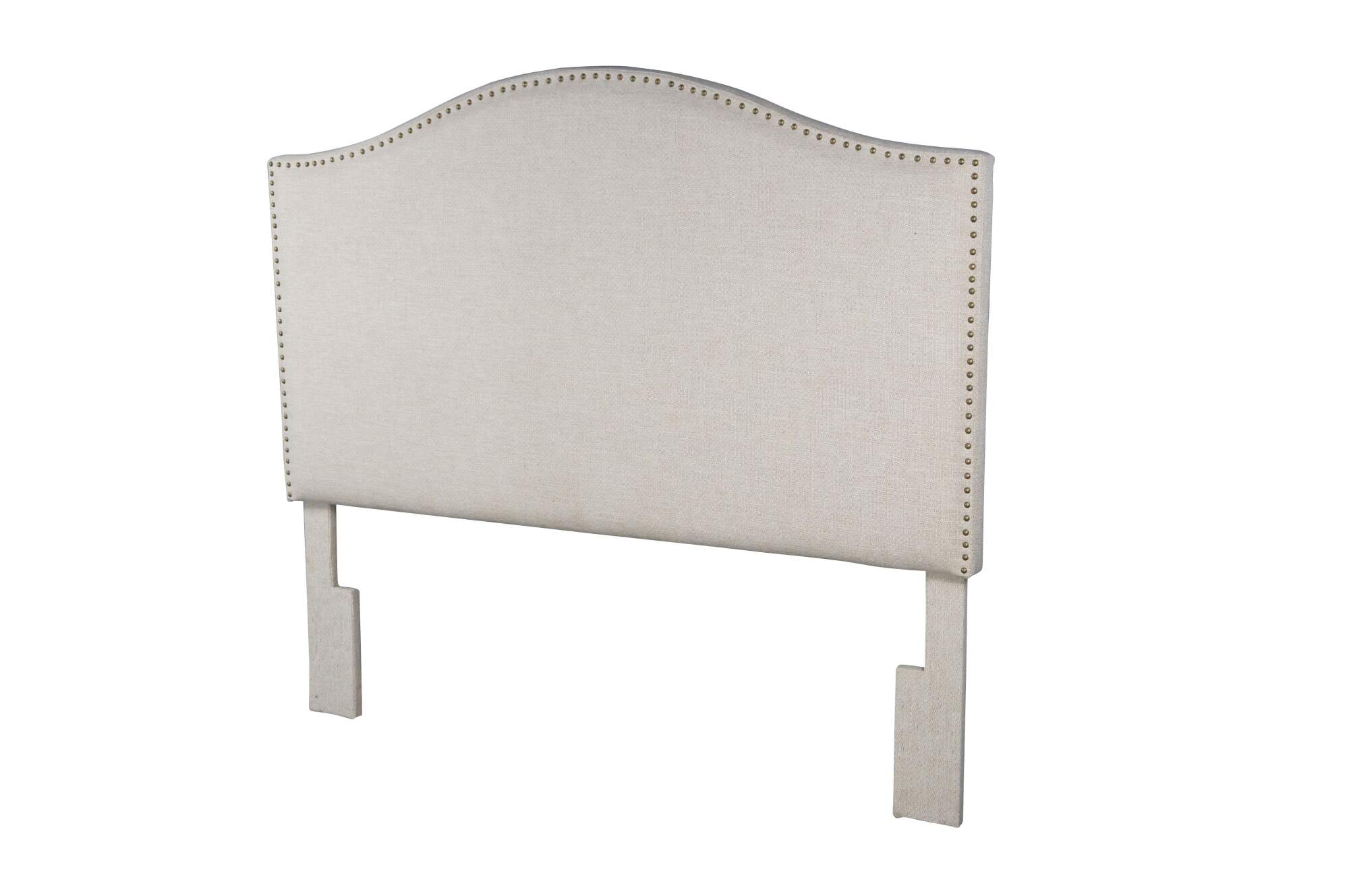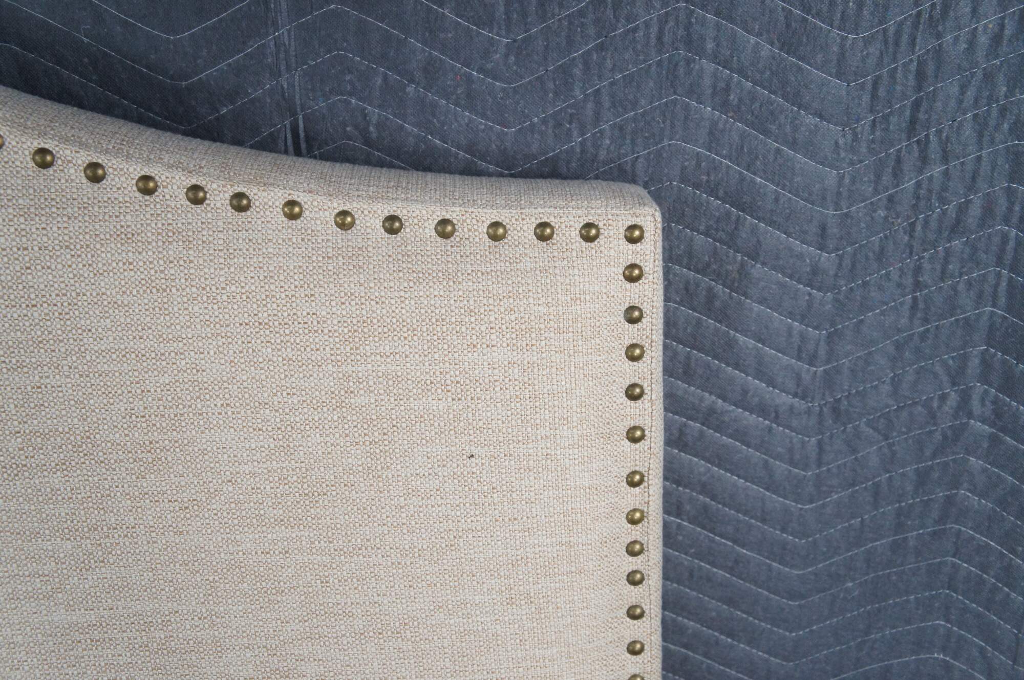 A modern upholstered camelback full size bed. Features nailhead trim. The bed has two settings and looks like it can be used with a double or a twin.