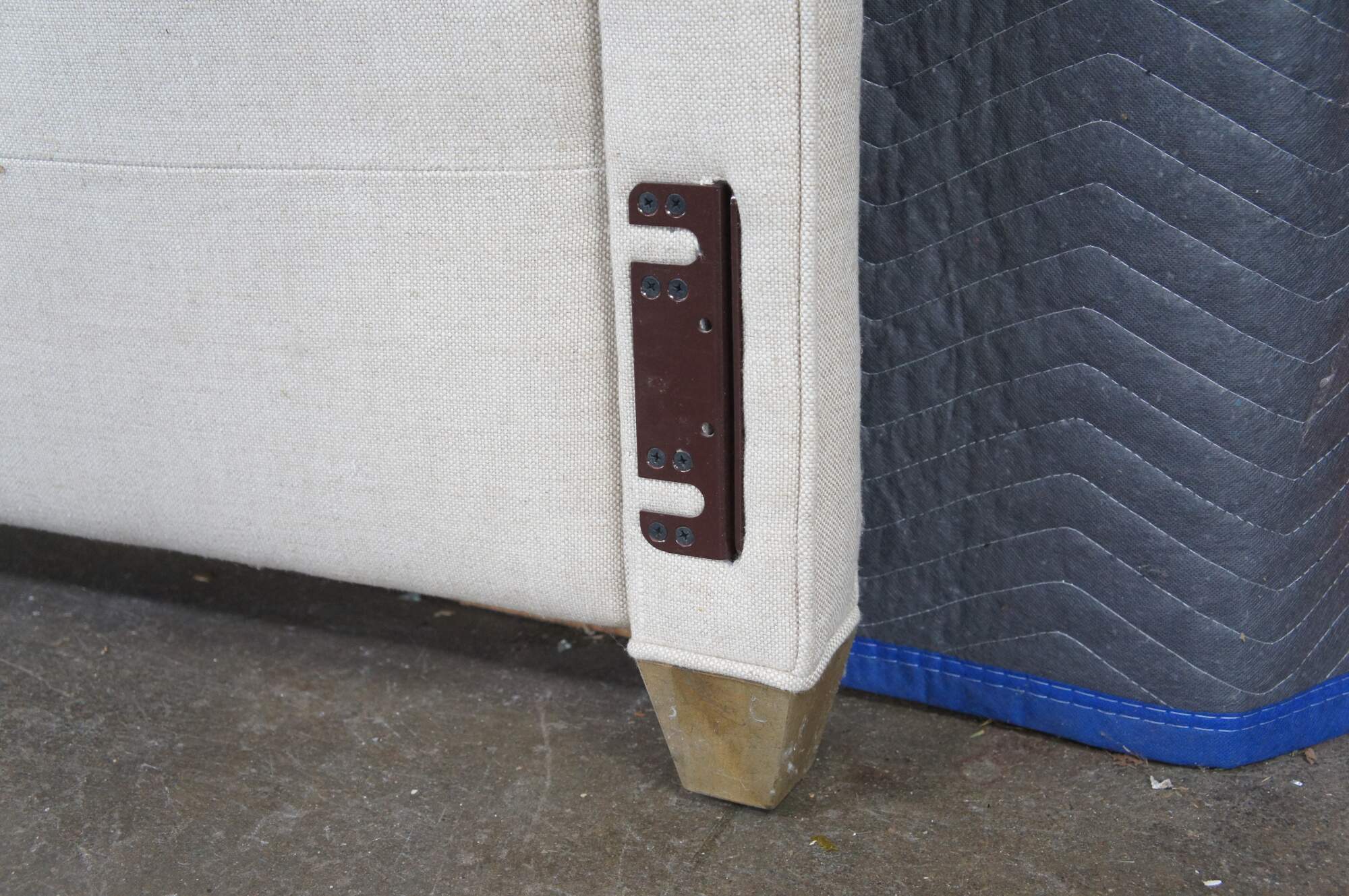 Restoration Hardware Wallace Upholstered Modern King Size Headboard. Circa 2015. Upholstered in linen with nailhead trim and wood tapered feet.