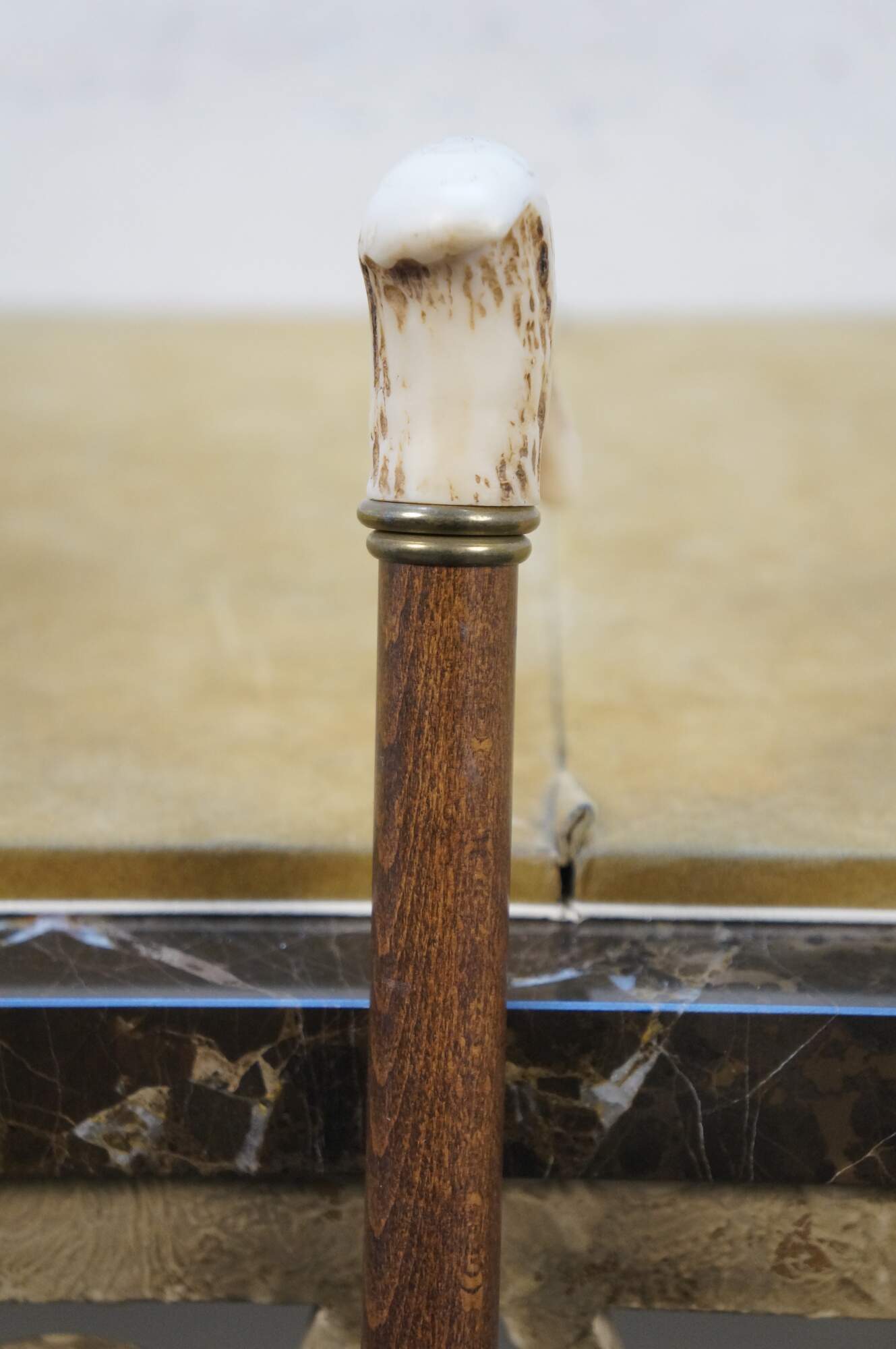 Vintage oak wood walking stick / cane with brass ferrule and collar, topped with a naturally curved L shaped stag horn / antler handle, etched along the top with the image of a Scottish thistle.