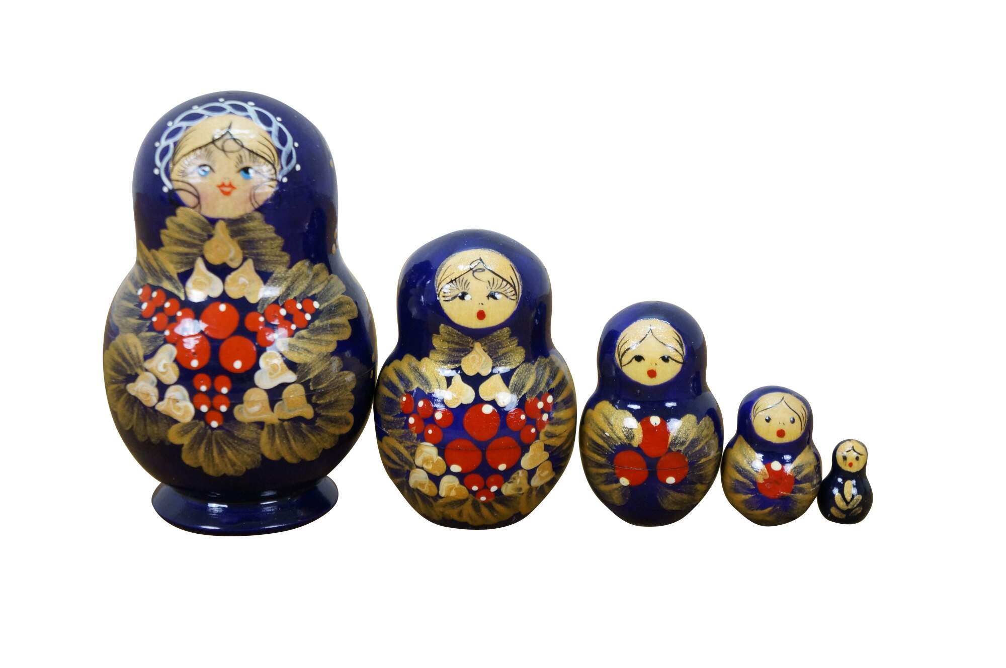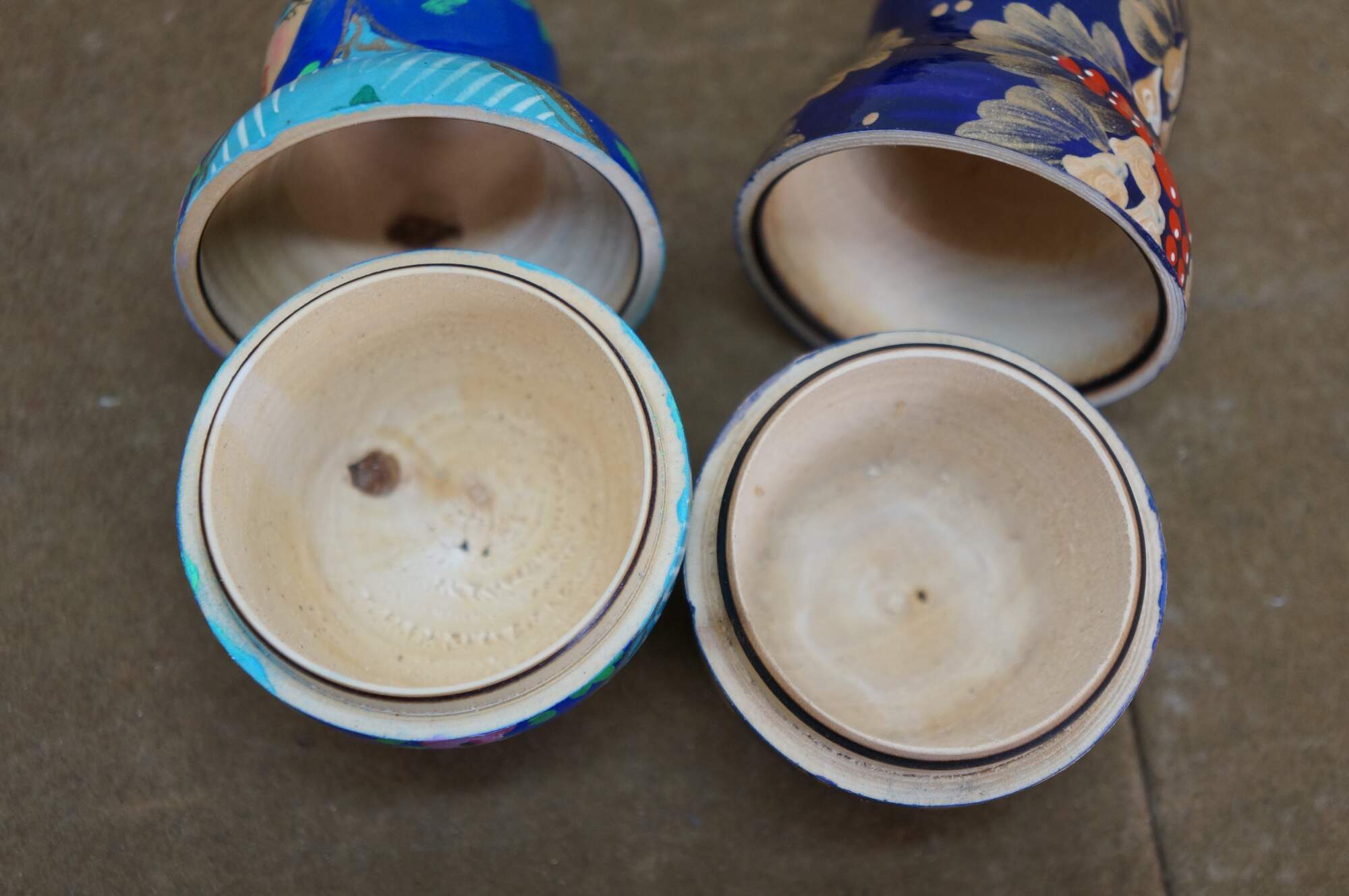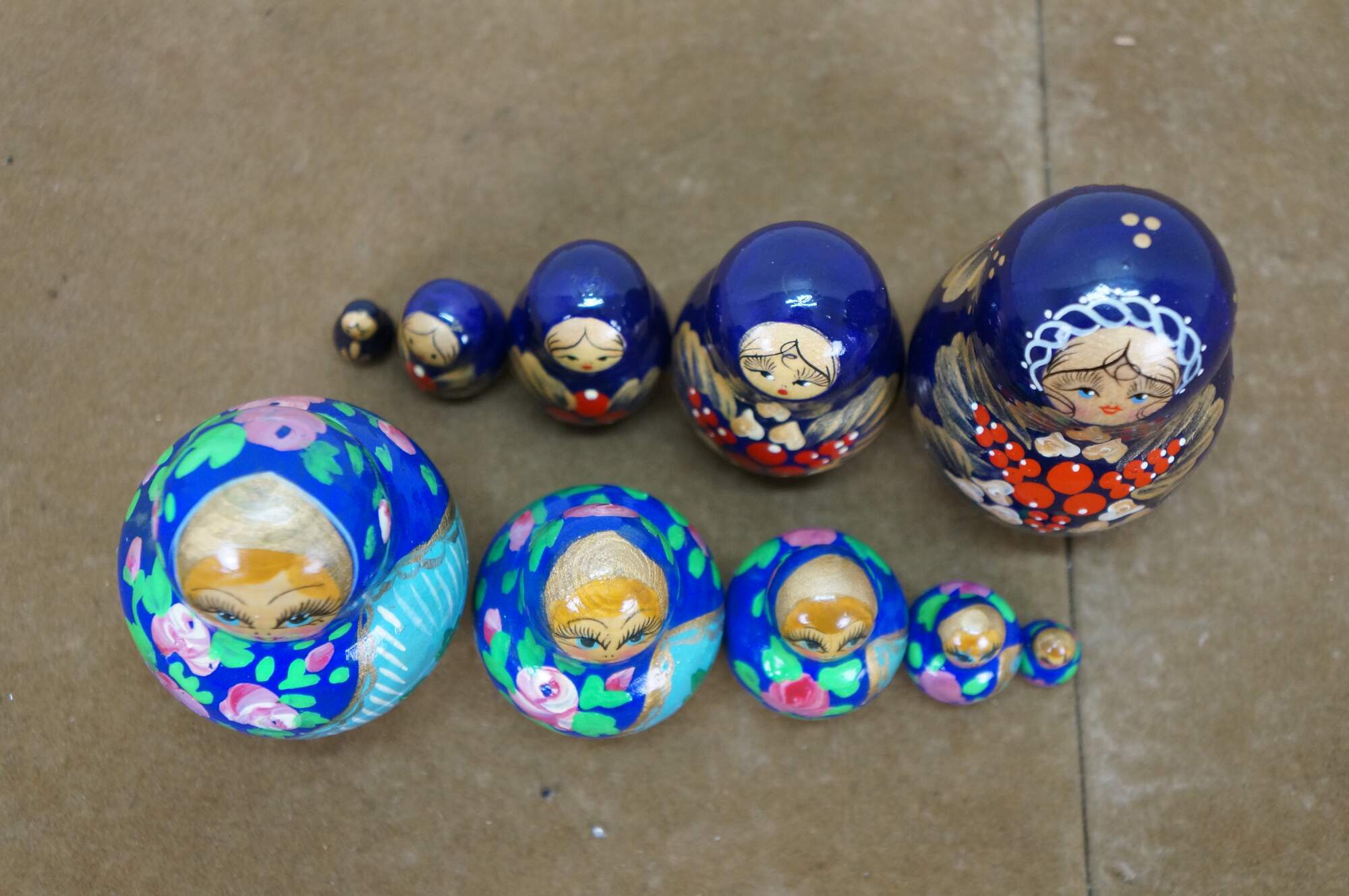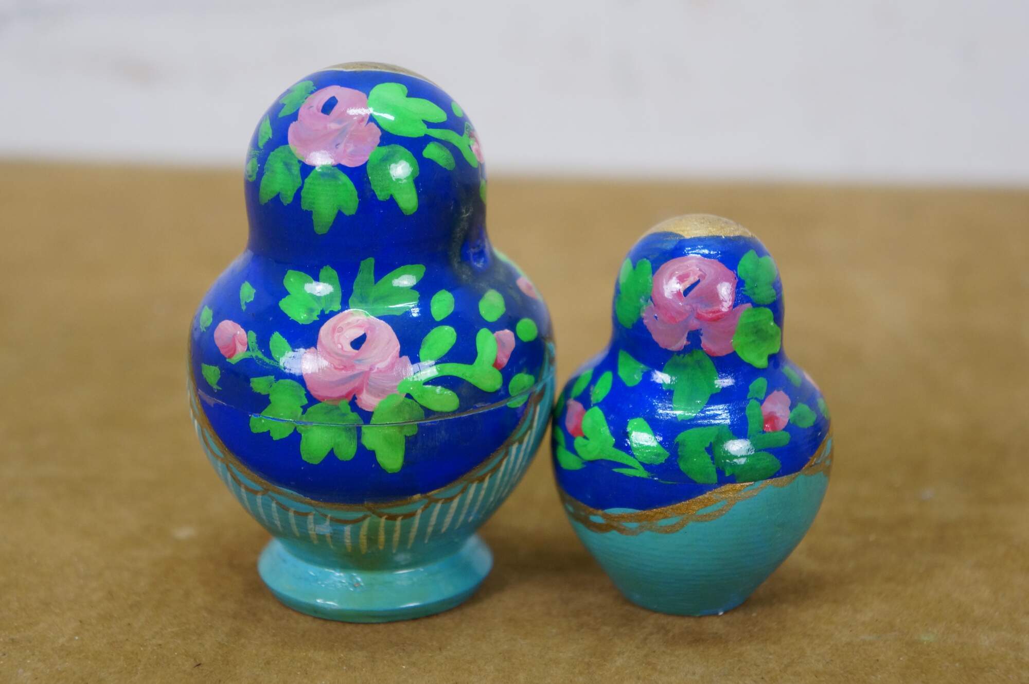 Pair of vintage 20th century hand painted matryoshka wooden nesting dolls. Both include five nesting figures handpainted with traditional Eastern European folk art styling.