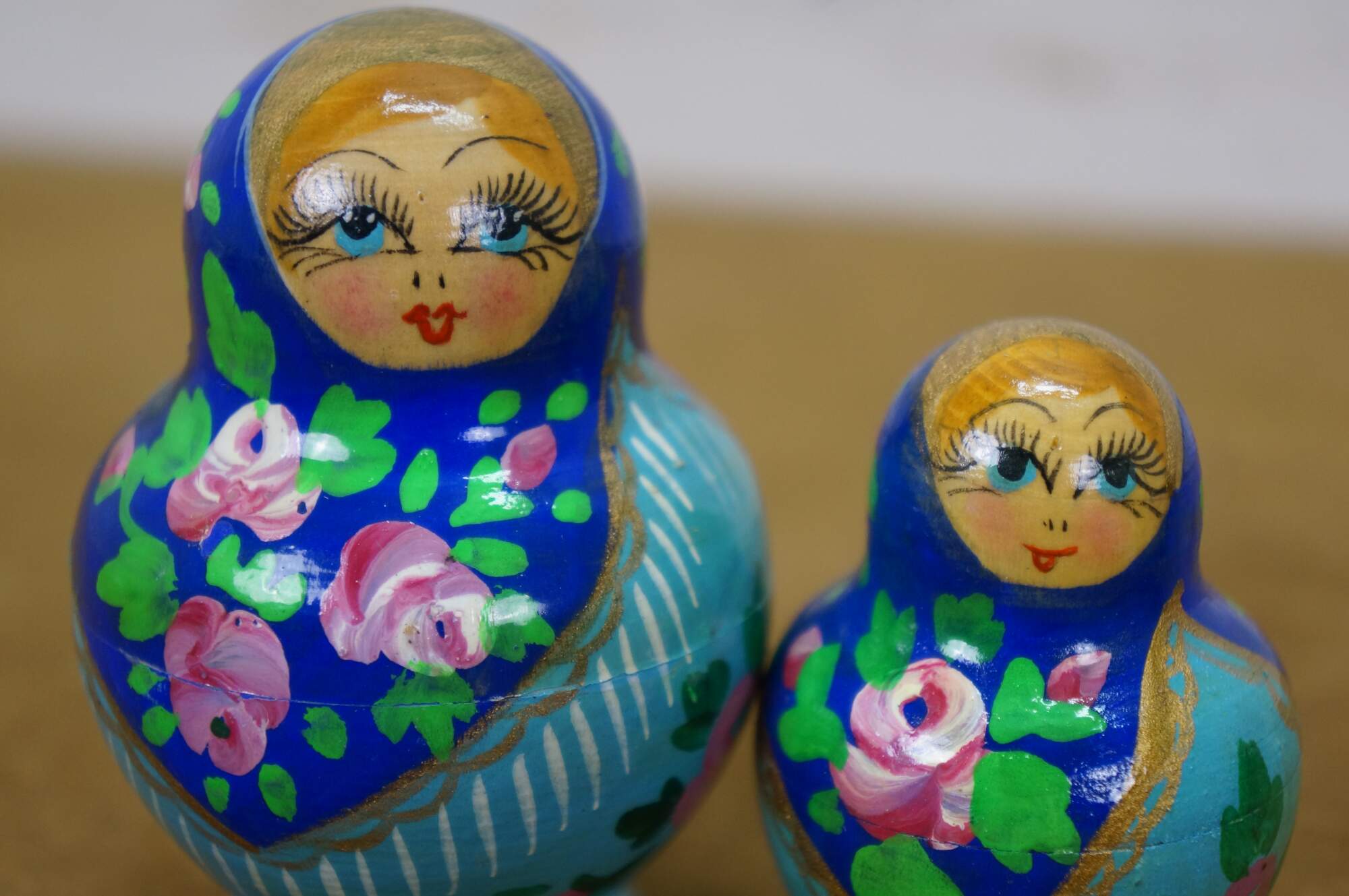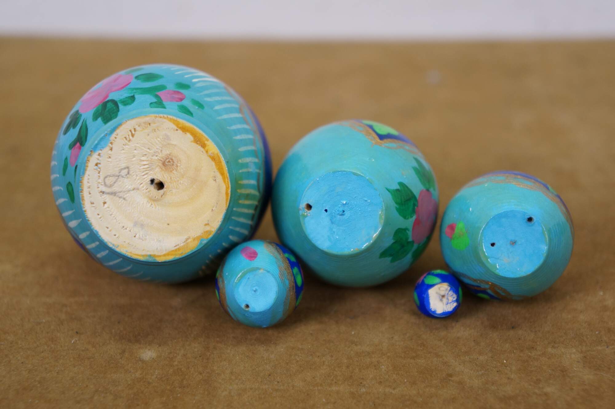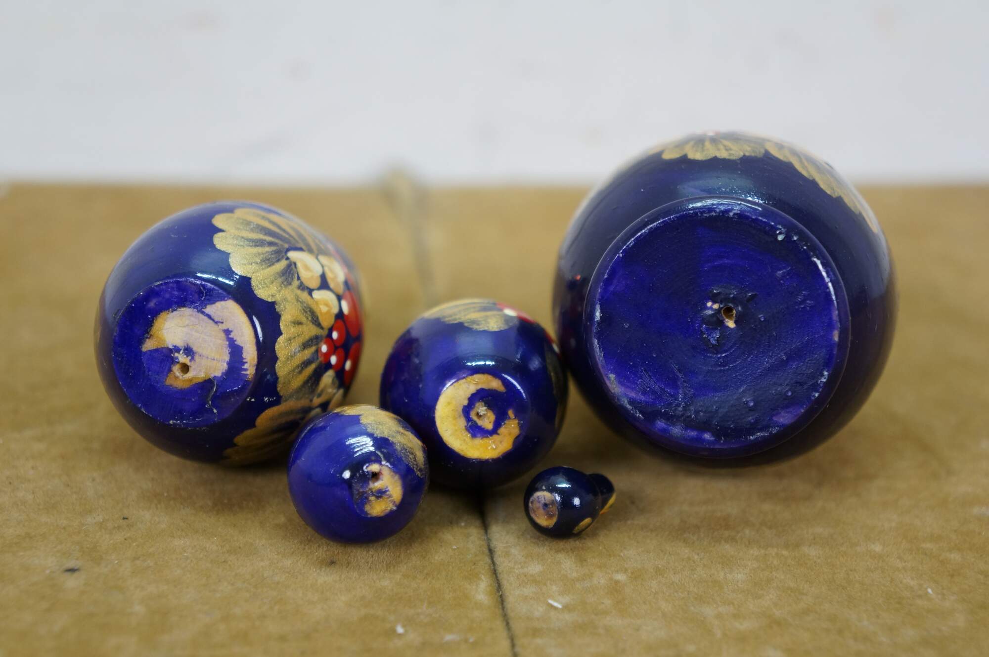 Pair of vintage 20th century hand painted matryoshka wooden nesting dolls. Both include five nesting figures handpainted with traditional Eastern European folk art styling.