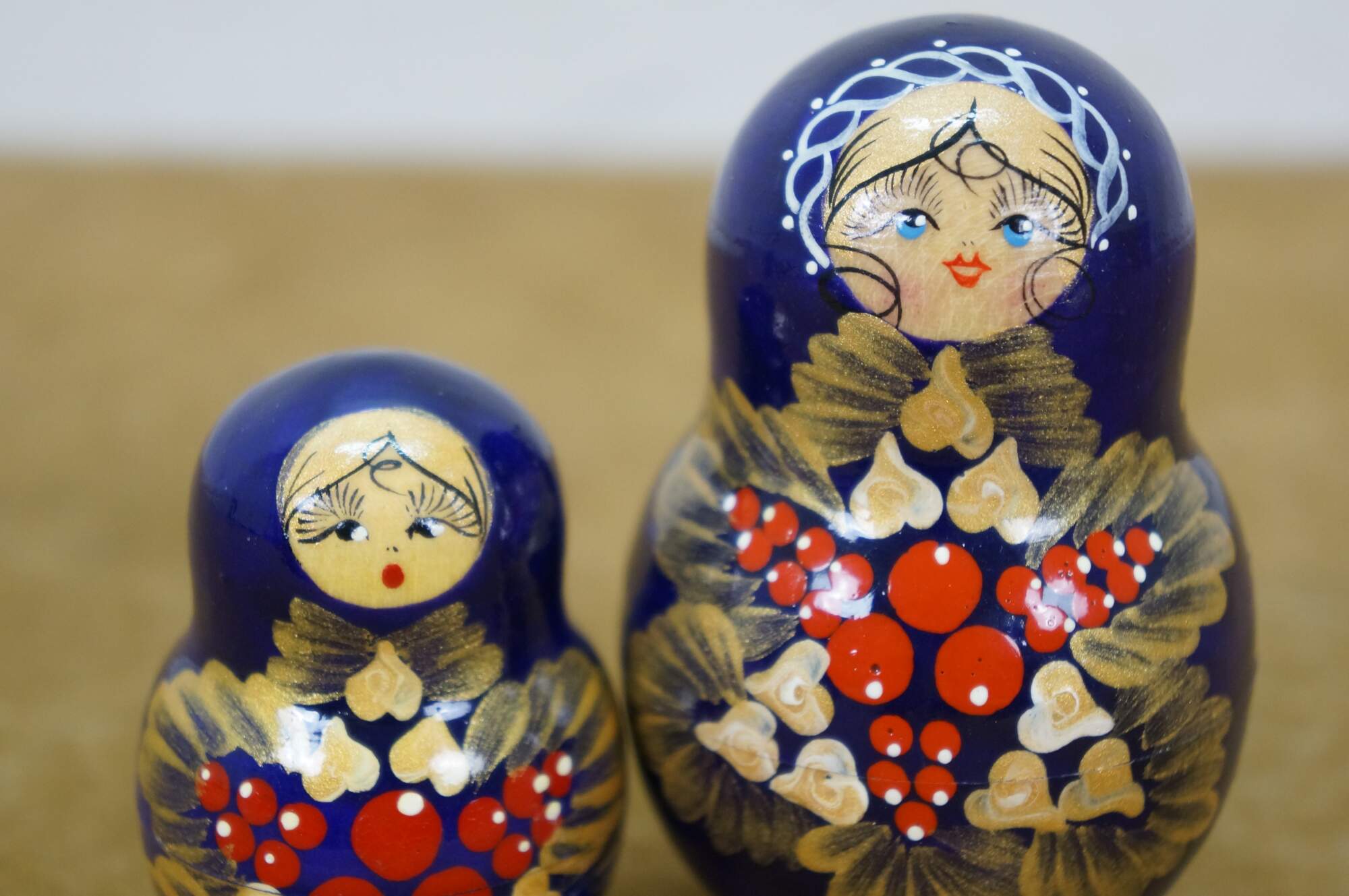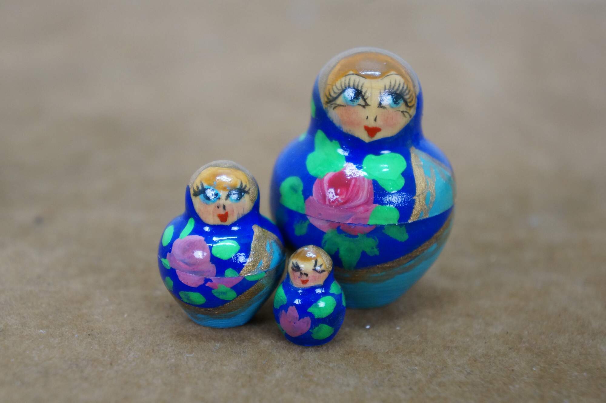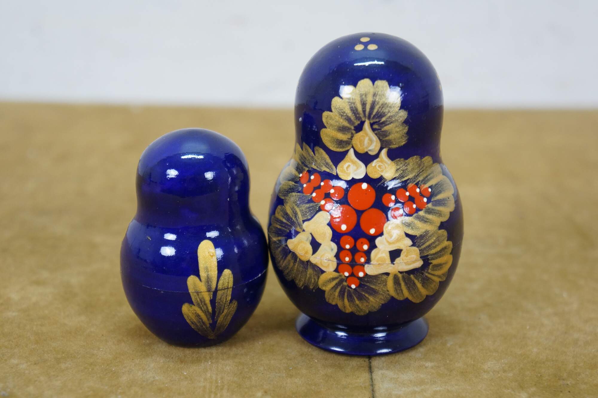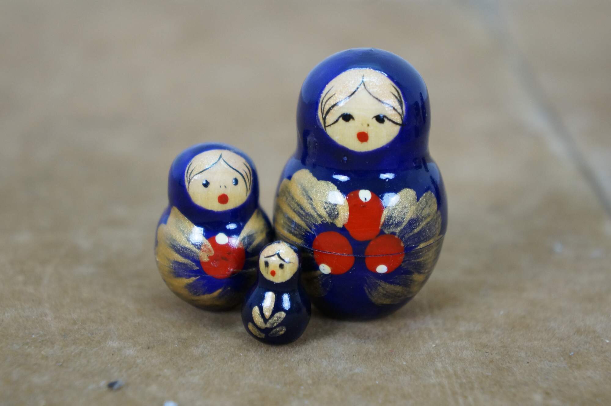 Pair of vintage 20th century hand painted matryoshka wooden nesting dolls. Both include five nesting figures handpainted with traditional Eastern European folk art styling.