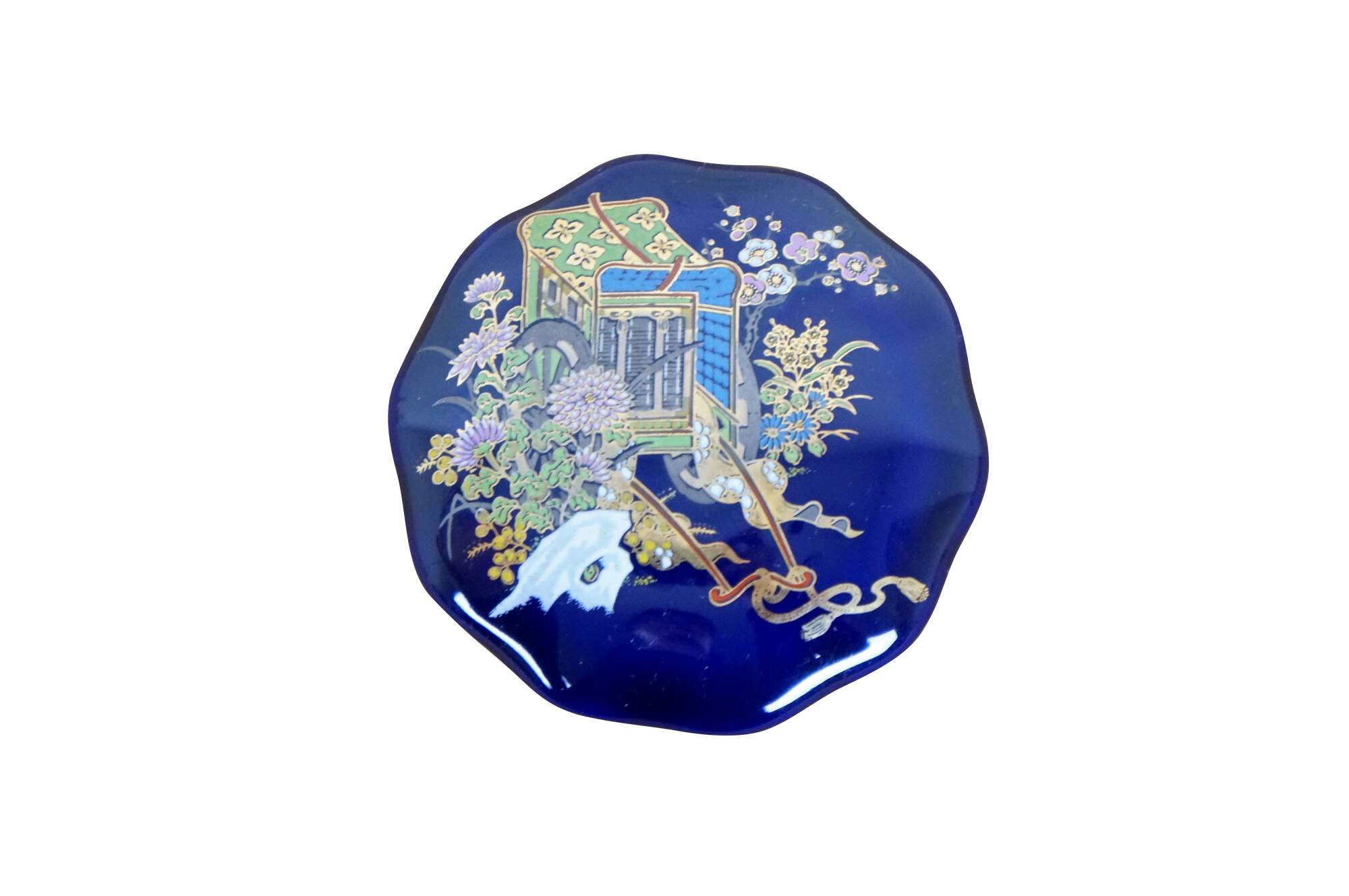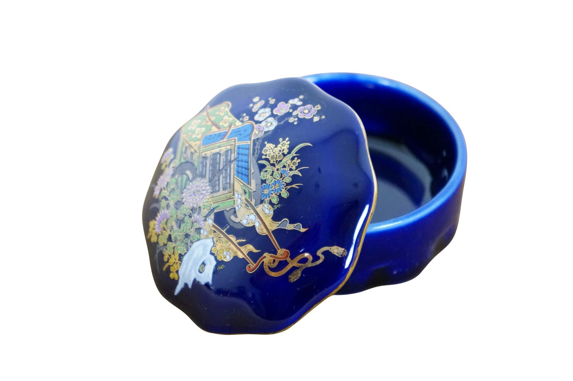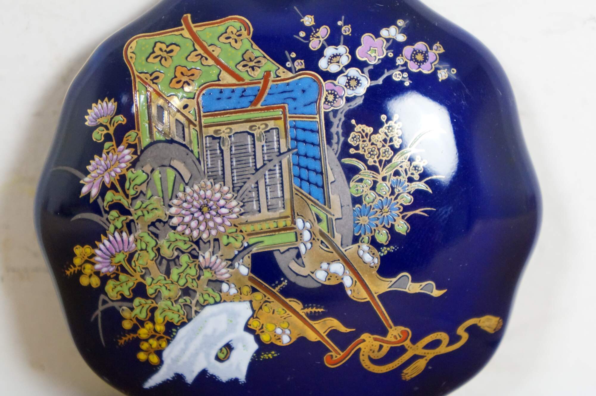 Vintage Japanese Kutani porcelain lidded trinket box - glazed in cobalt blue with a gilt rickshaw / cart / carriage covered in flowers.