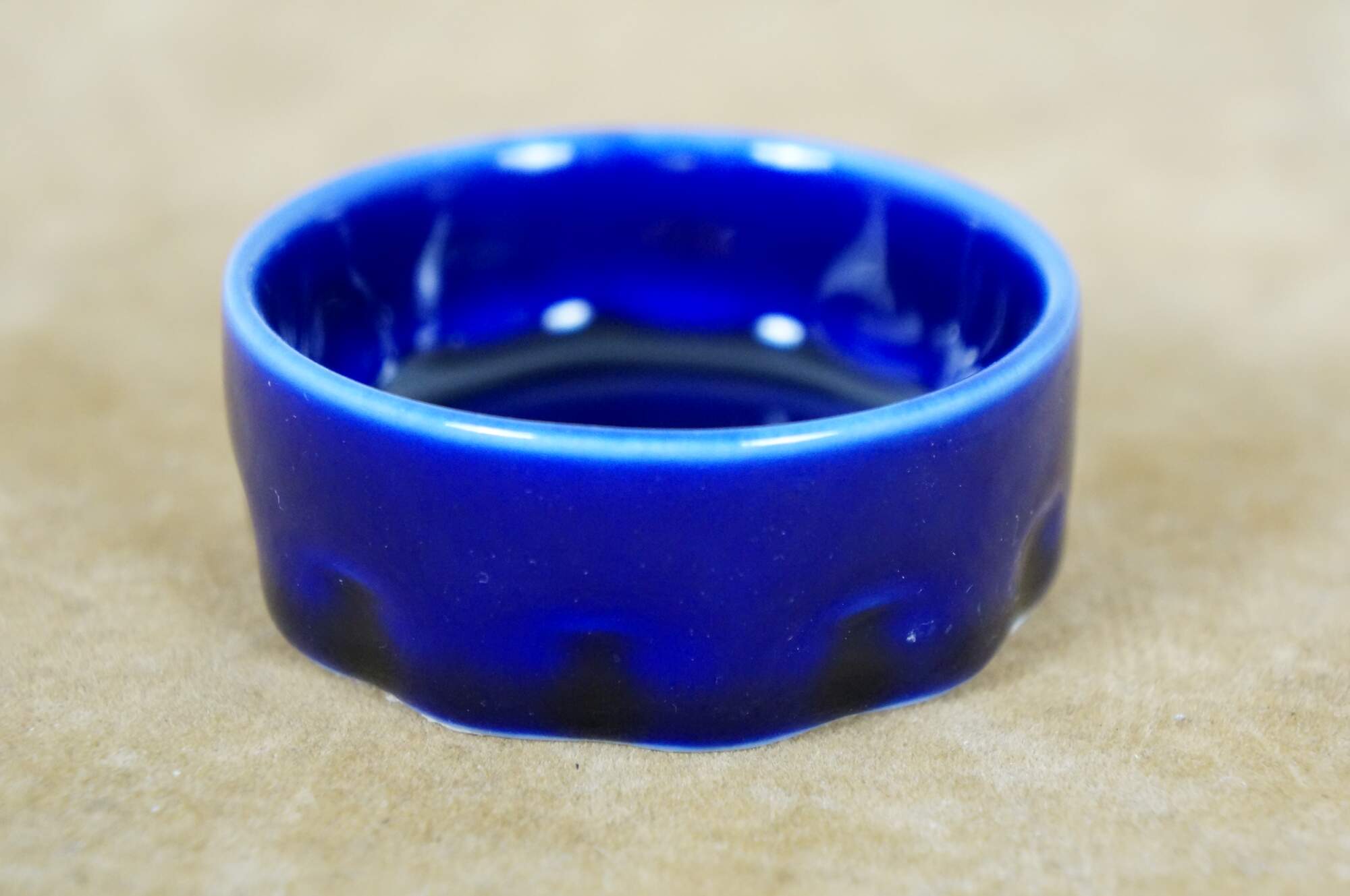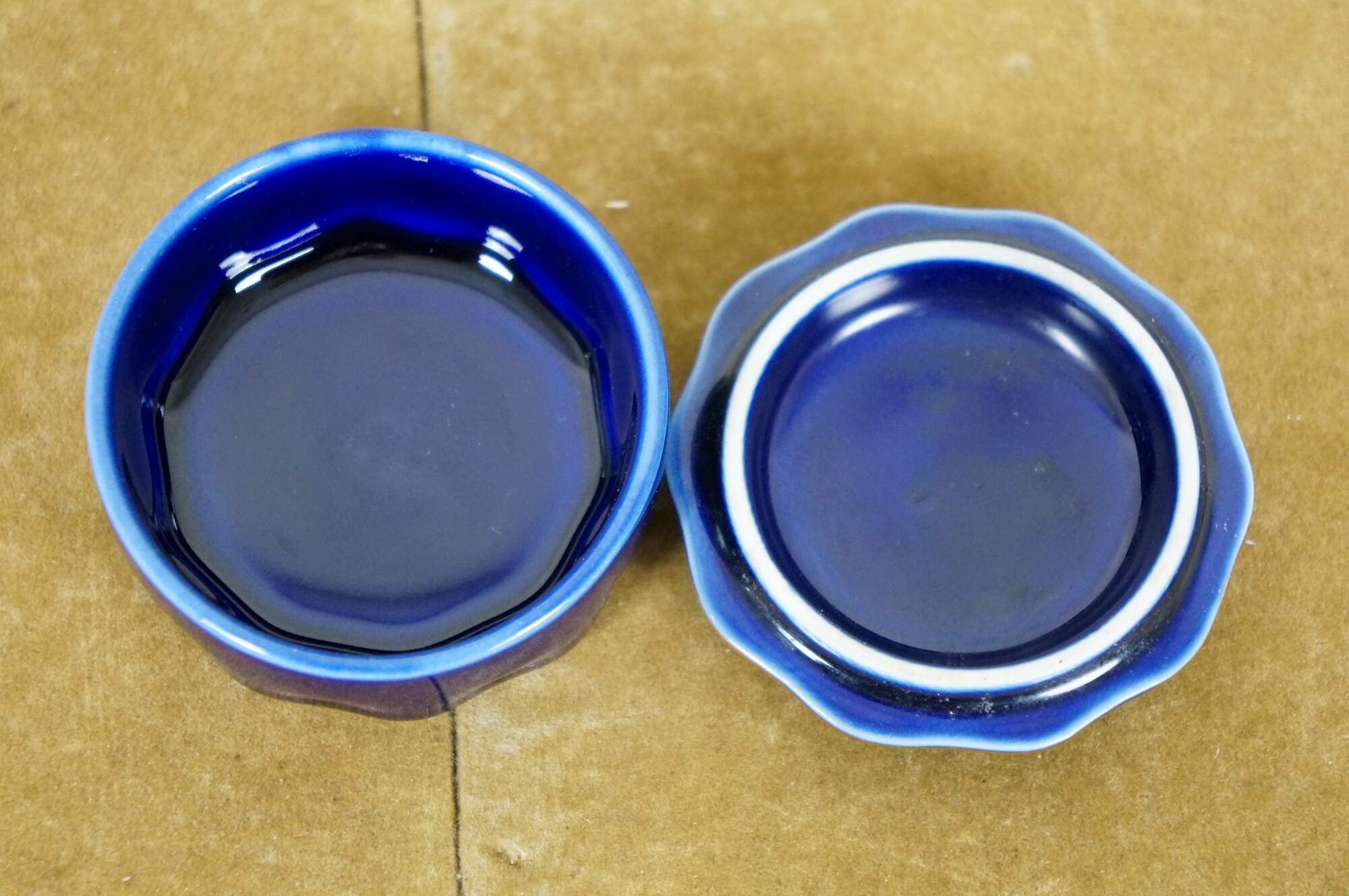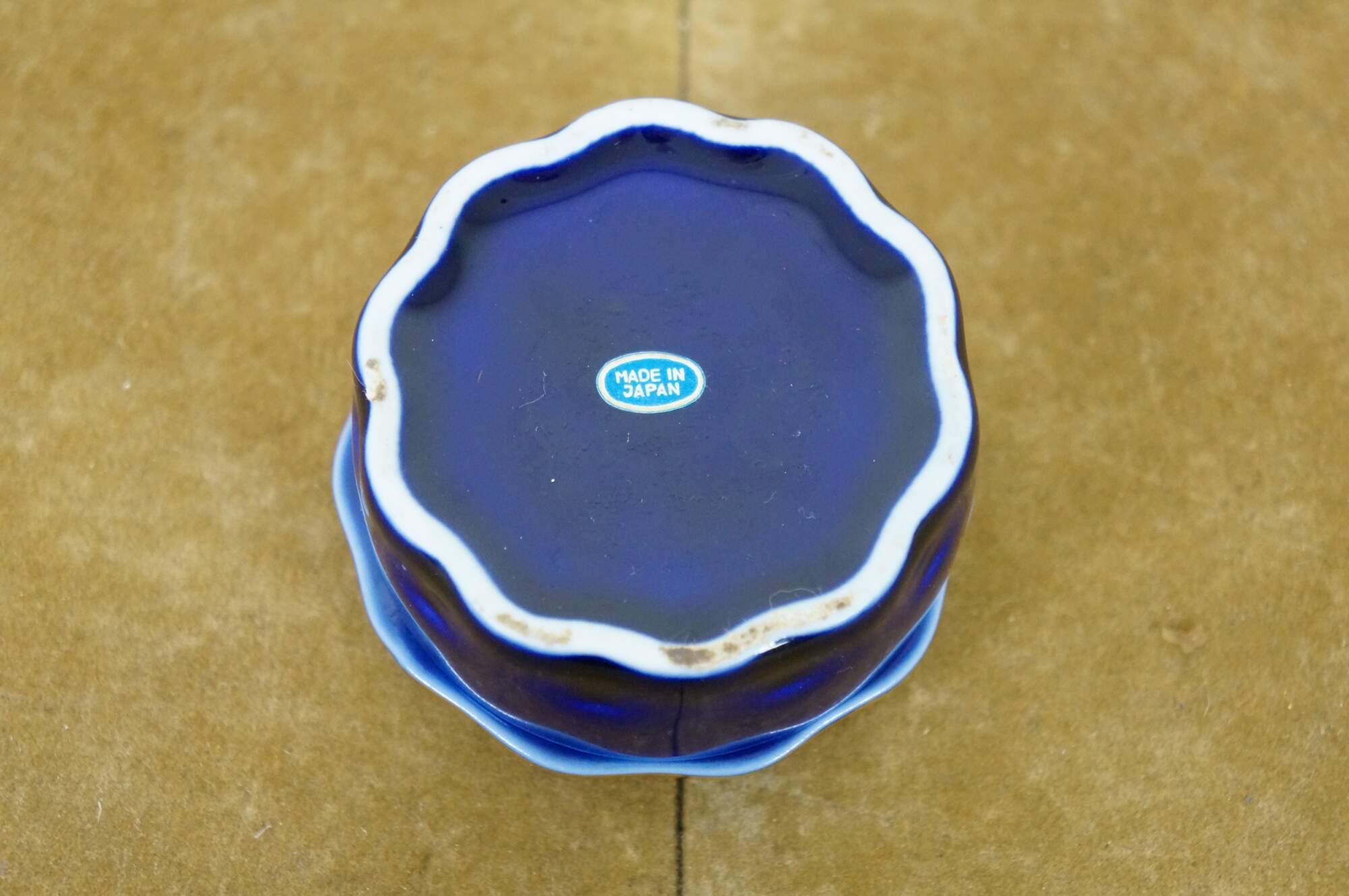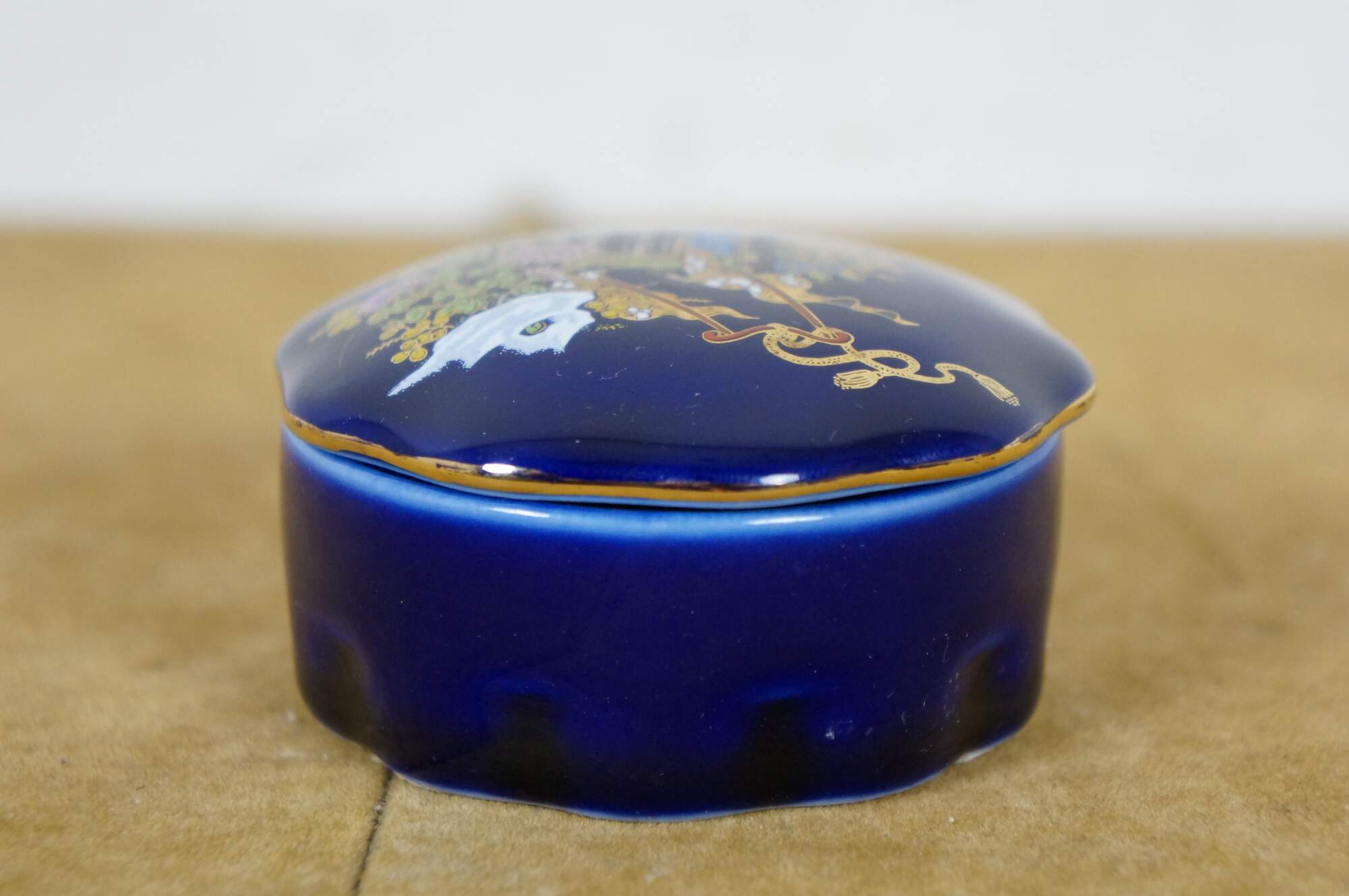 Vintage Japanese Kutani porcelain lidded trinket box - glazed in cobalt blue with a gilt rickshaw / cart / carriage covered in flowers.