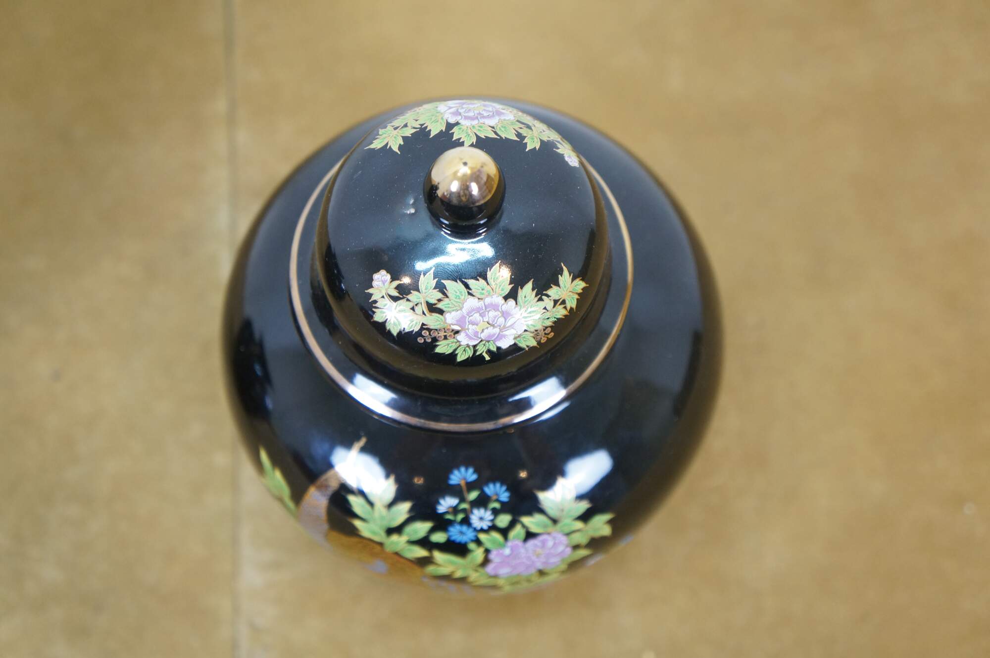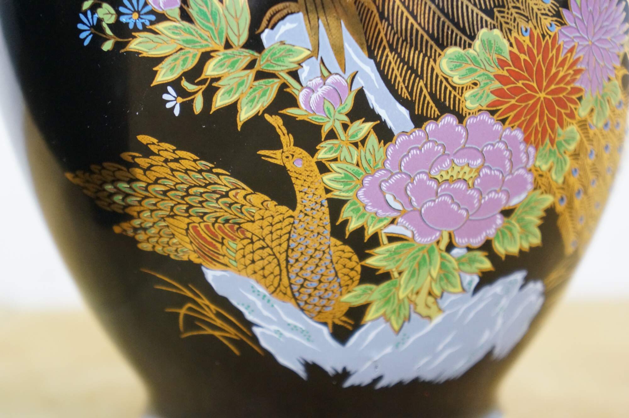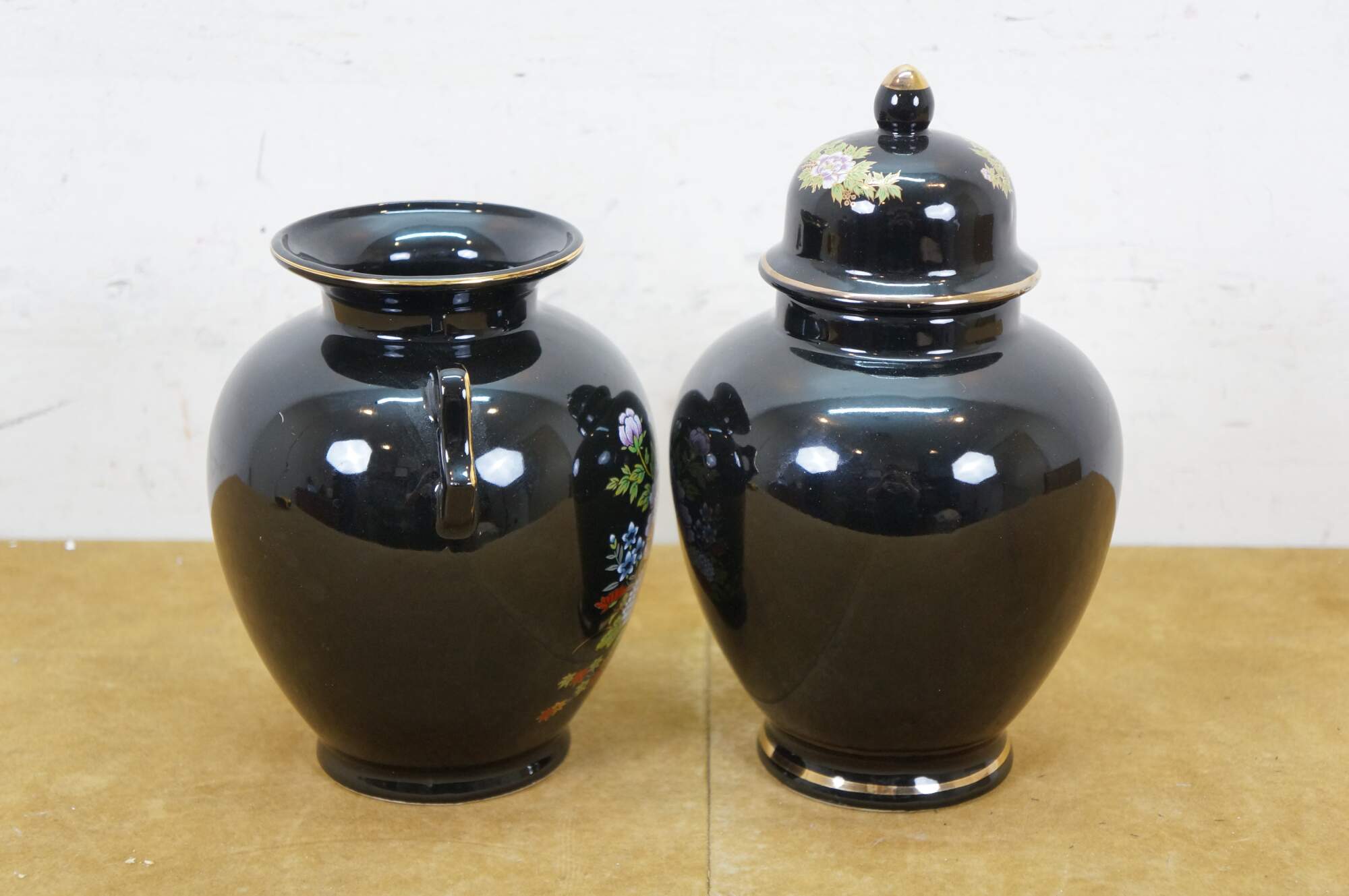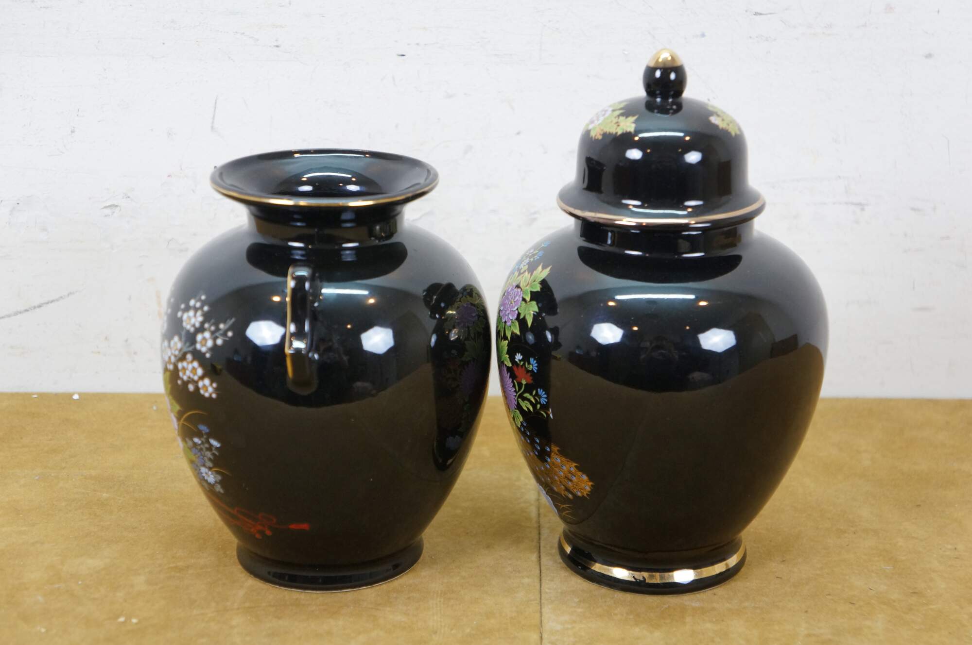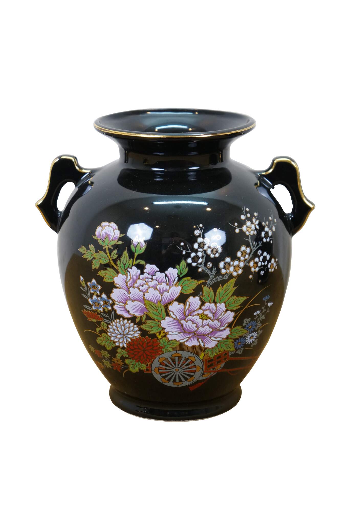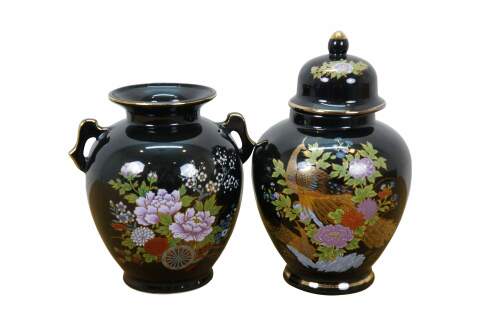 Pair of vintage late 20th century Japanese porcelain handled vase - decorated with a small rickshaw / cart / wagon filled with flowers - and lidded ginger jar - decorated with a pair of gilt peacocks surrounded by rocks and flowers. One signed on base; one marked Fine China Japan.