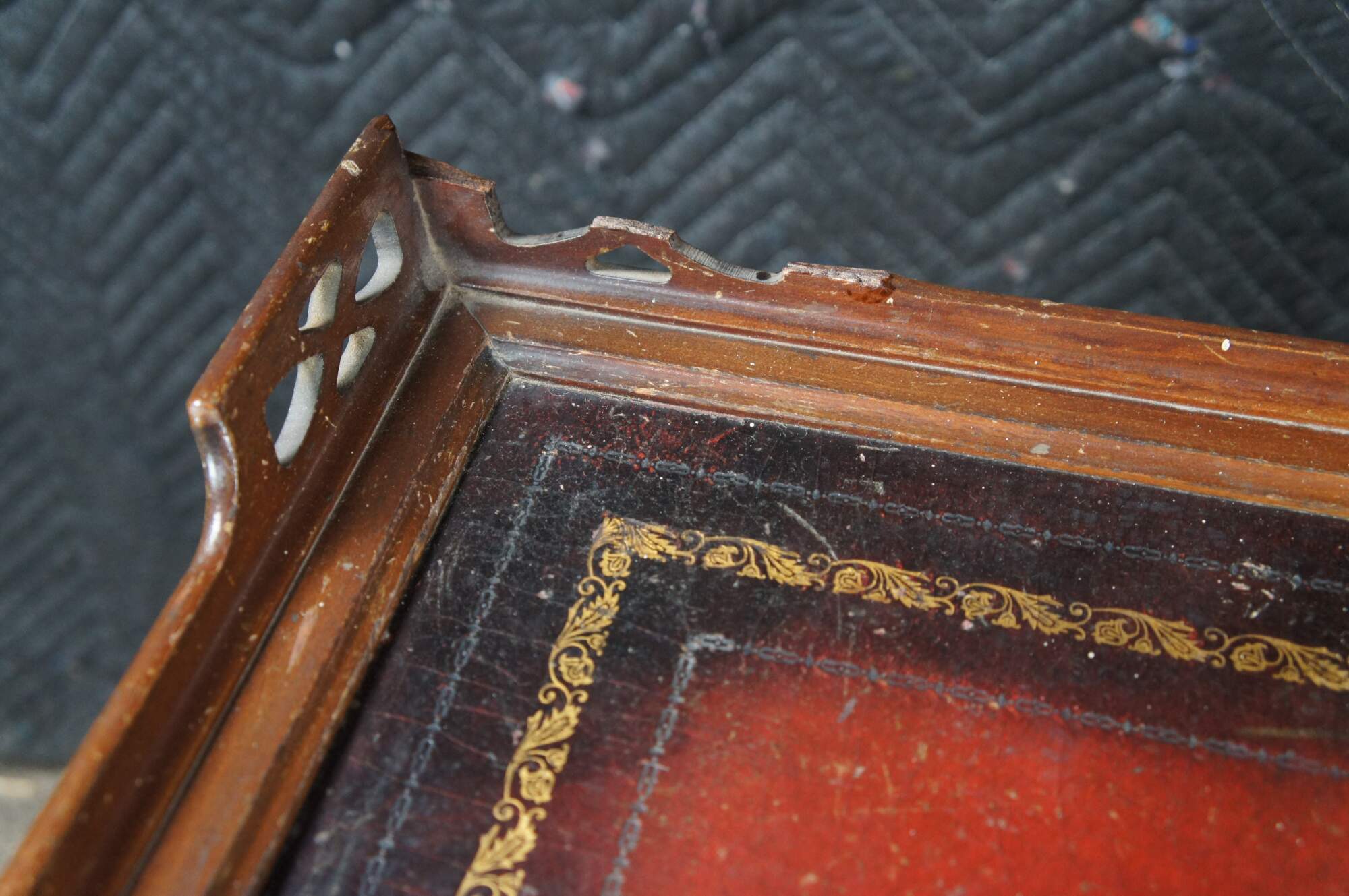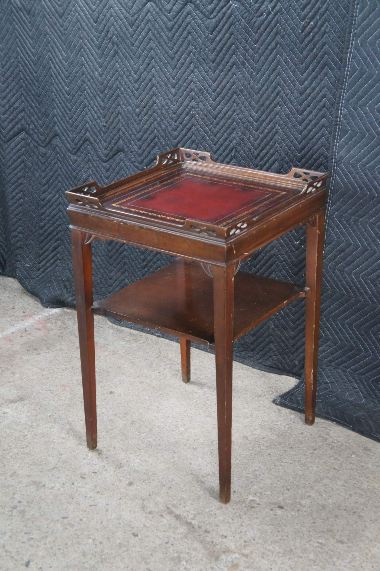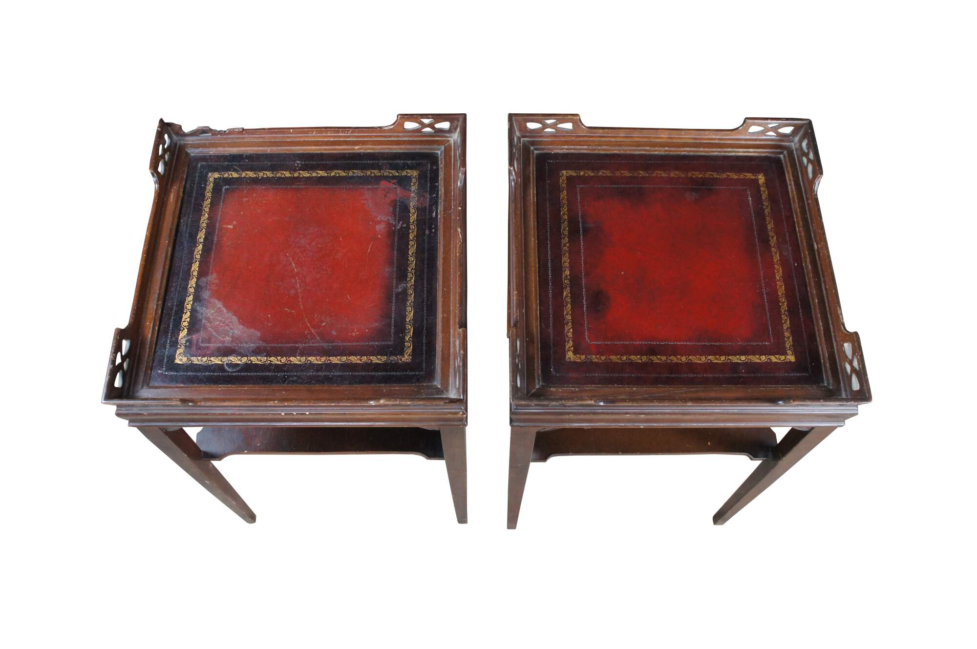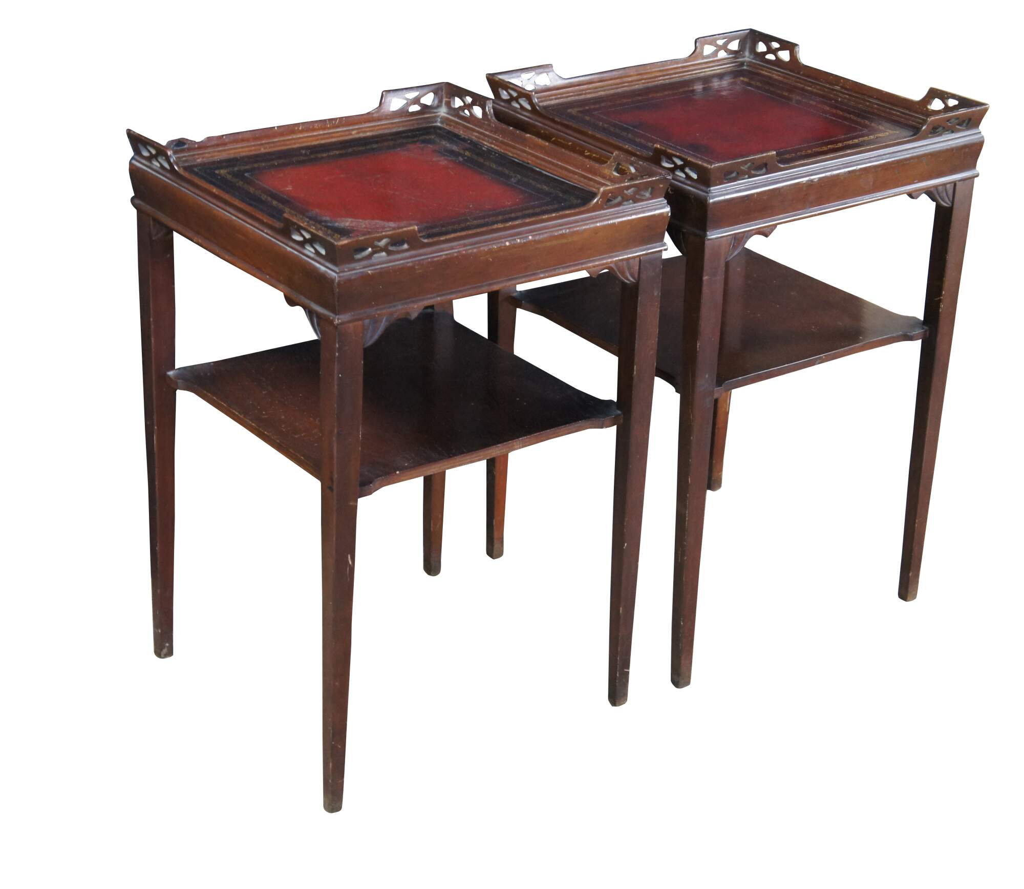 Pair of Mid Century Side Tables by Superior Table Company. Model No. 87410. Features square mahogany frames with fretwork corners over inset tooled leather tops. Each stand has a lower tier or shelf and is supported by square tapered legs.