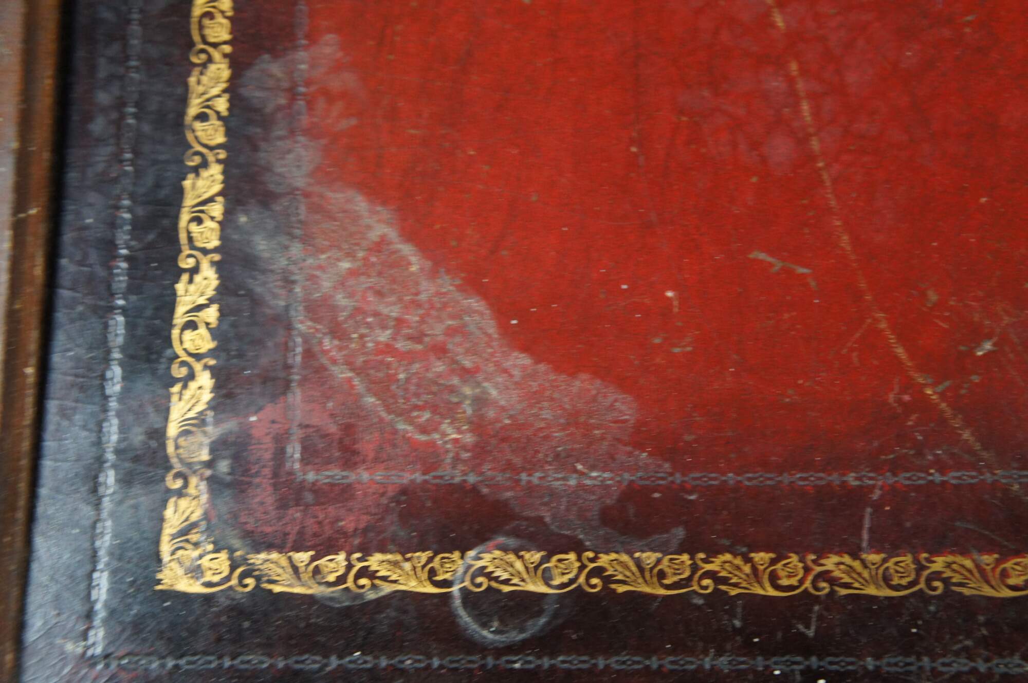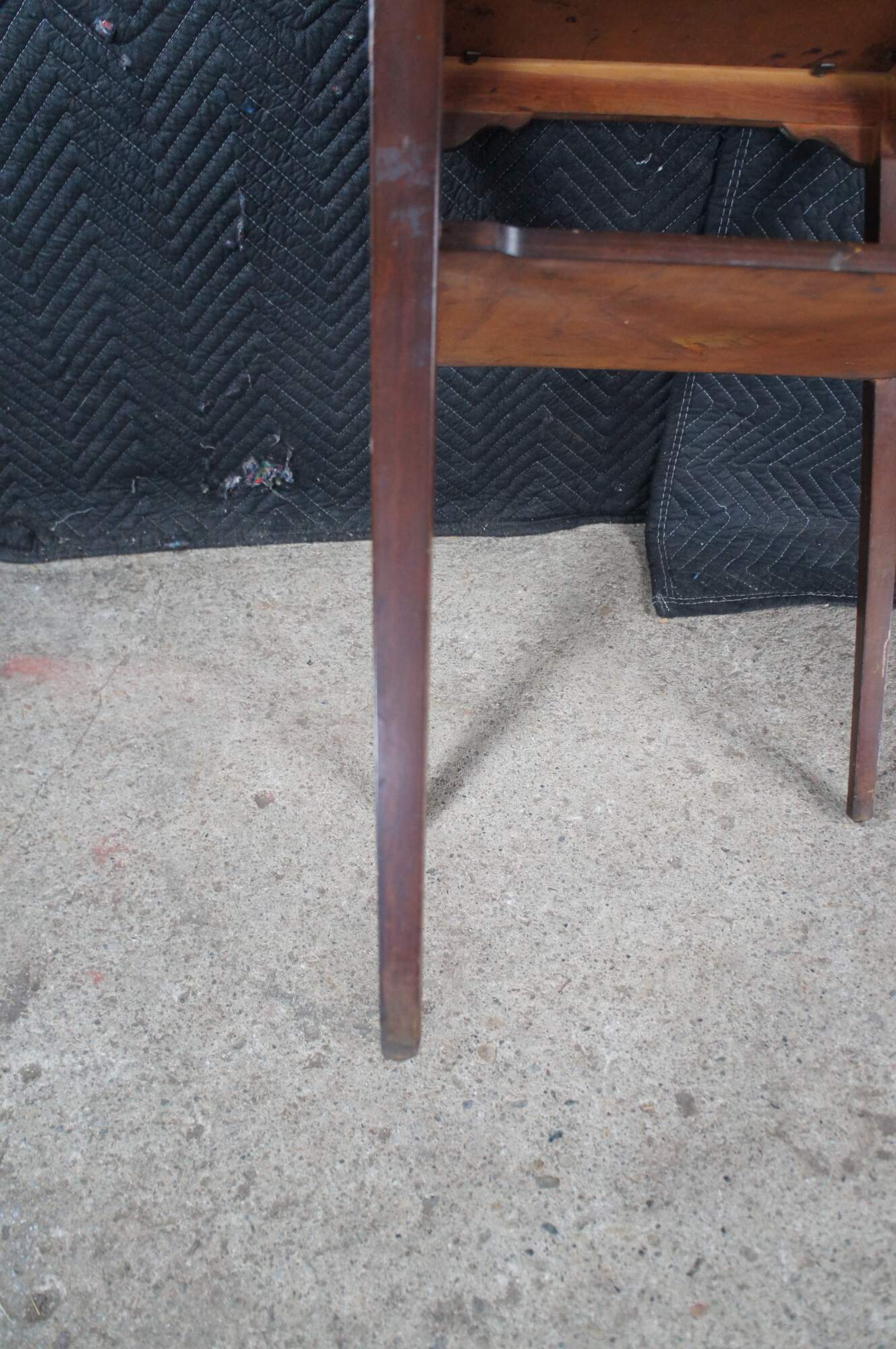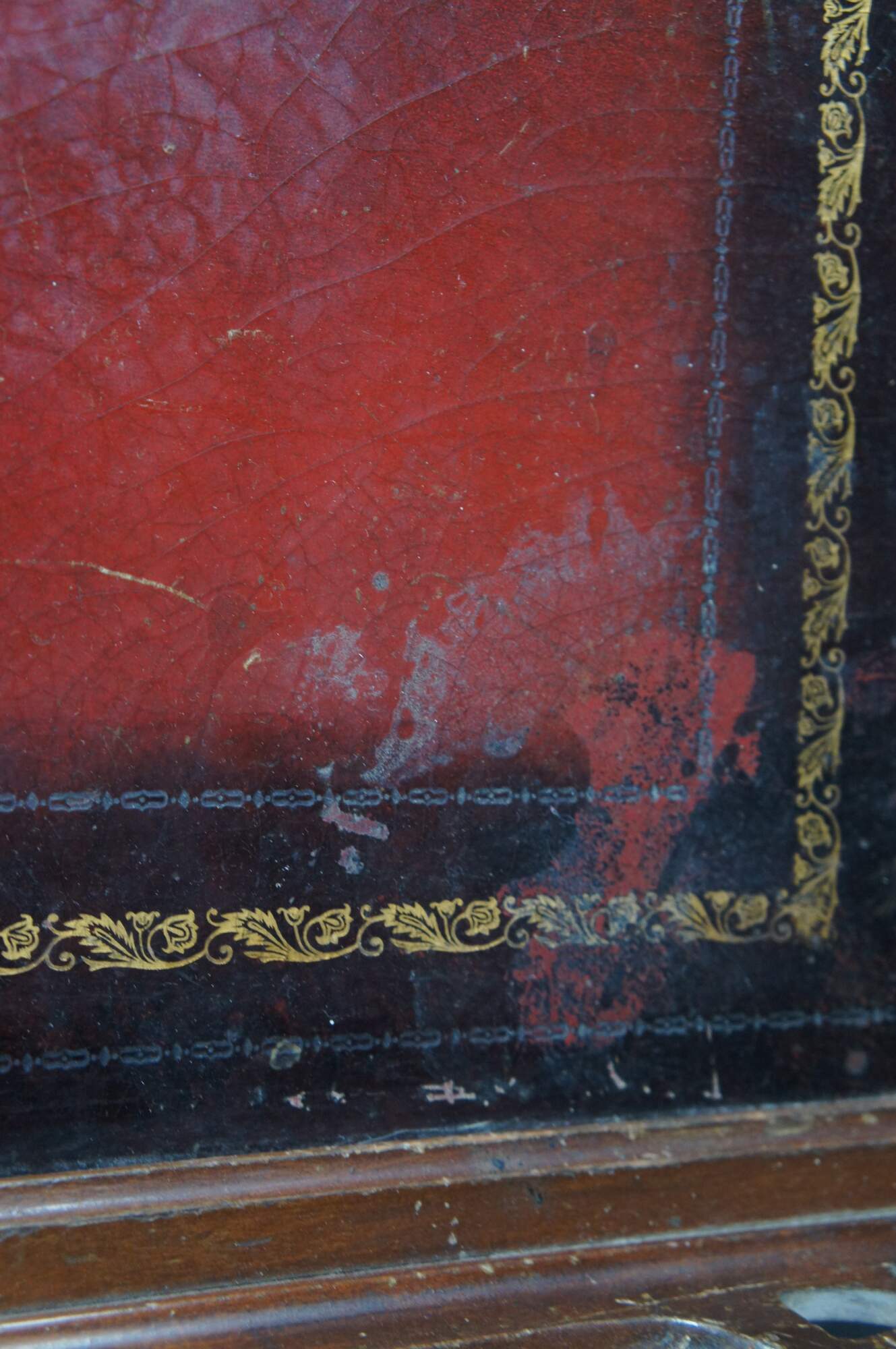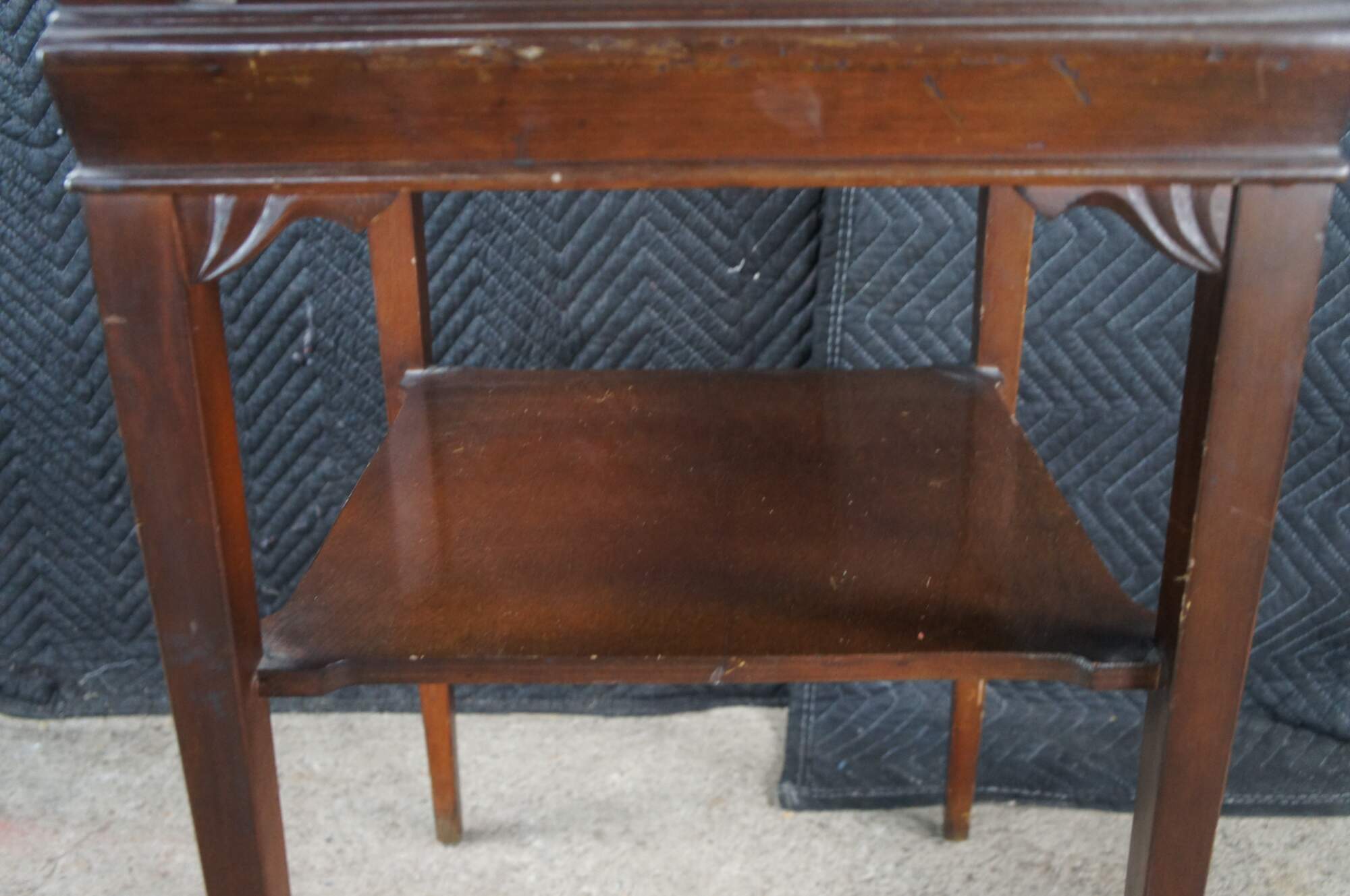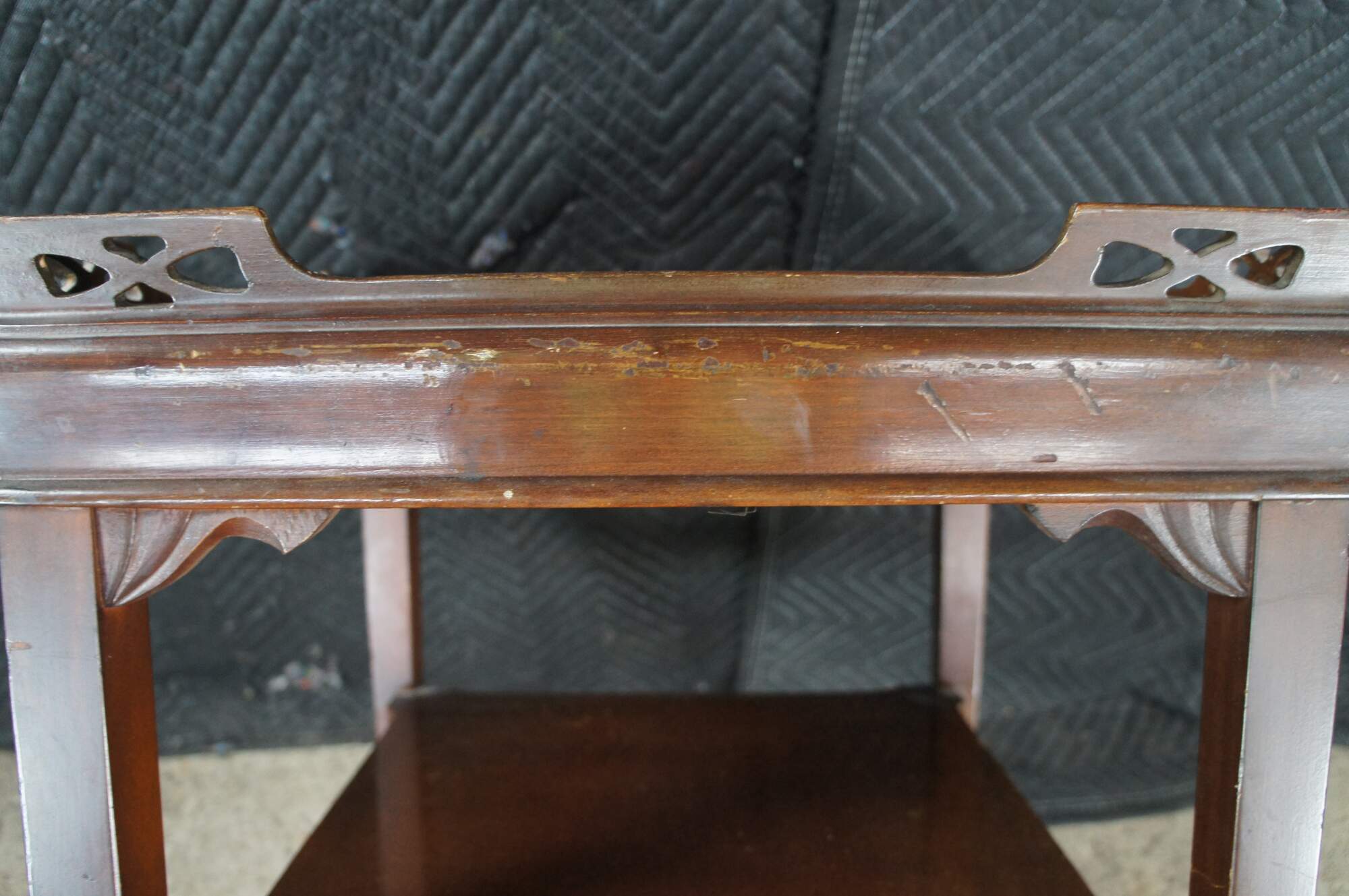 Pair of Mid Century Side Tables by Superior Table Company. Model No. 87410. Features square mahogany frames with fretwork corners over inset tooled leather tops. Each stand has a lower tier or shelf and is supported by square tapered legs.