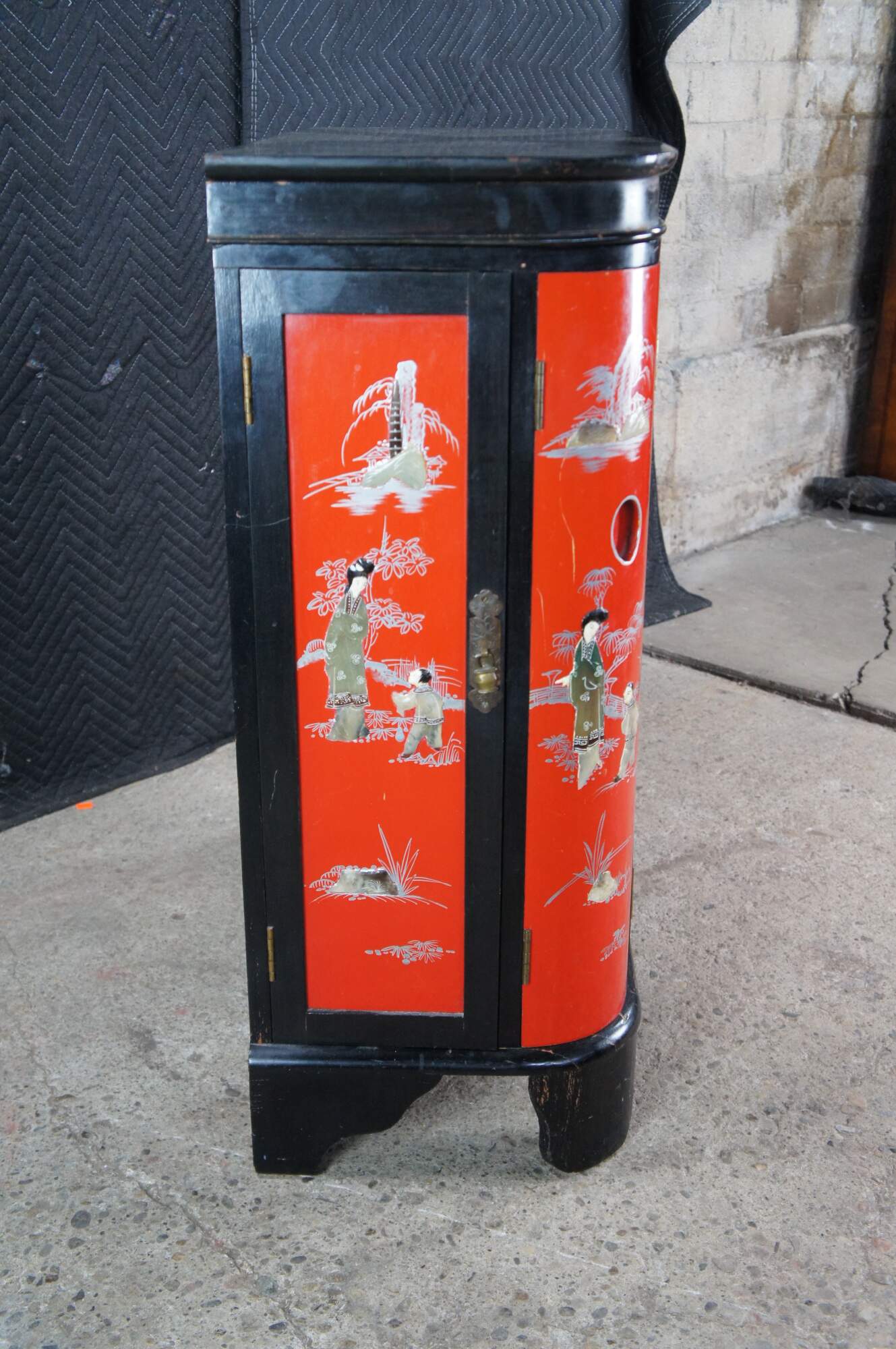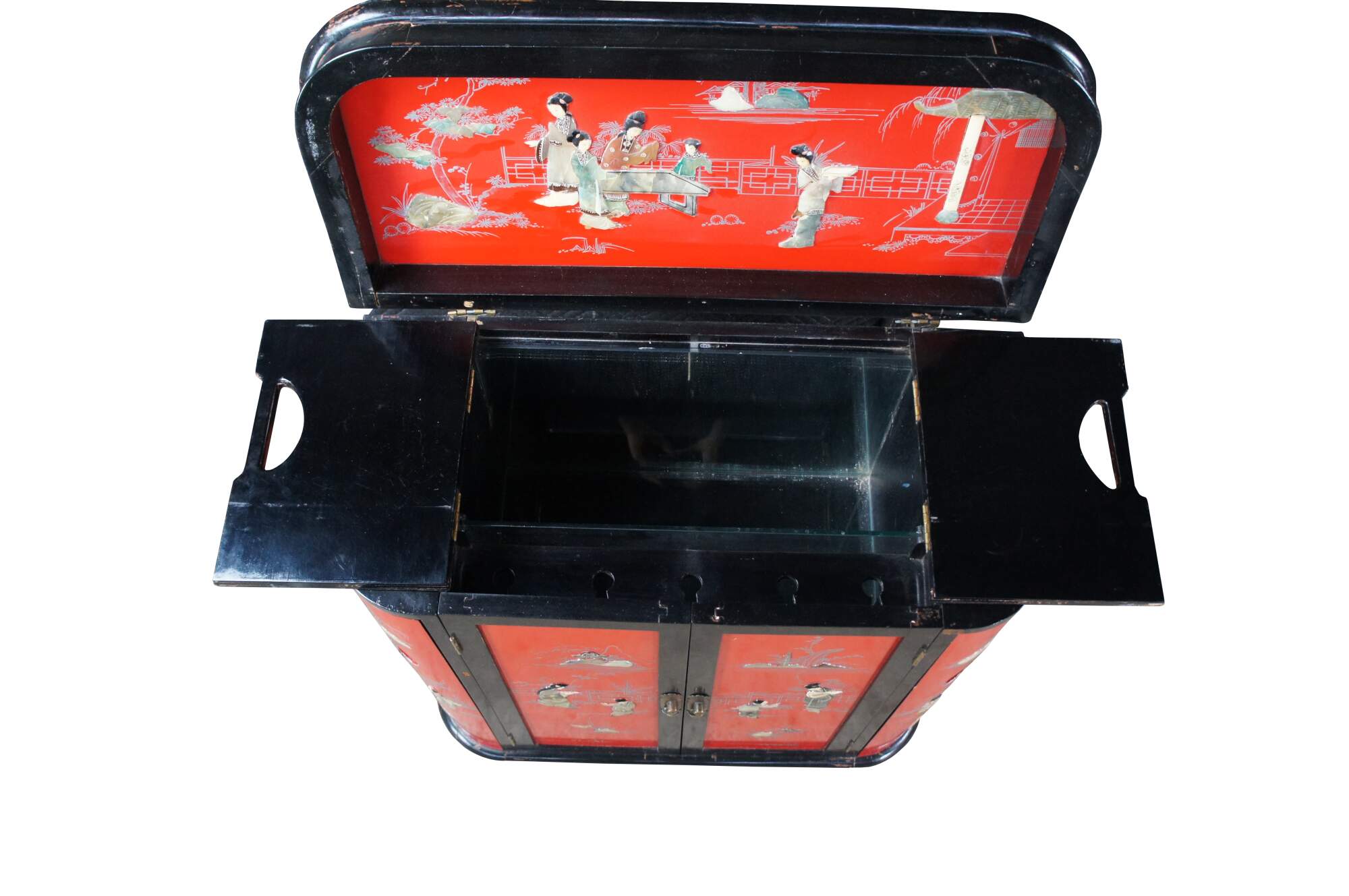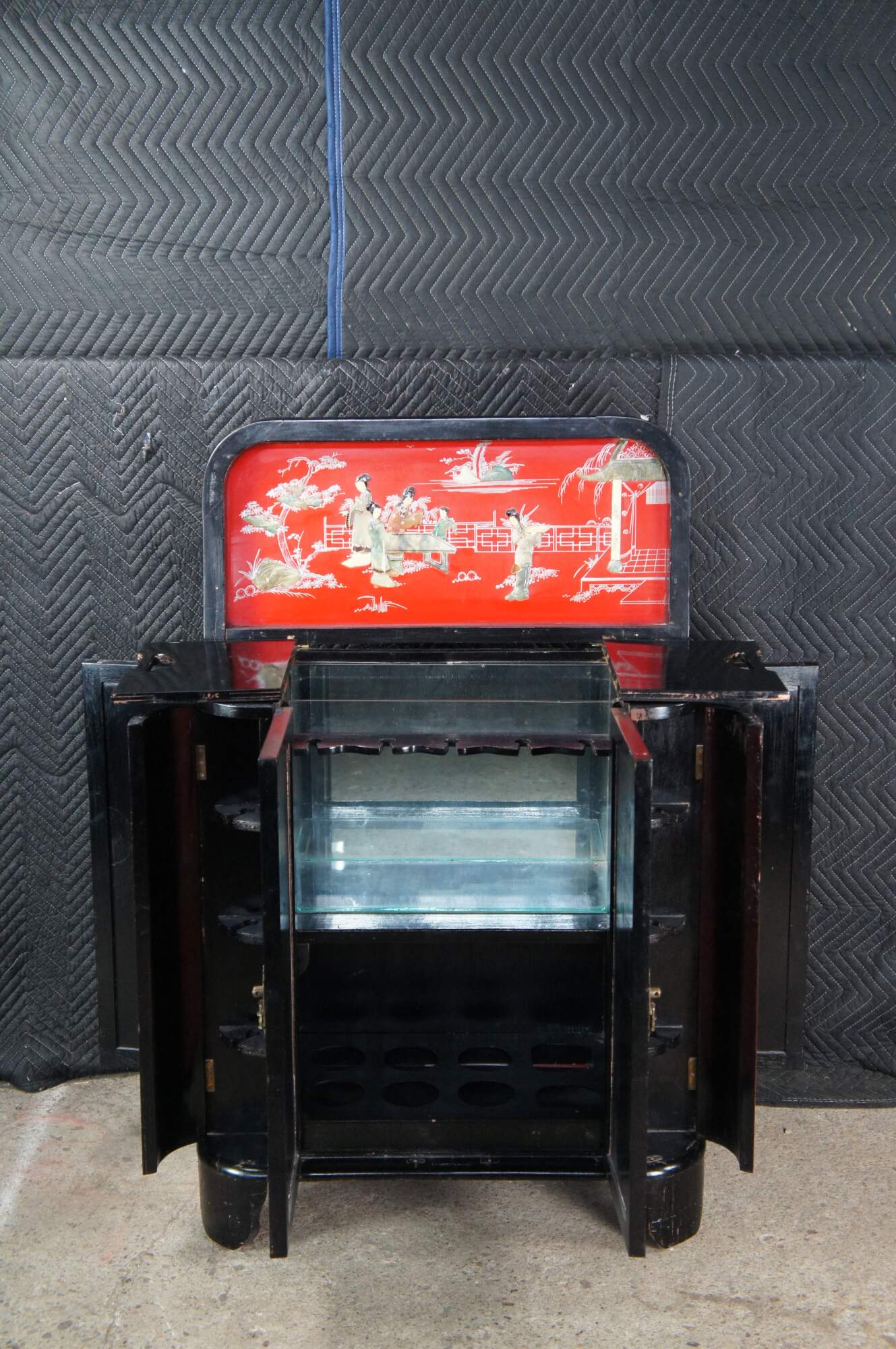 Mid-20th Century Chinese Red and Black Lacquer Soapstone Inlaid Dry Bar, circa 1960s. Features a demilune form with a flip-top opening to a mirrored area for glassware and bottles as well as hanging glasses. The lower section has a pullout with space for 8 additional bottles. Each front corner opens with hanging space for 3 additional goblets or cordials. Along the back side, there are two additional hidden doors that open to 3 shelves for more glassware. The cabinet is decorated in a traditional oriental motif with painted pagoda and geisha scenes featuring raised soapstone elements and figures. A fun addition to any space.