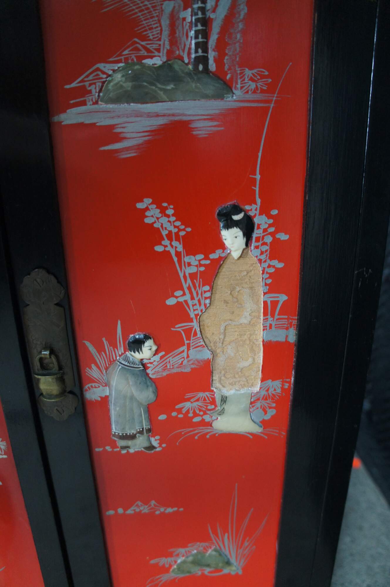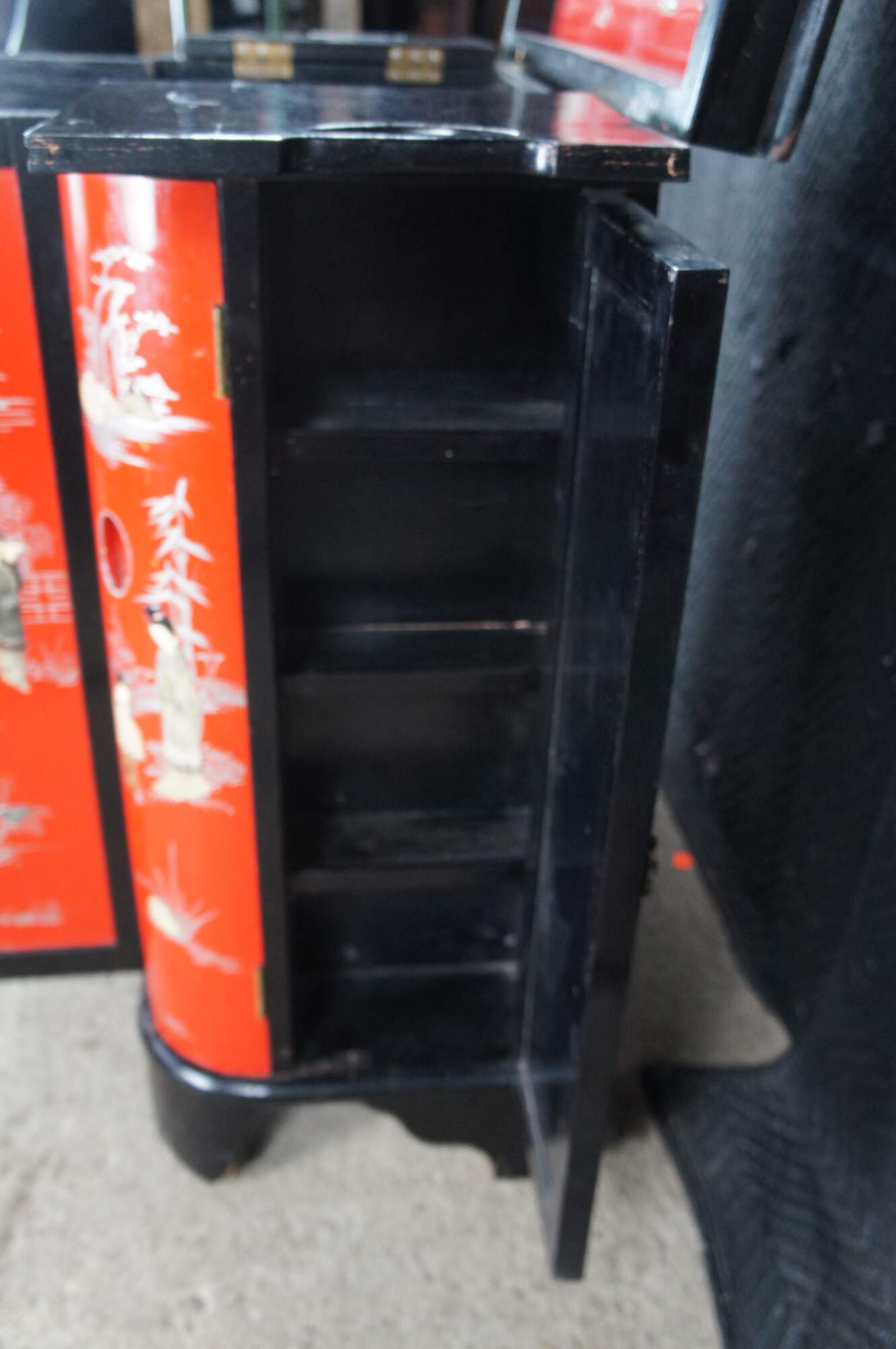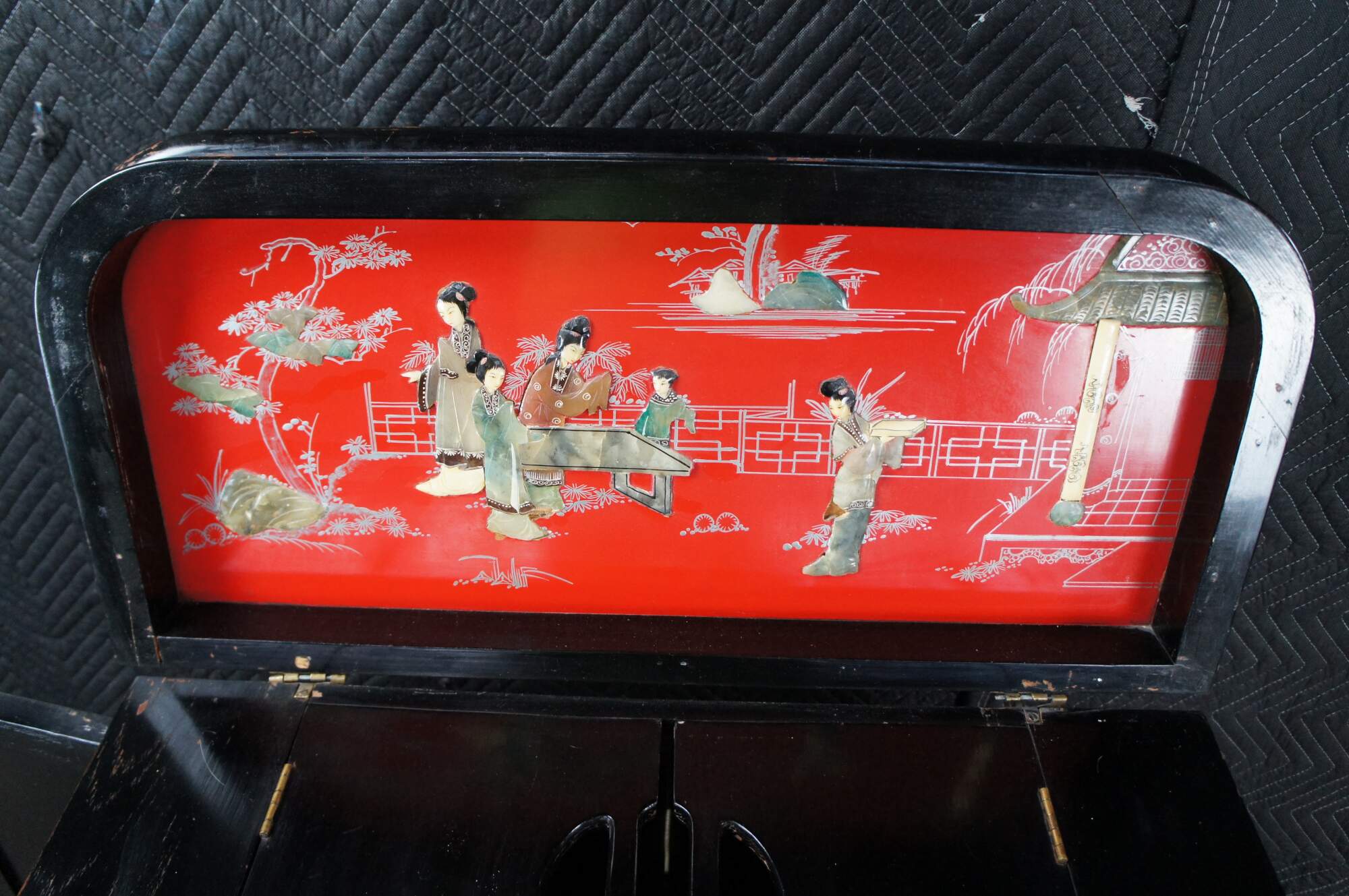 Mid-20th Century Chinese Red and Black Lacquer Soapstone Inlaid Dry Bar, circa 1960s. Features a demilune form with a flip-top opening to a mirrored area for glassware and bottles as well as hanging glasses. The lower section has a pullout with space for 8 additional bottles. Each front corner opens with hanging space for 3 additional goblets or cordials. Along the back side, there are two additional hidden doors that open to 3 shelves for more glassware. The cabinet is decorated in a traditional oriental motif with painted pagoda and geisha scenes featuring raised soapstone elements and figures. A fun addition to any space.