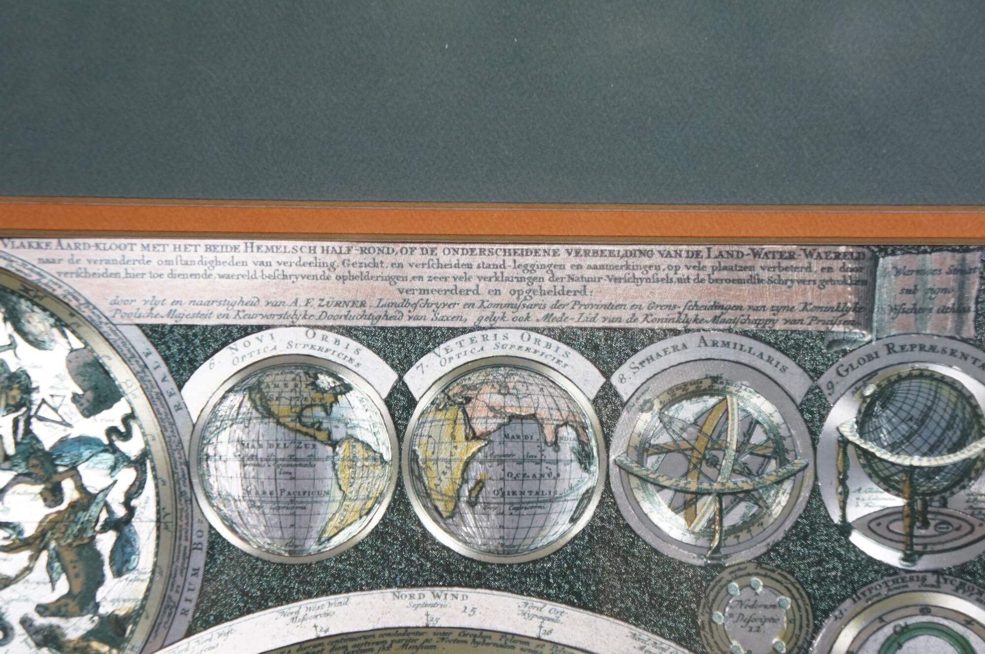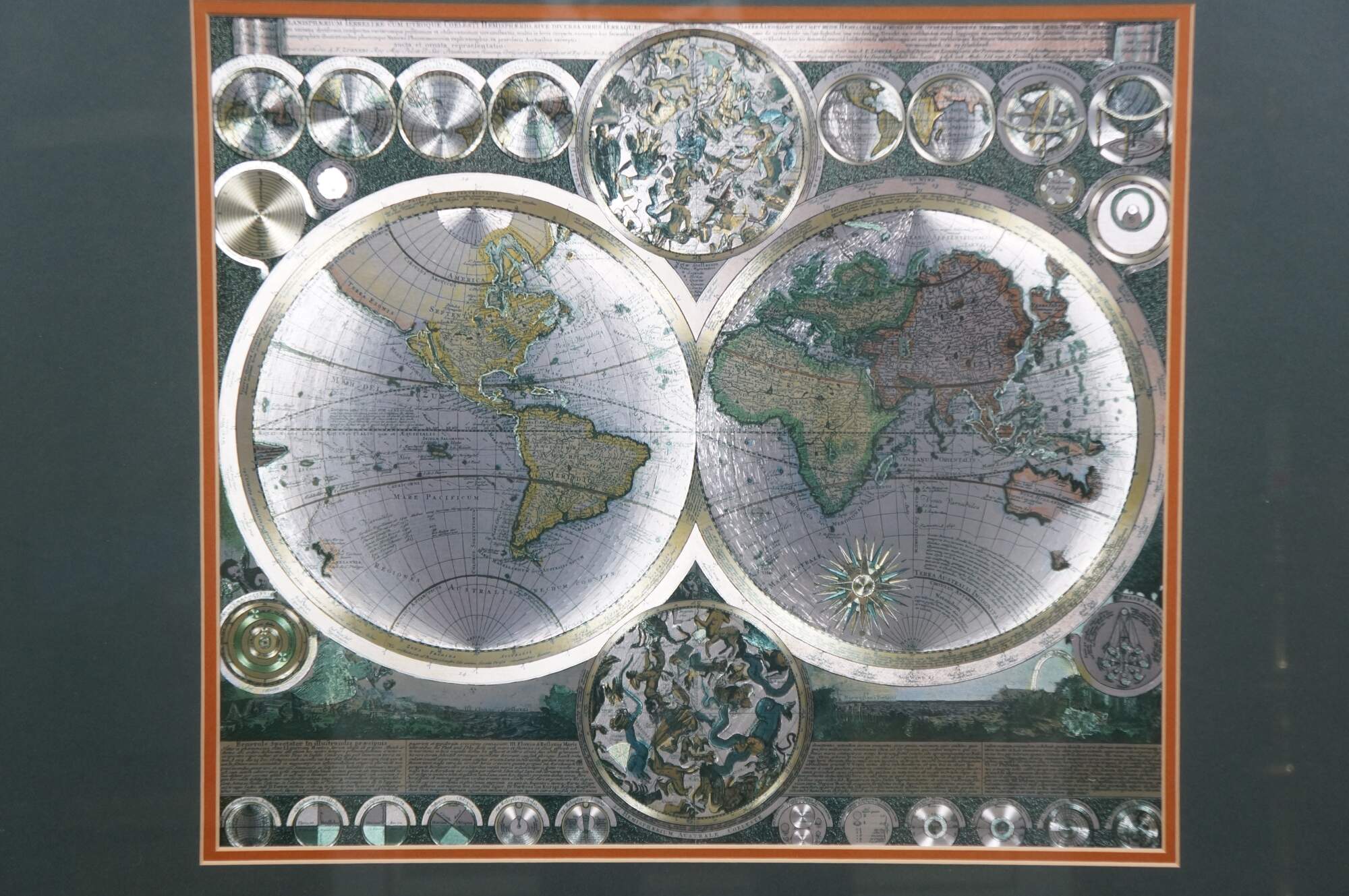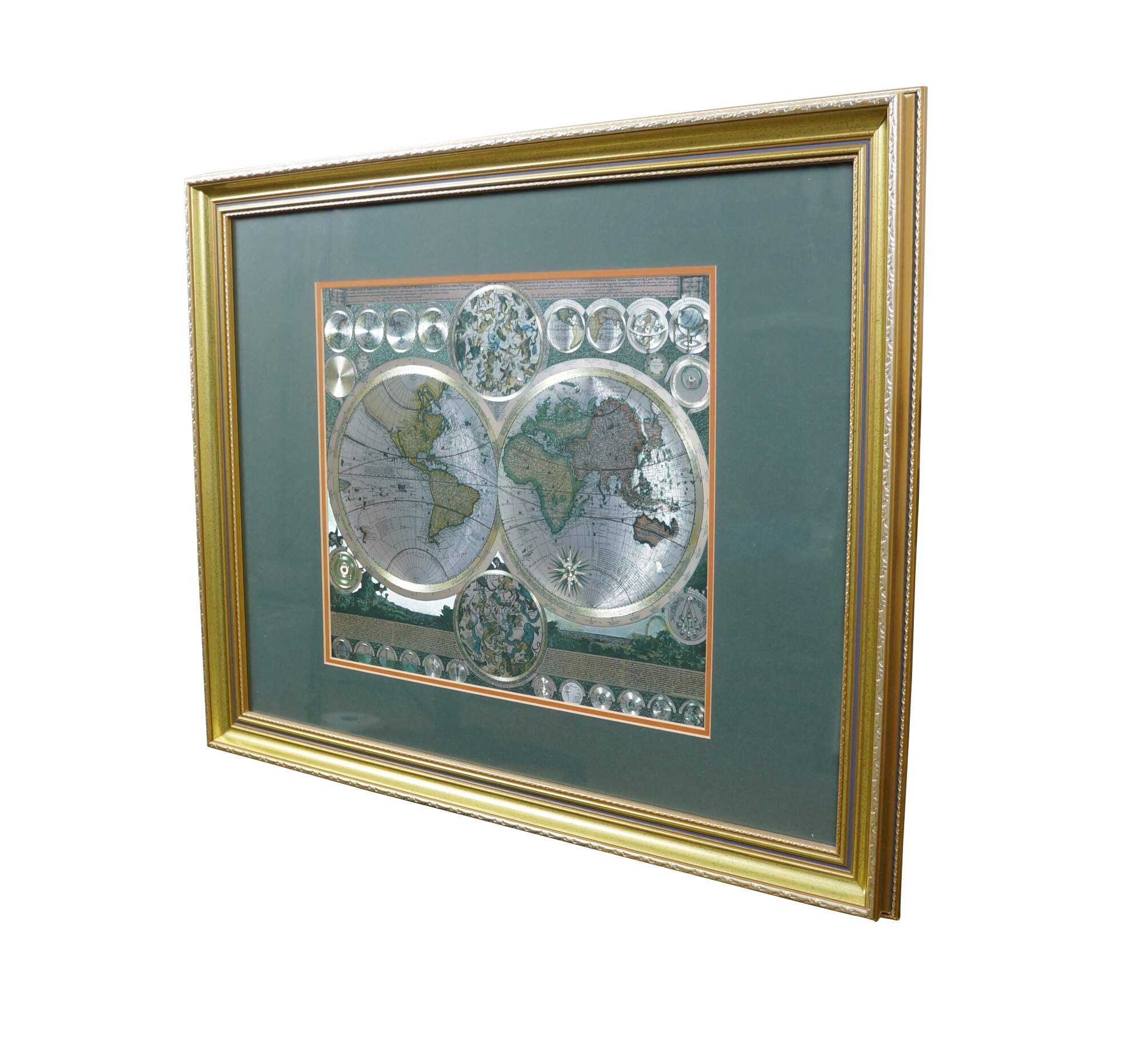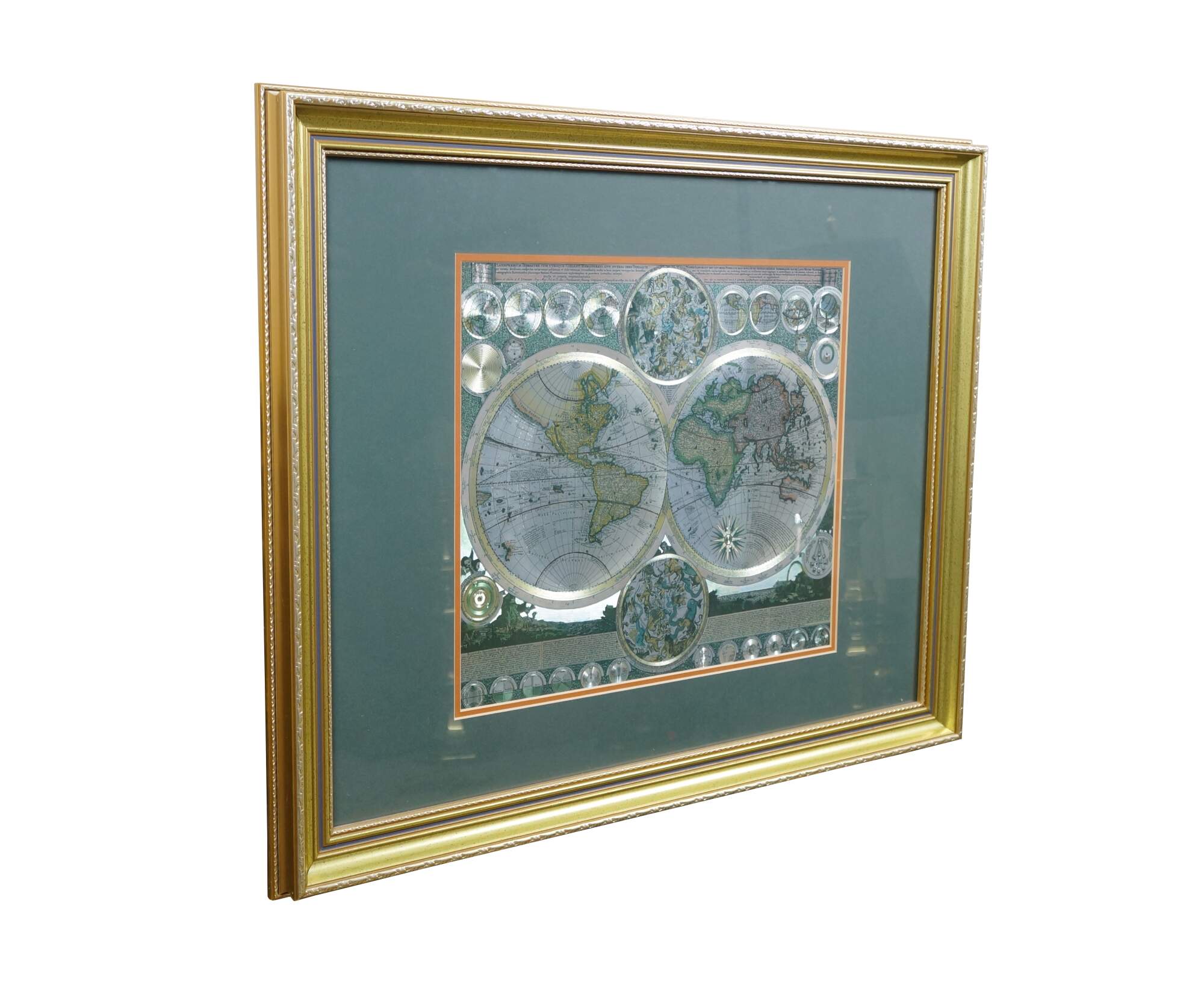 Circa 1970s-1980s silver gilt foil map of the world after Peter Schenk the Elder's Planisphaerium Terrestre cum Utroque Coelesti Hemisphaerio, Sive Diversa Orbis Terraquei (terrestrial planisphere with both celestial hemispheres, or the different parts of the terrestrial globe). Beveled gilt frame; green and orange-brown layered mat.