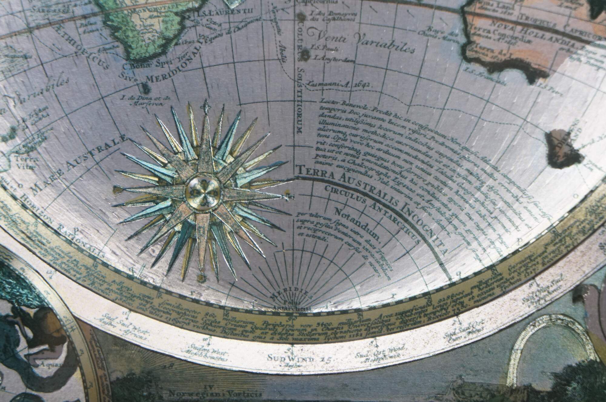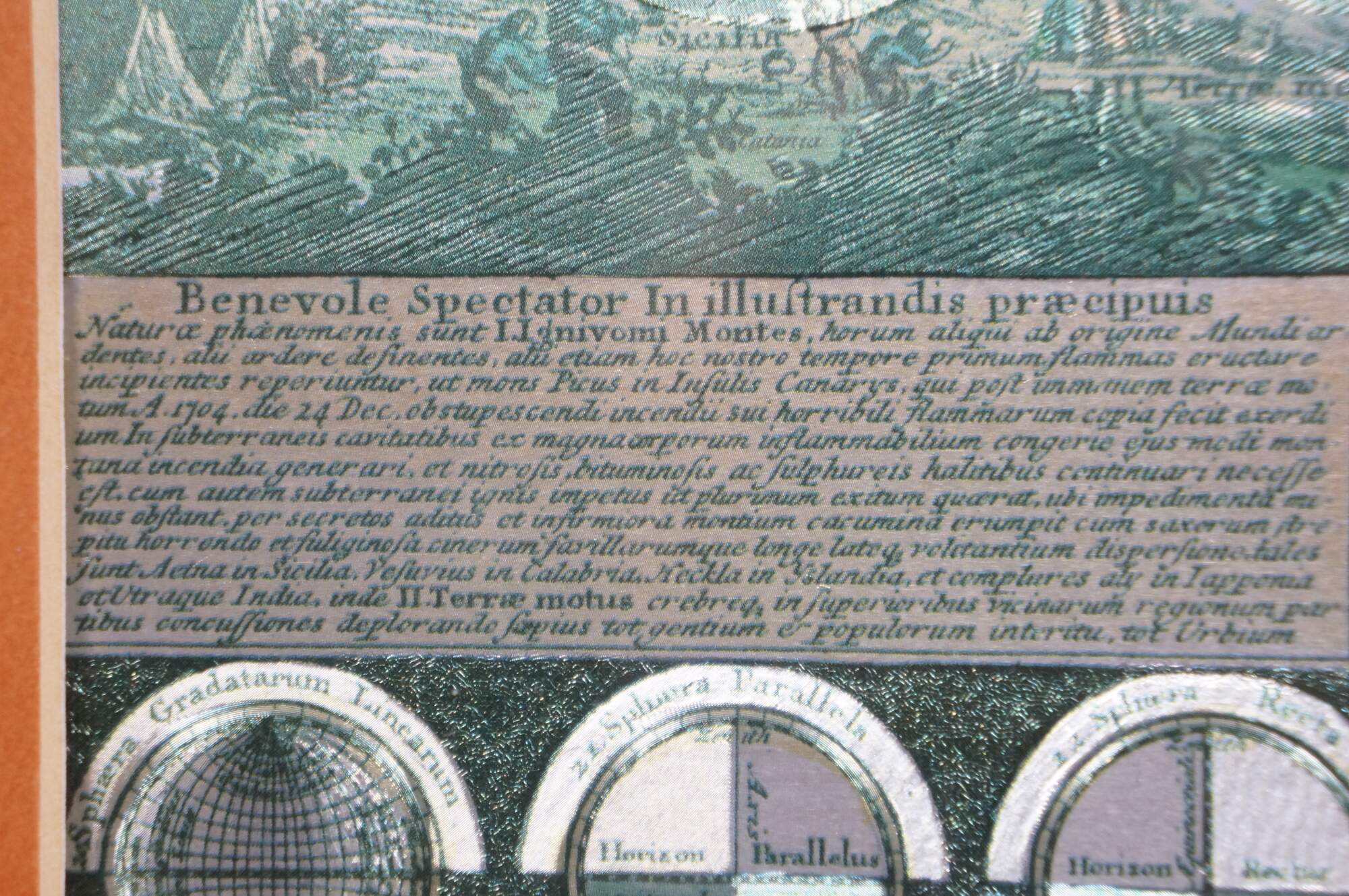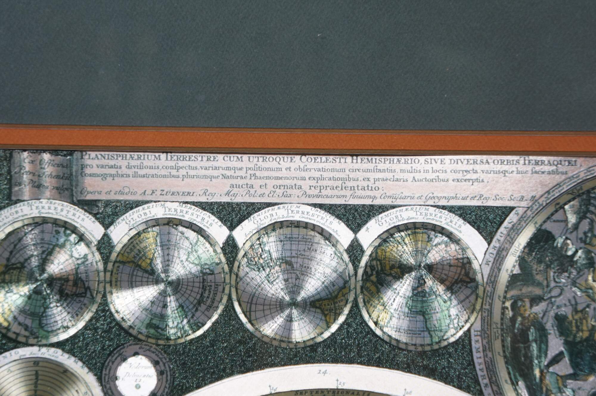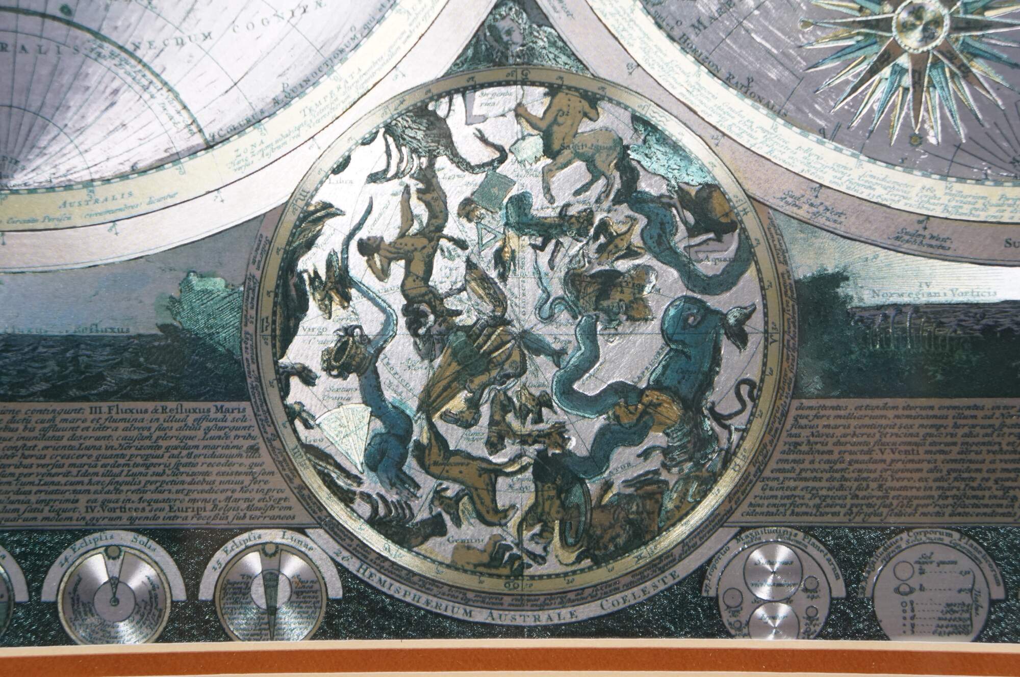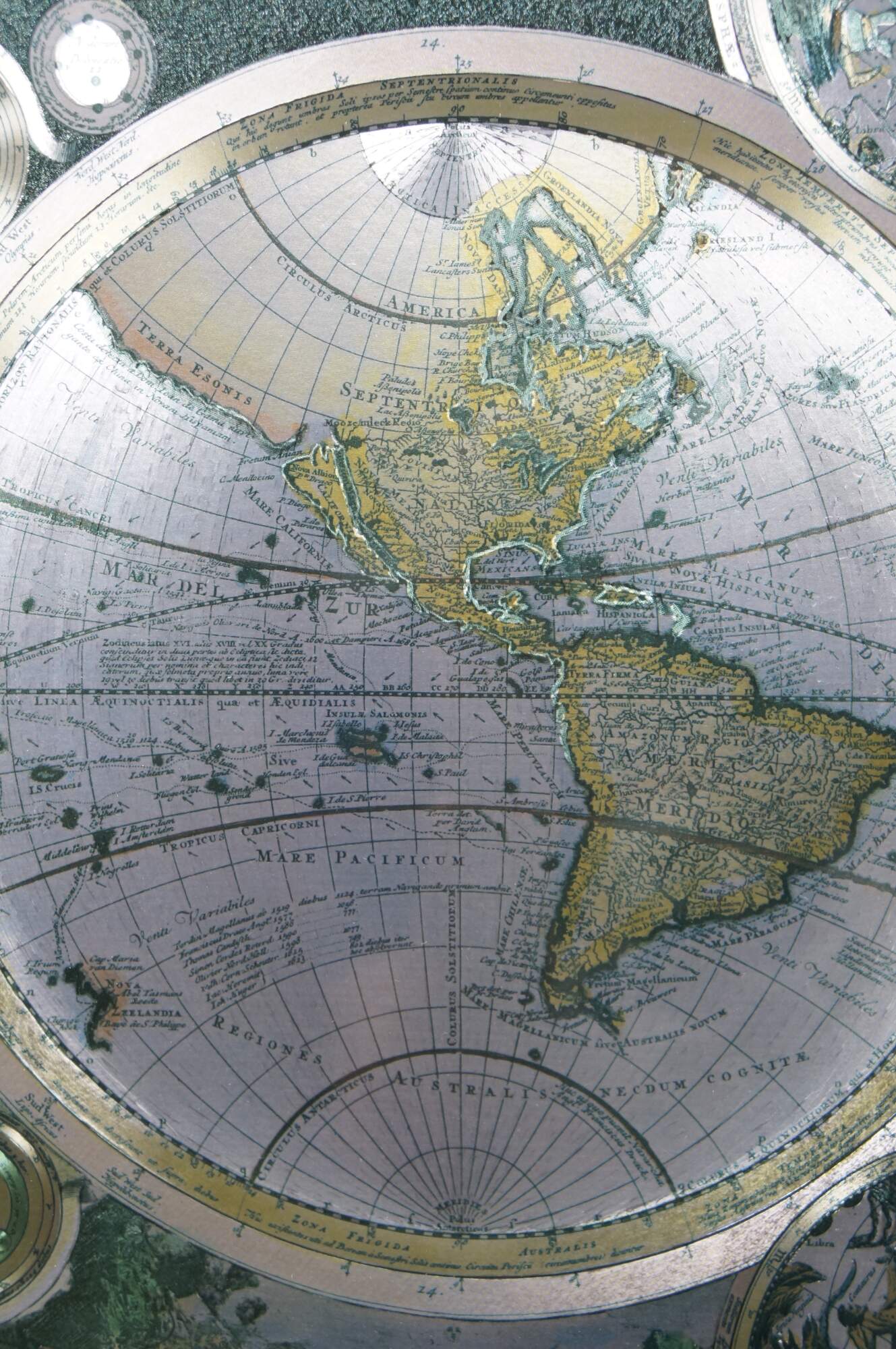 Circa 1970s-1980s silver gilt foil map of the world after Peter Schenk the Elder's Planisphaerium Terrestre cum Utroque Coelesti Hemisphaerio, Sive Diversa Orbis Terraquei (terrestrial planisphere with both celestial hemispheres, or the different parts of the terrestrial globe). Beveled gilt frame; green and orange-brown layered mat.