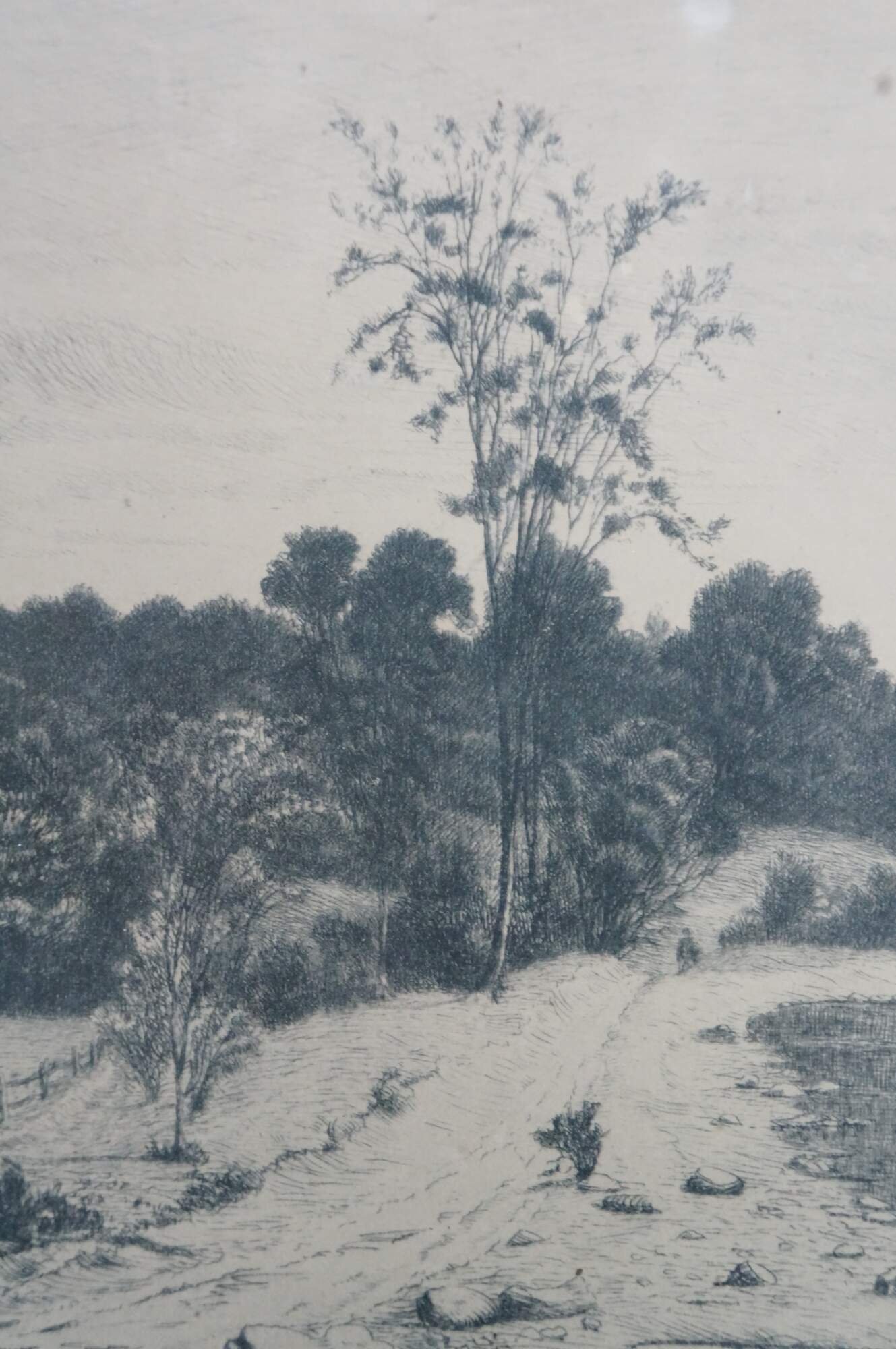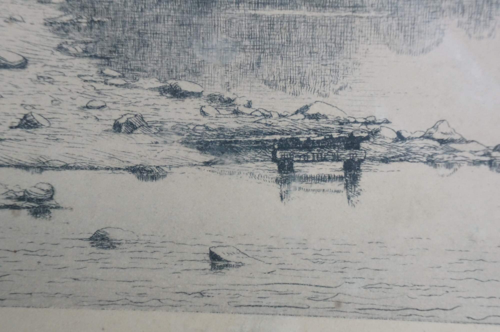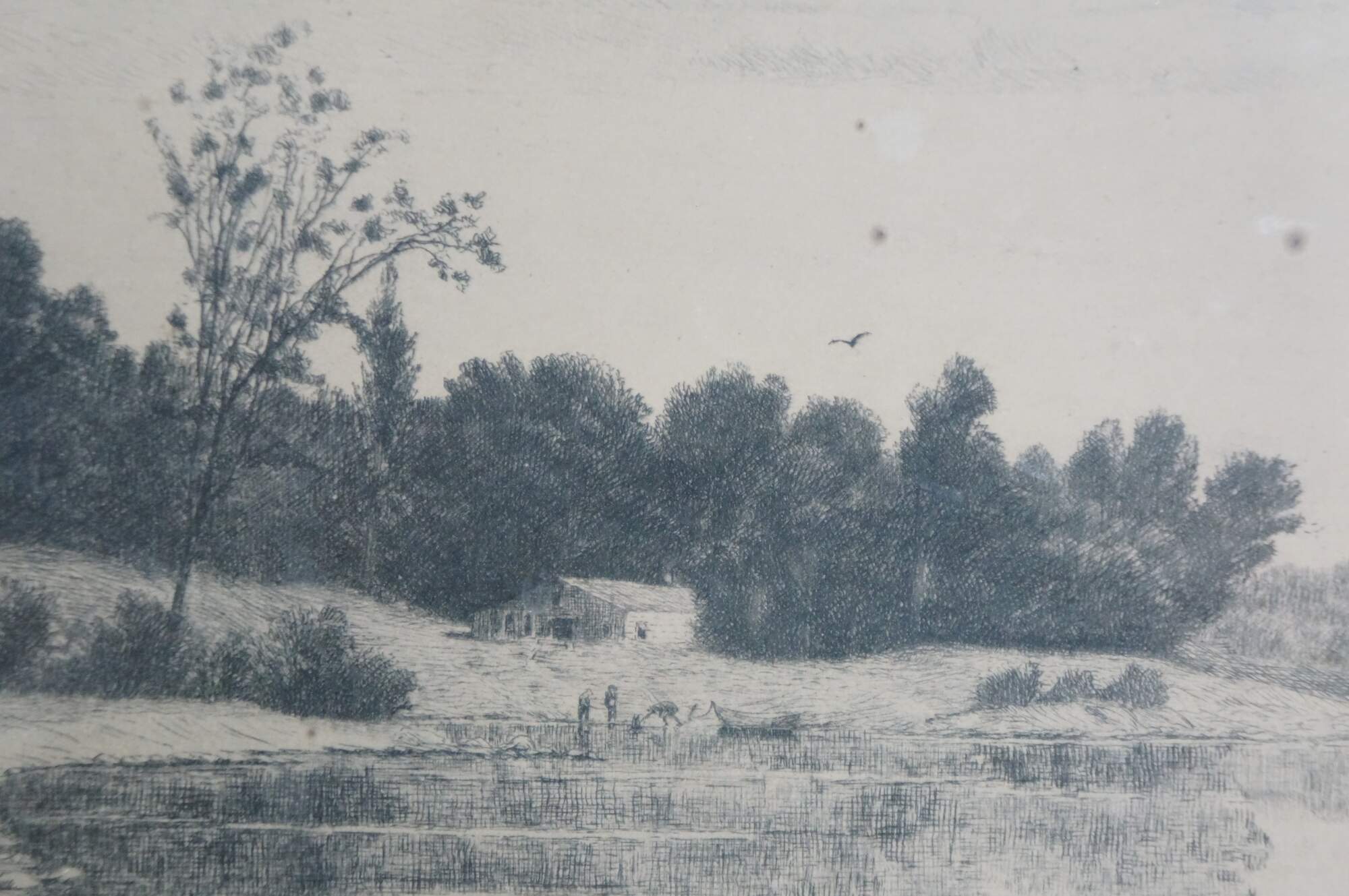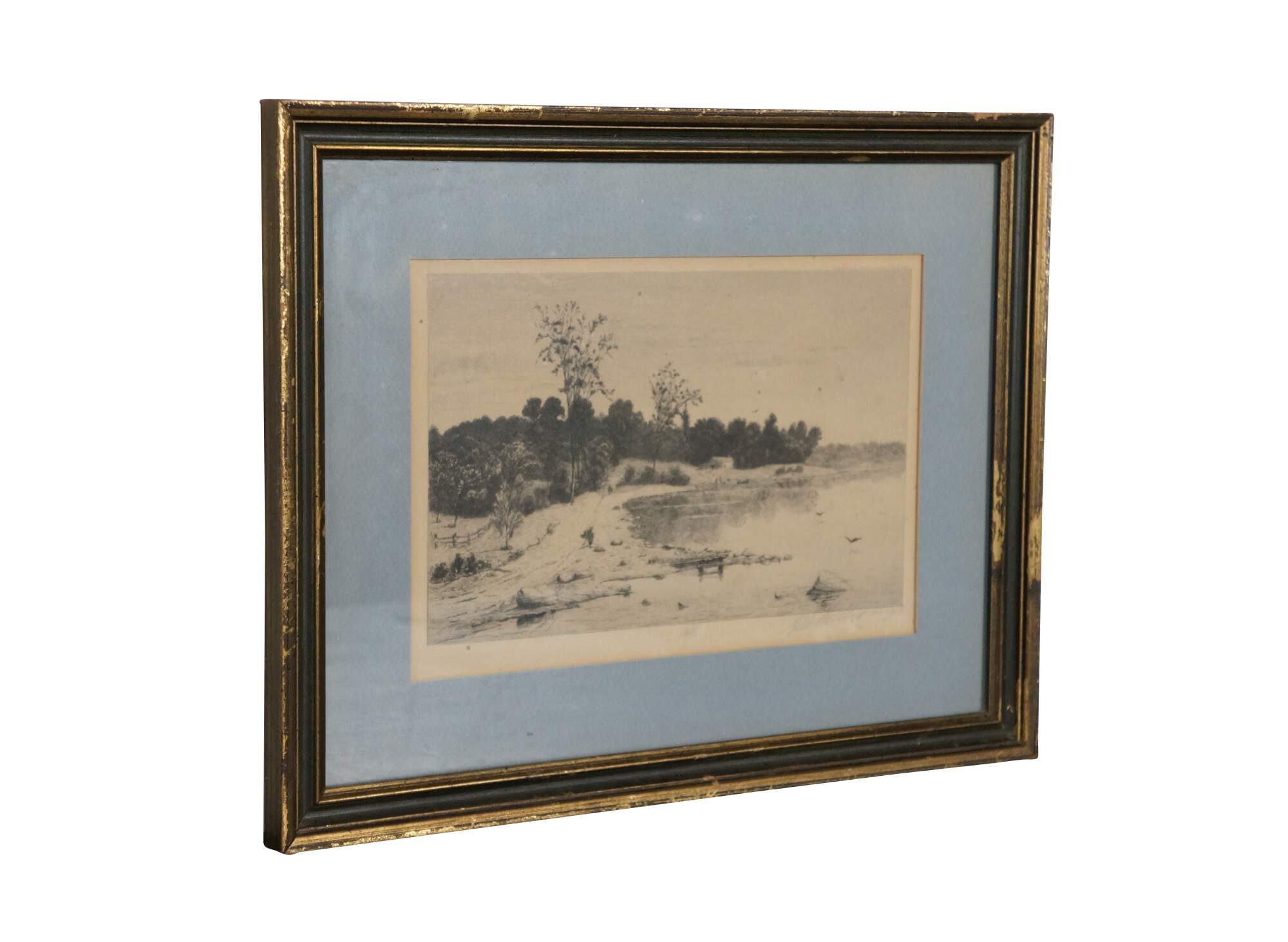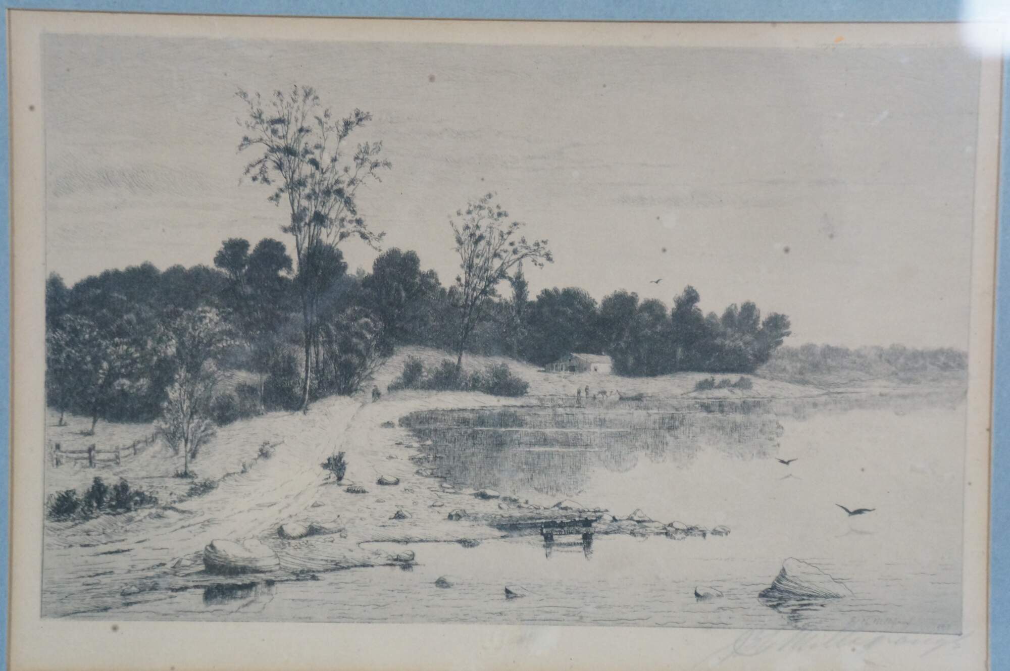 Late 19th century black and white etching by John Hill Millspaugh. Country landscape with figures and a small cottage at the edge of a lake / waterway. Signed in plate and dated 189. Pencil signed, lower right. Copyrighted by Radtke, Lauckner & Co, N.Y. 1889. Gray and gilt wood beveled frame; blue mat.