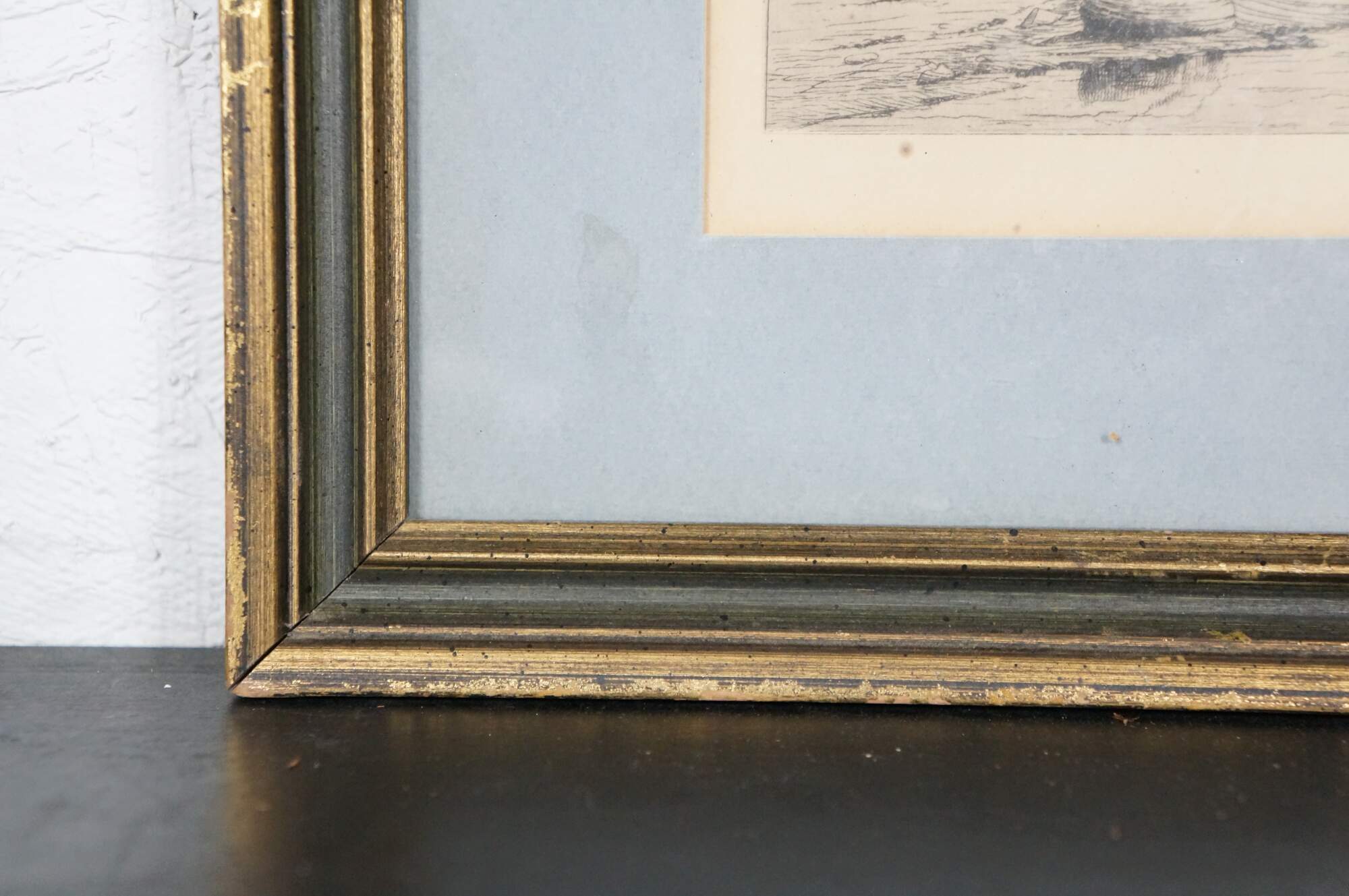 Wear and distressing from age; scraps/scuffs to frame; discoloration foxing to print