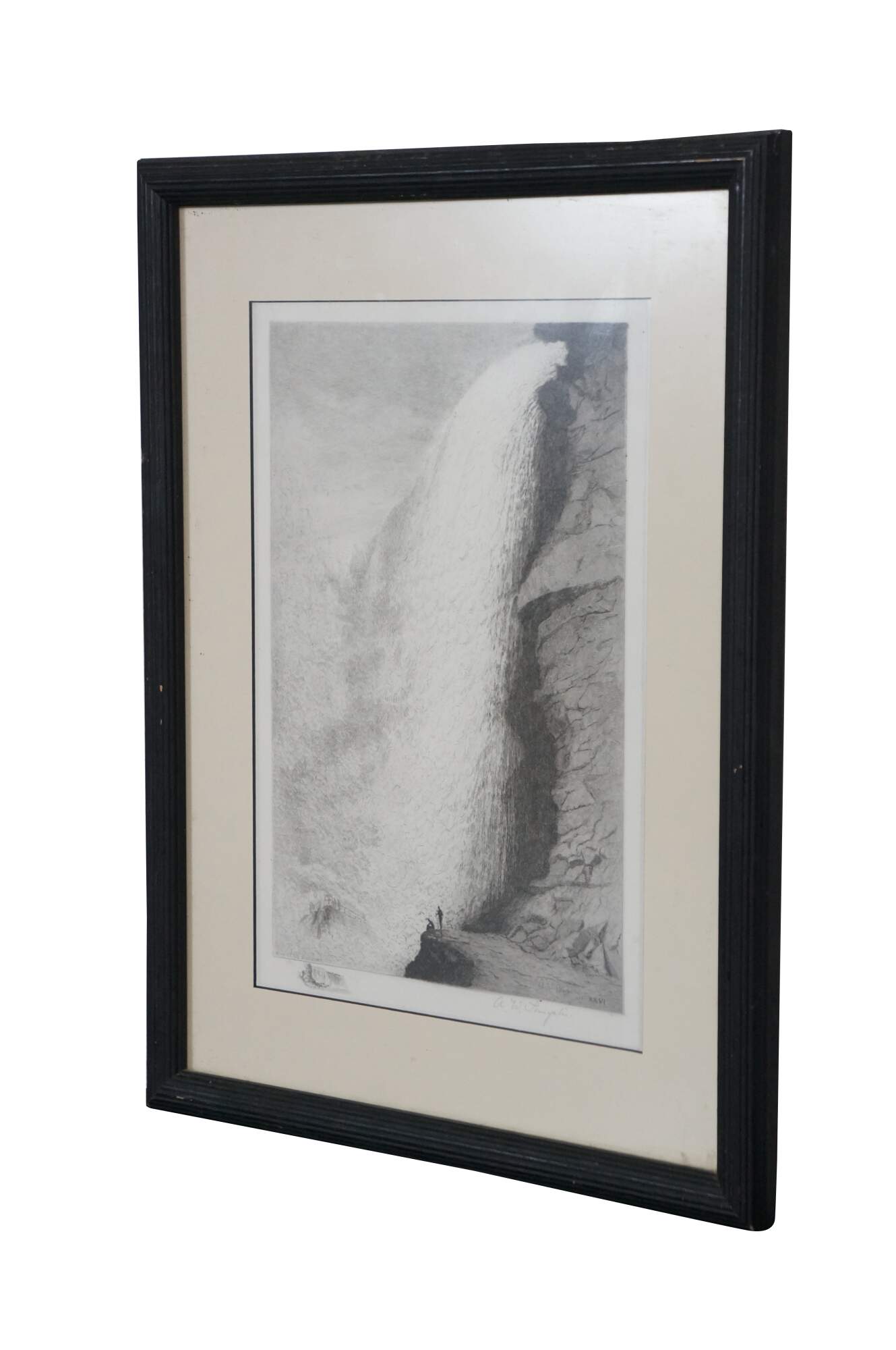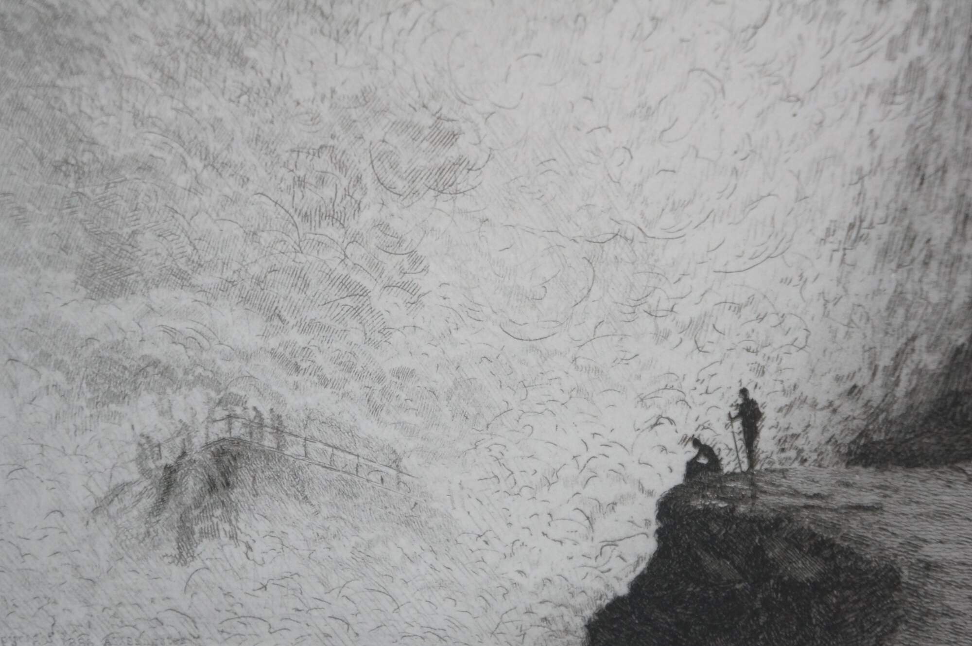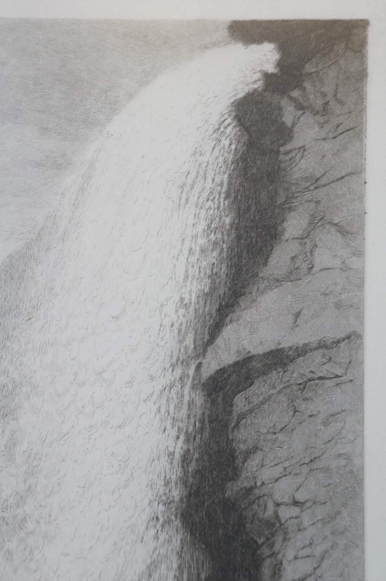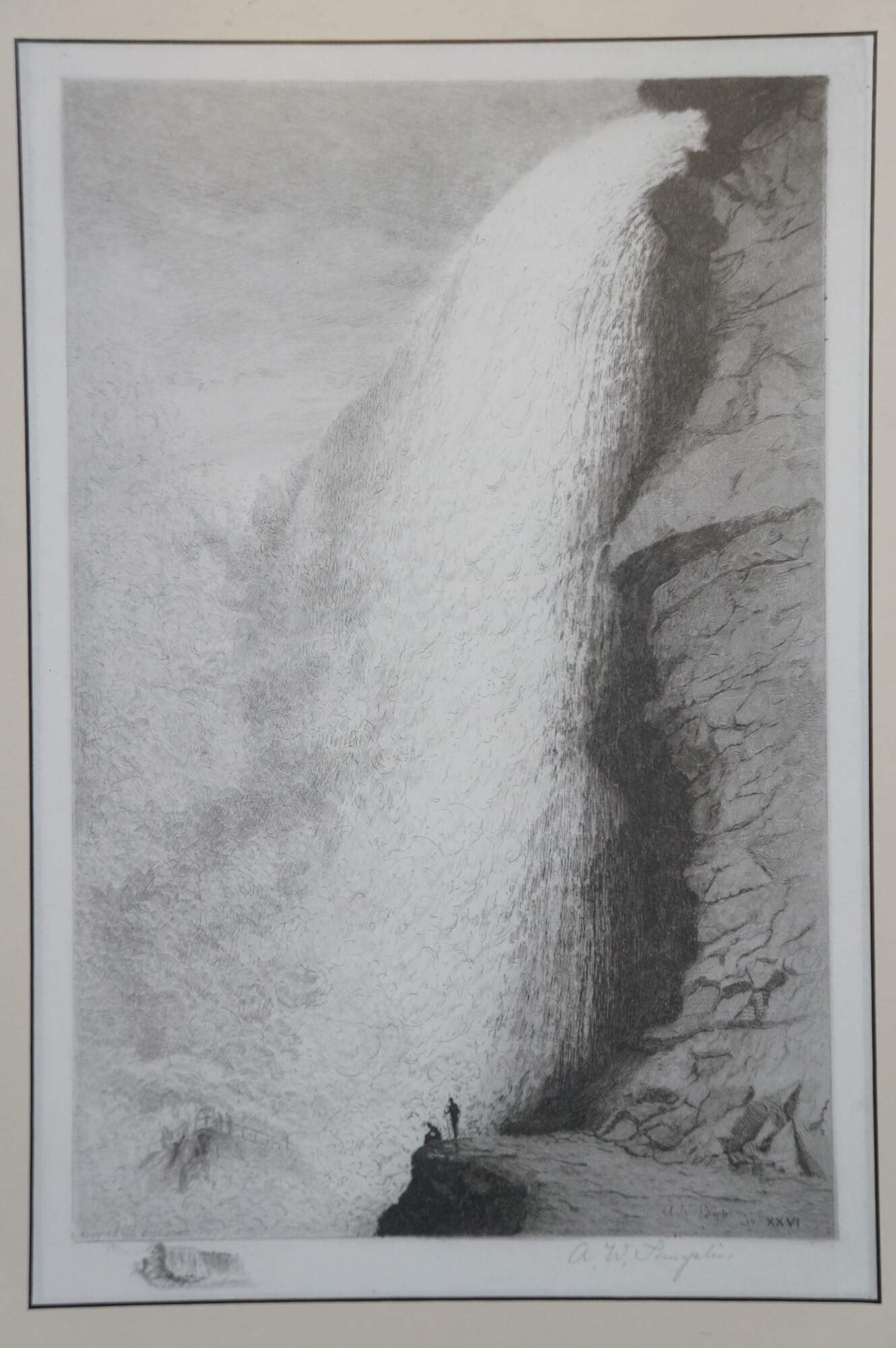 Late 19th century black and white etching by Amos W. Sangster titled "Entrance to Cave of the Winds, Niagra Falls, American Side." A view of figures standing next to an immense waterfall and sheer rocky cliff face. Copyright 1886. Signed in plate and numbered XXVI. Remarke of a waterfall, lower left. Pencil signed, lower right. Black painted grooved frame; white and black layered mat.