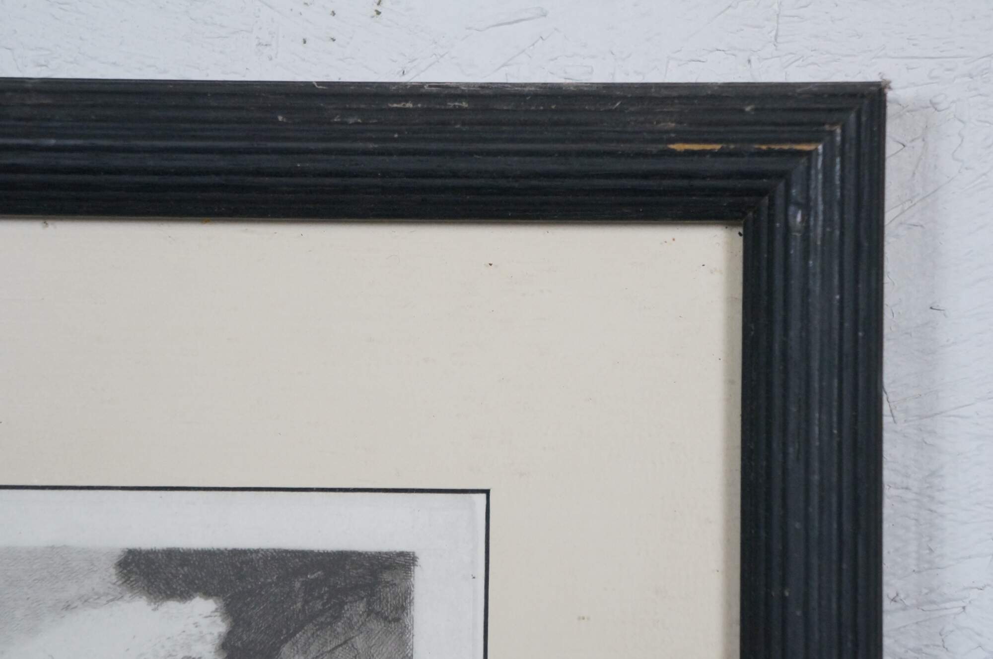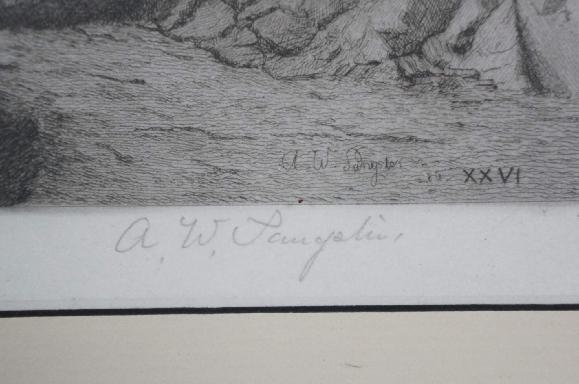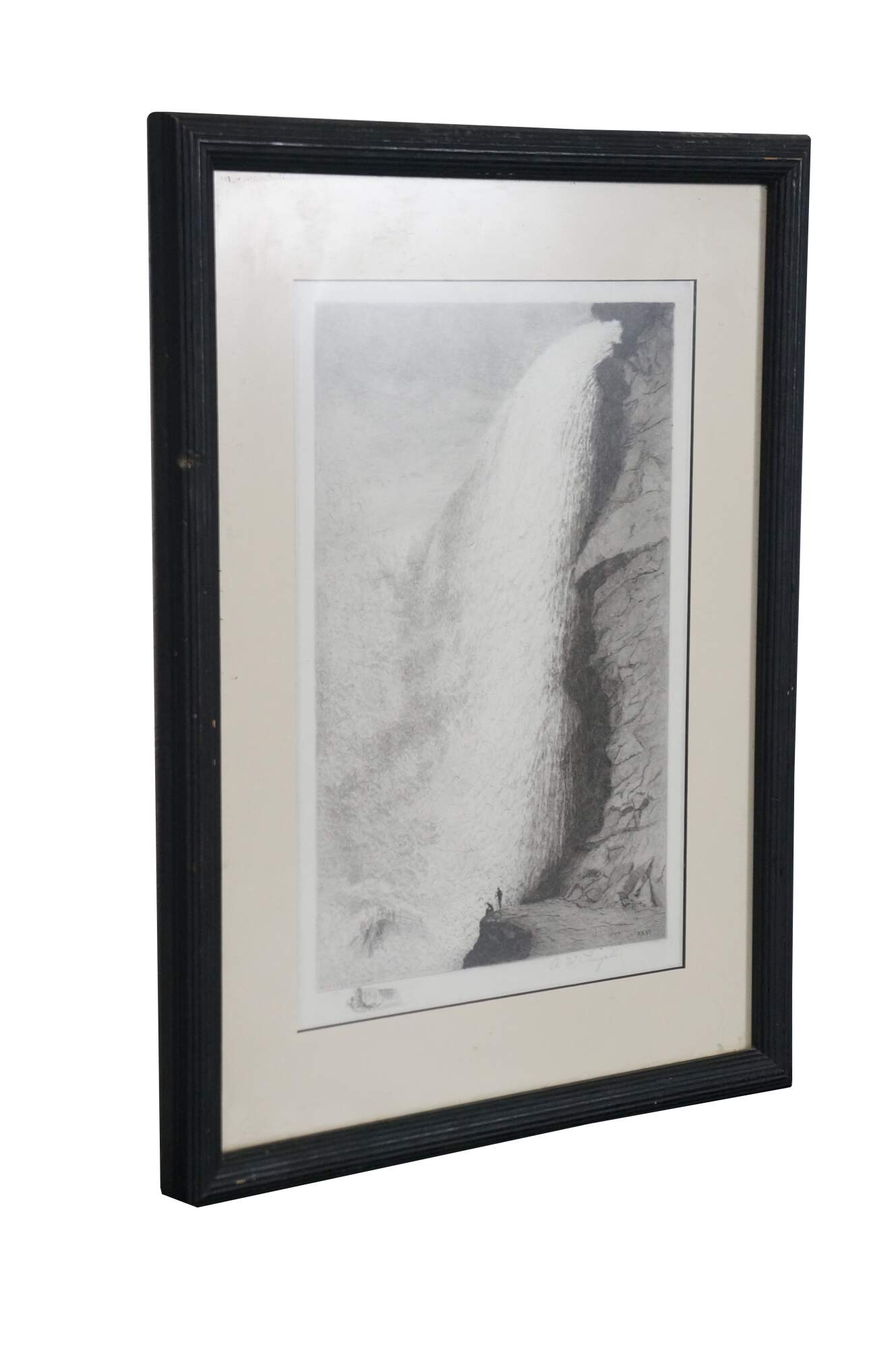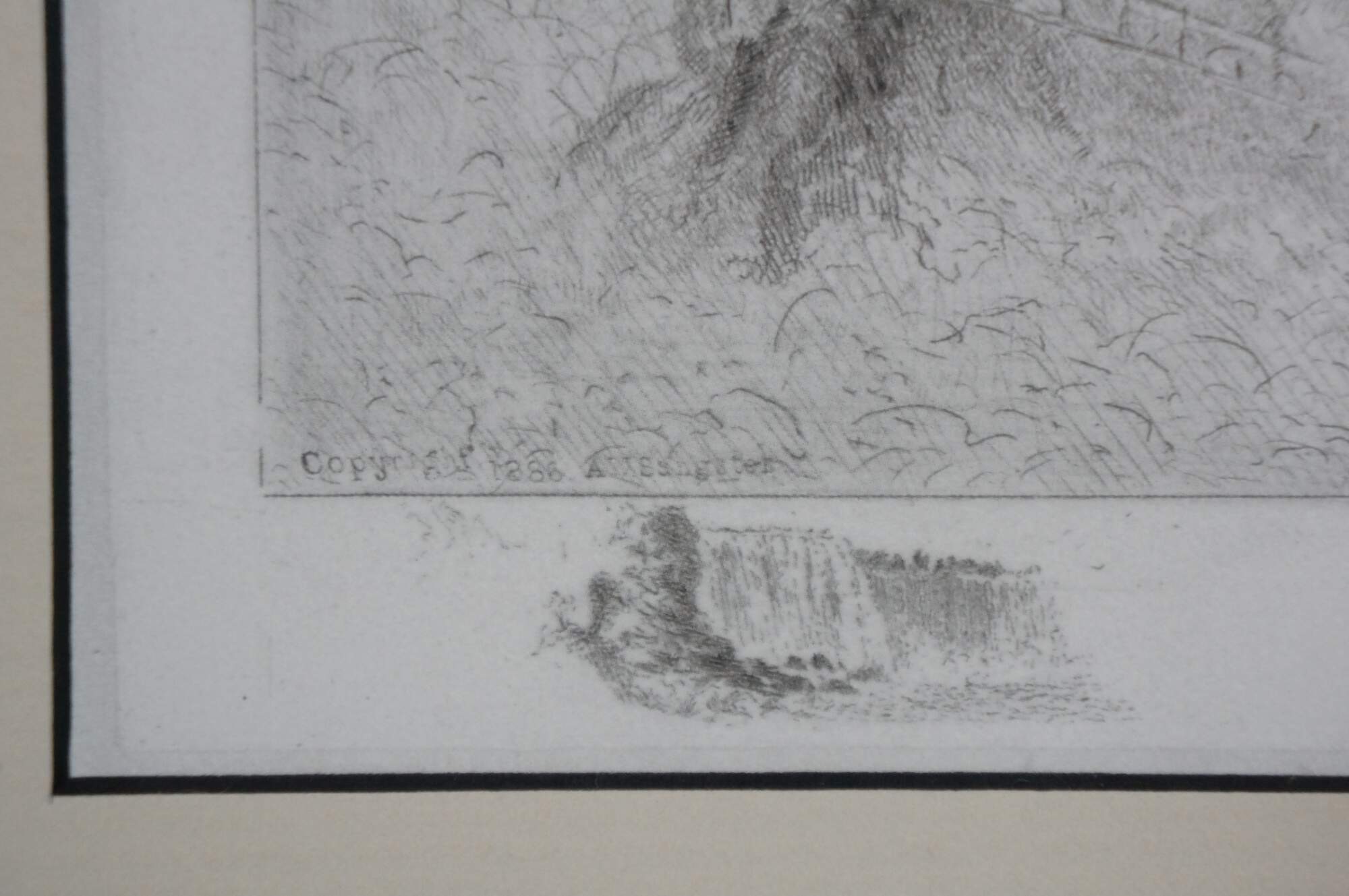 Late 19th century black and white etching by Amos W. Sangster titled "Entrance to Cave of the Winds, Niagra Falls, American Side." A view of figures standing next to an immense waterfall and sheer rocky cliff face. Copyright 1886. Signed in plate and numbered XXVI. Remarke of a waterfall, lower left. Pencil signed, lower right. Black painted grooved frame; white and black layered mat.