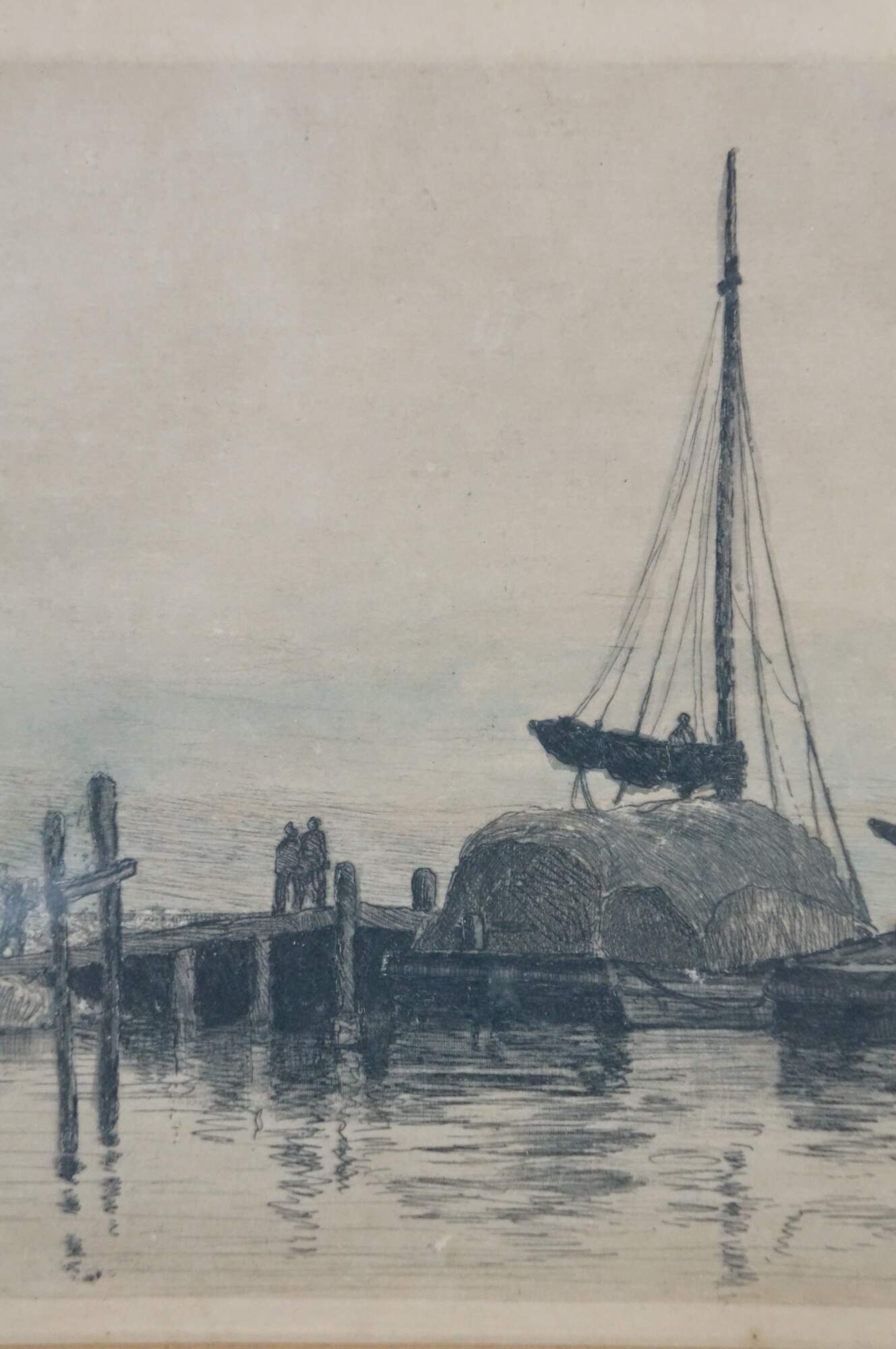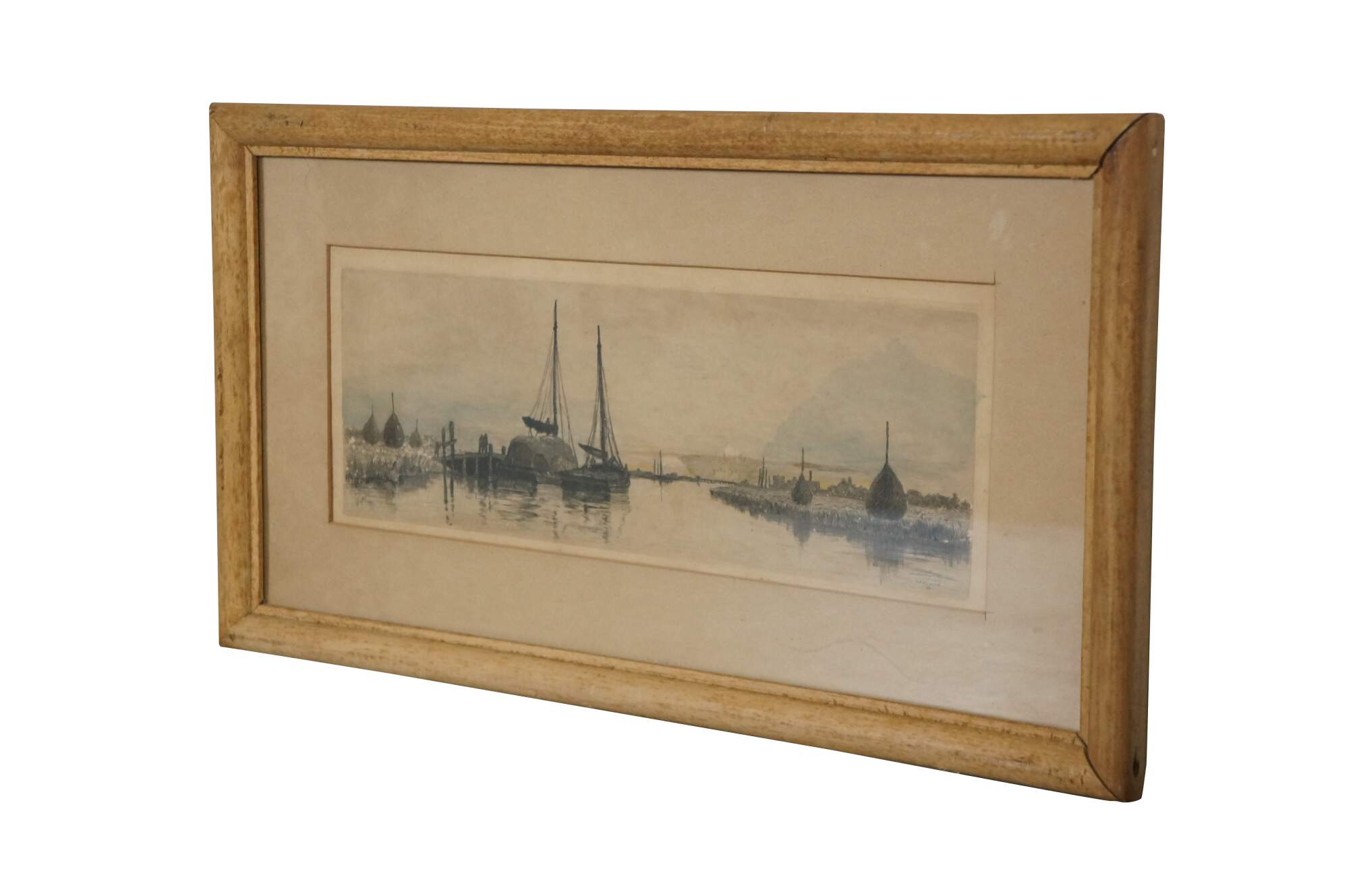 Late 19th century hand colored etching by Charles Frederick Mielatz. Panoramic landscape / waterscape view of a river / causeway with boats. Signed in plate / dated 89. Unstained, rounded wood frame; beige mat.