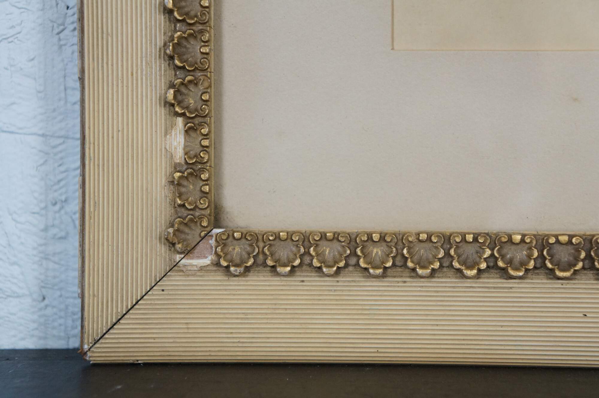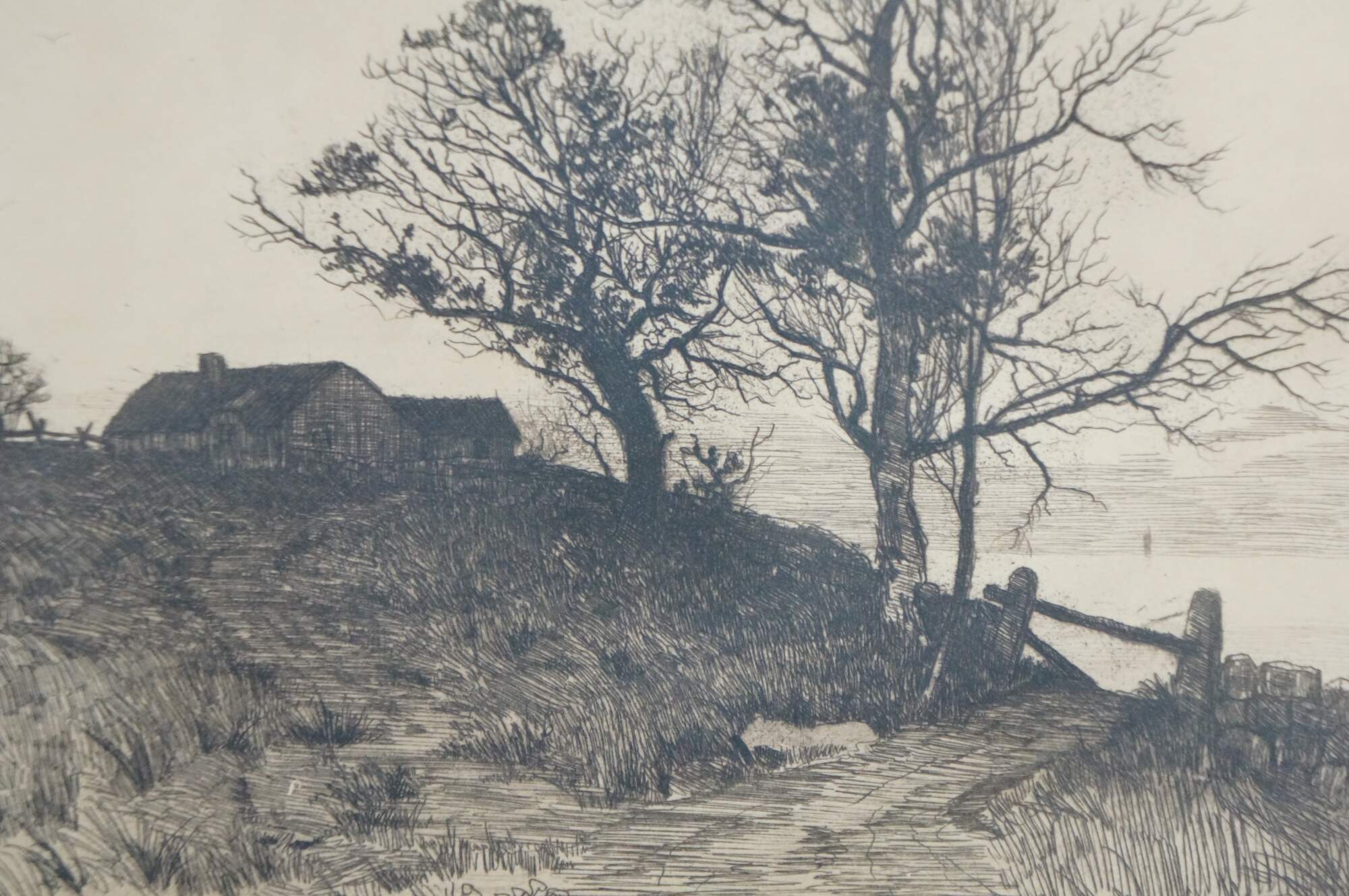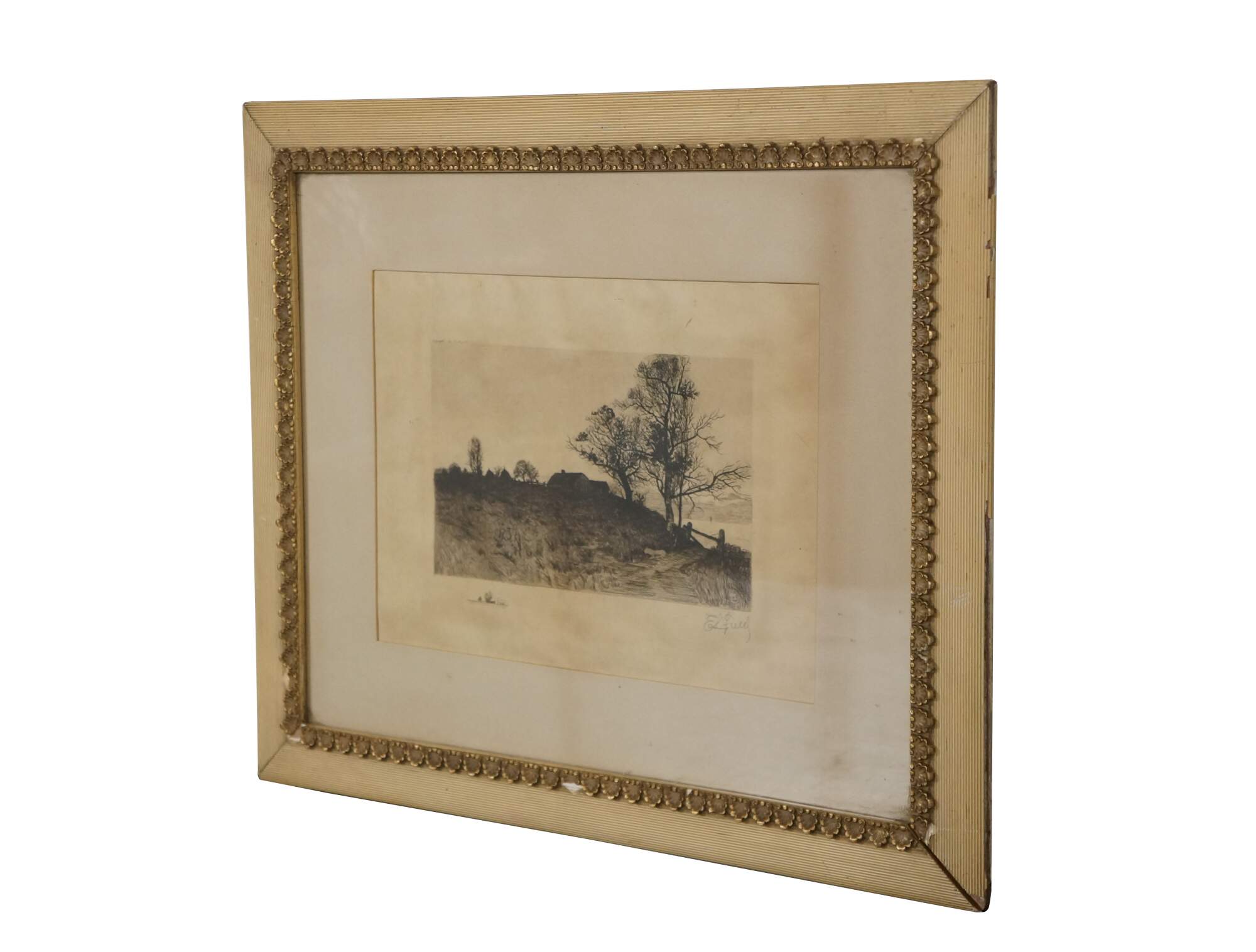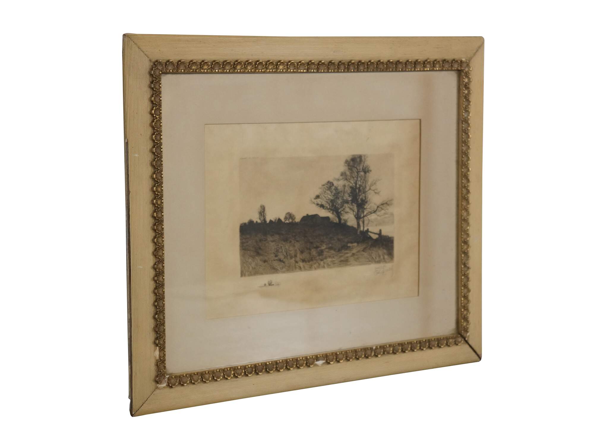 Late 19th century black and white etching by Edward Loyal Fields. Landscape showing a country lane and a house on a hill. Remarke of a farmhouse, lower left. Signed in plate, right. Pencil signed, lower right. Grooved white plastic over wood with gilt scallop shell trim; white mat.