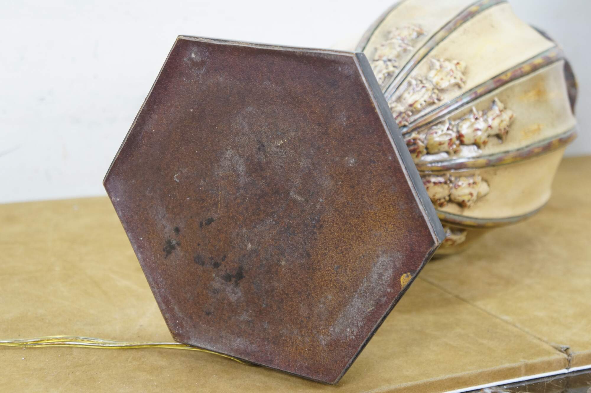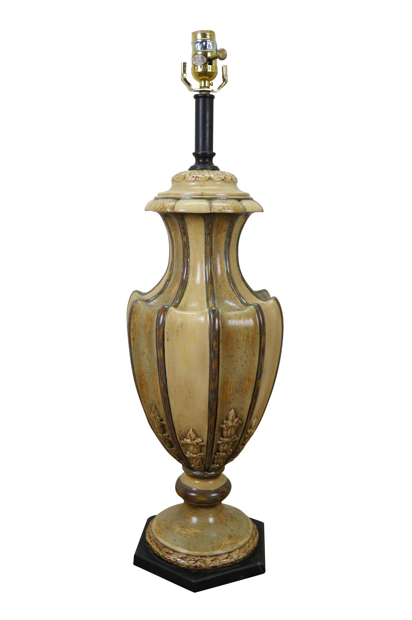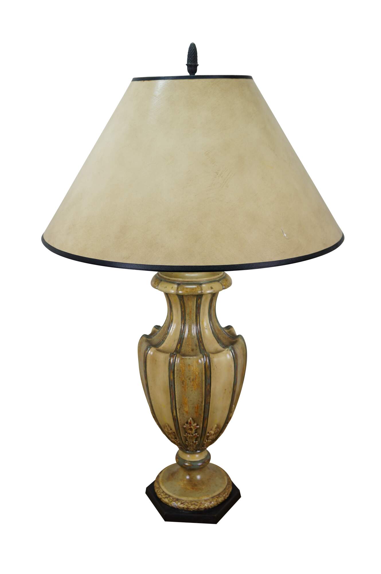 Pair of late 20th to early 21st century resin vase / urn shaped table lamps. Neoclassically inspired styling twith a painted antiqued finish and ancanthus leaf details, set on hexagonal wood bases. Includes harps, pineapple shaped bronze finials and beige paper shades with foild interiors.