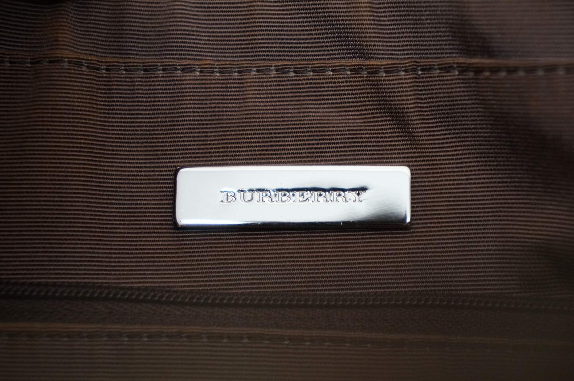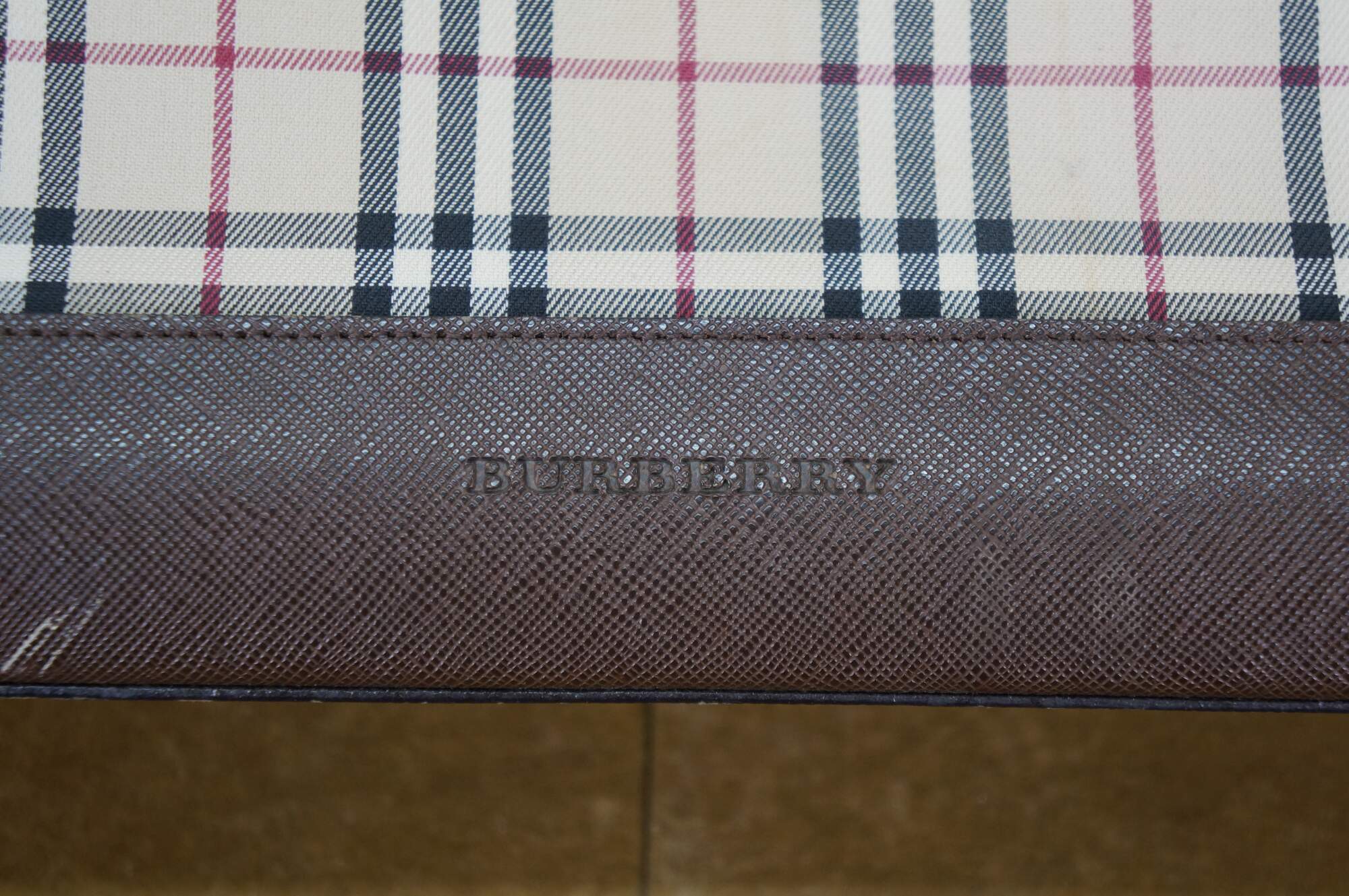 Vintage Burberry tote bag / purse in beige Nova check coated canvas with dark brown leather base, trim and double handles. Silver tone feet on base. Two large slip pockets flanking center compartment with zipper closure. Two interior slip pockets and one interior zippered pocket. Brown fabric lining.