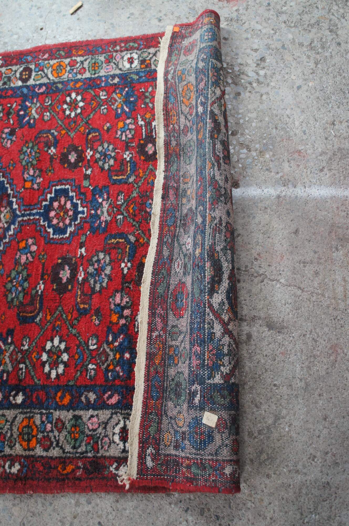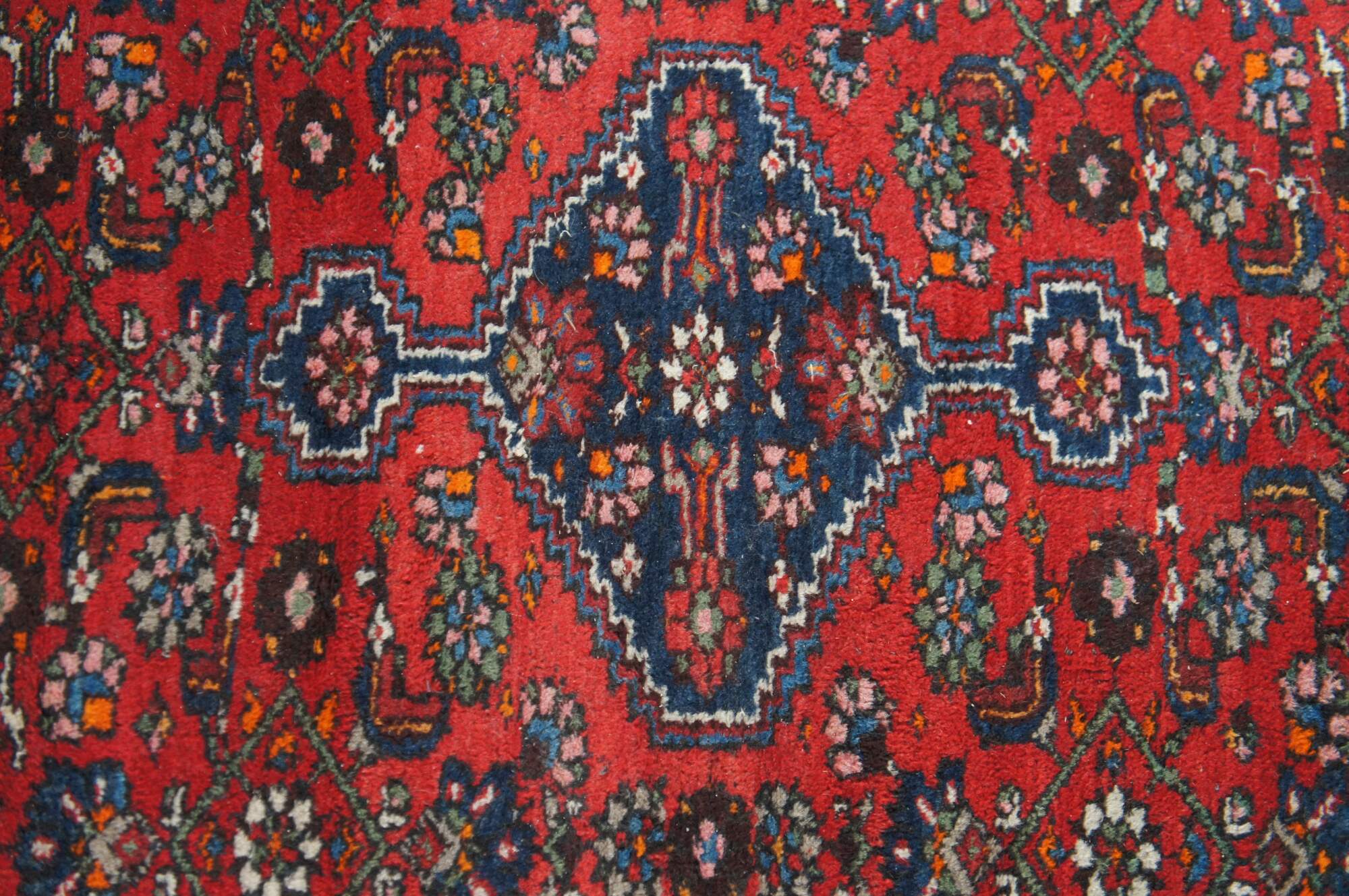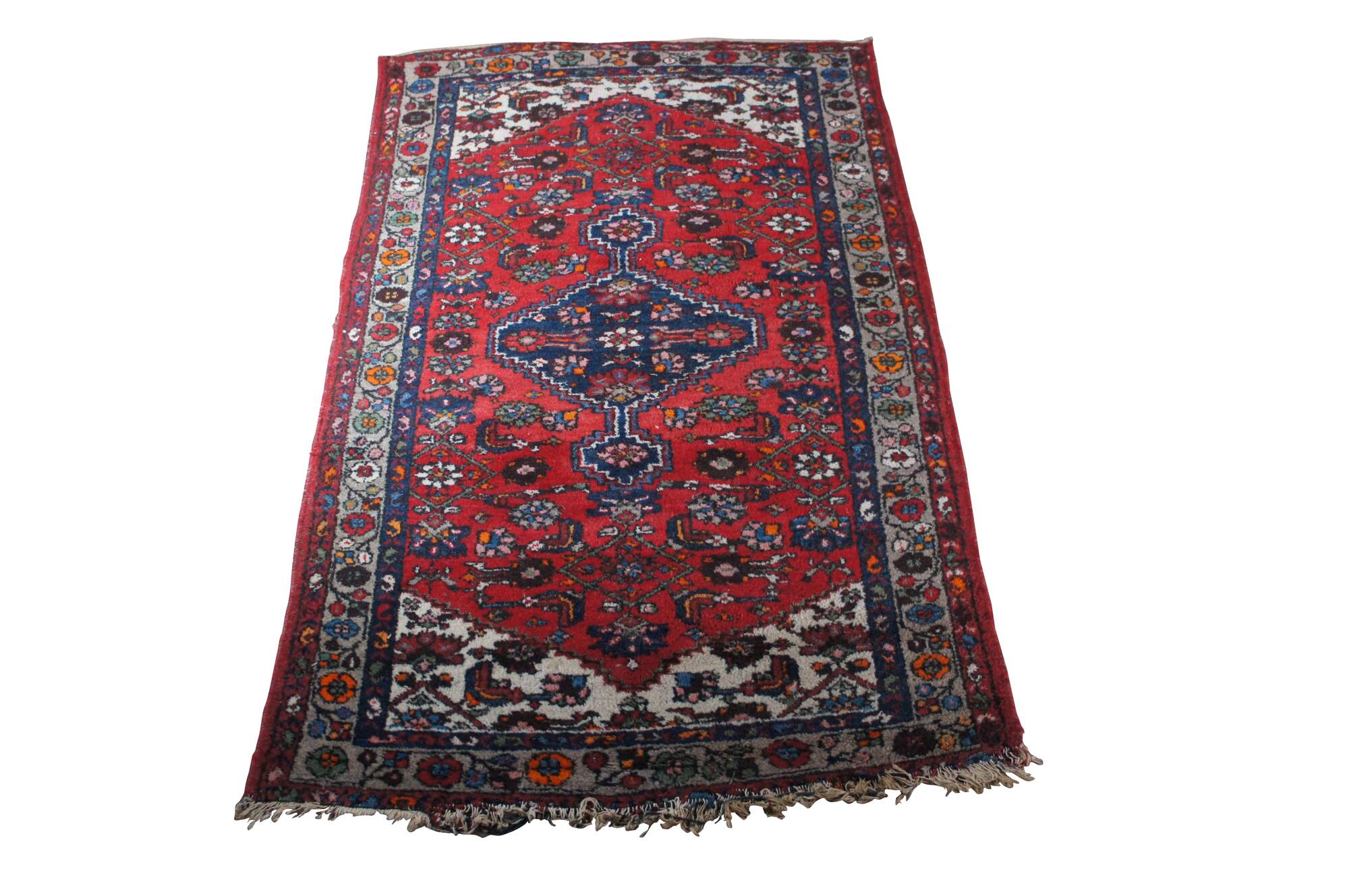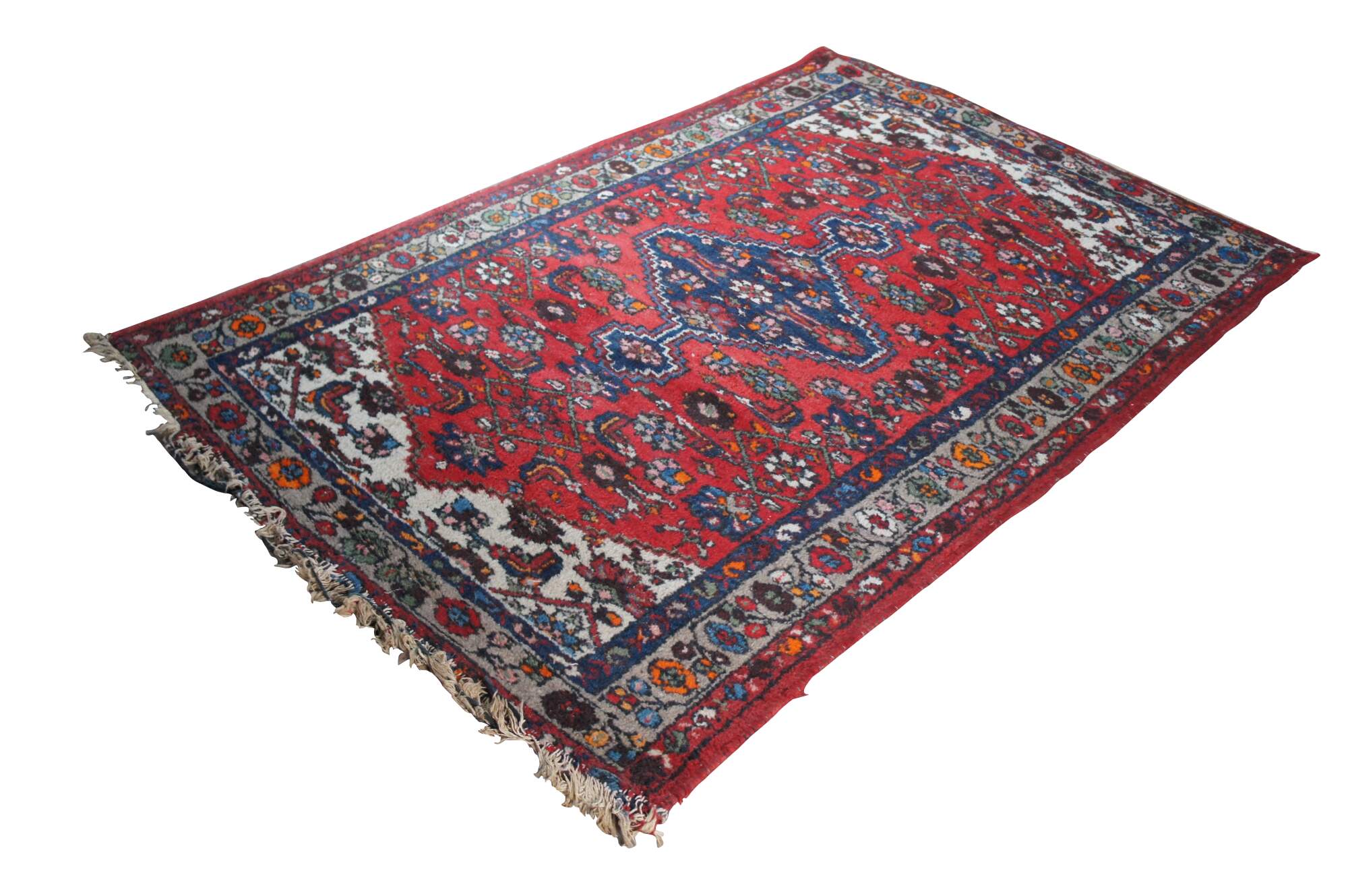 An oriental area rug or carpet, circa 1980s. Features a red foreground with geometric medallion and foliate fetail. Features shades of blue, green, orange and beige