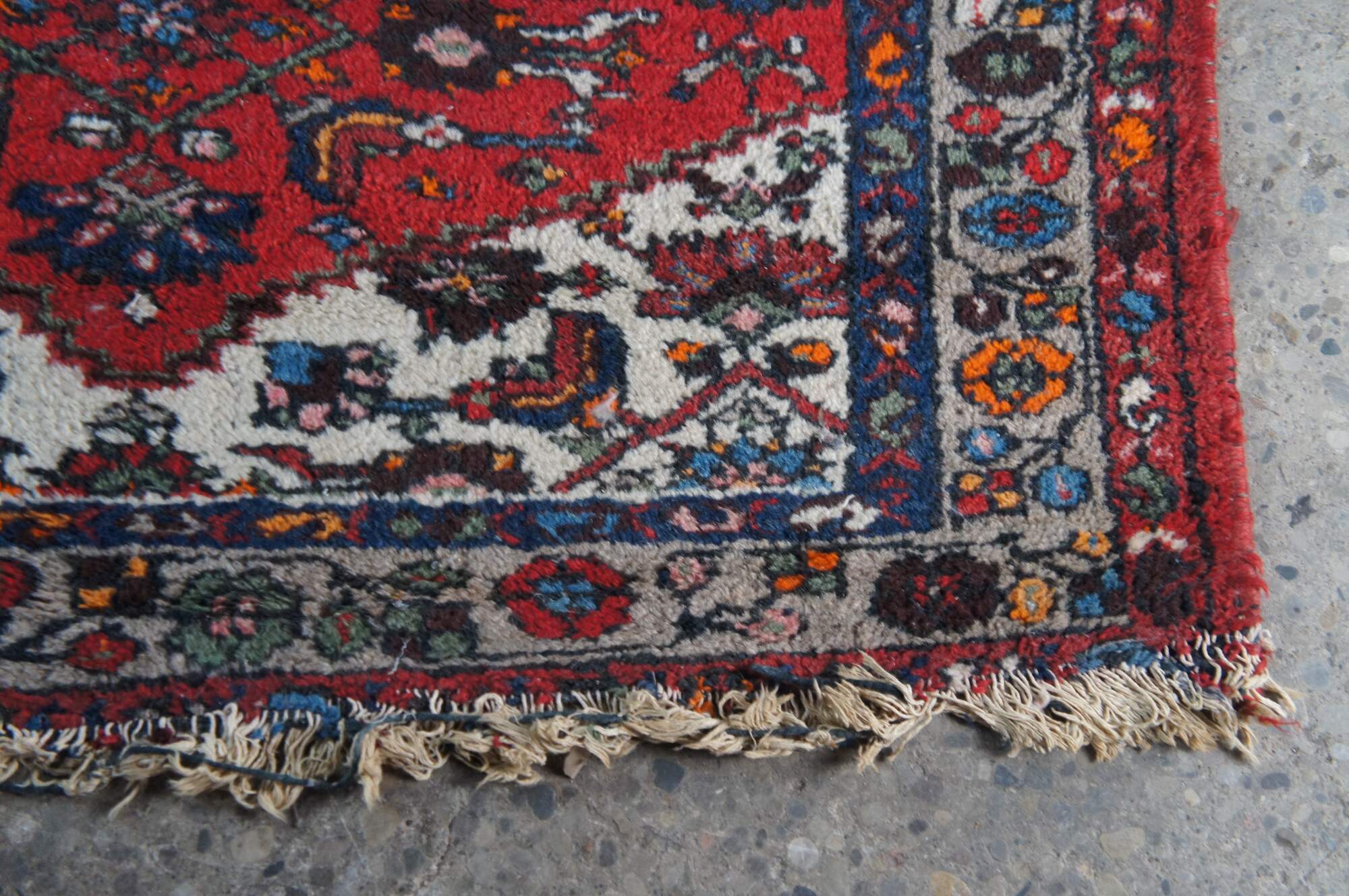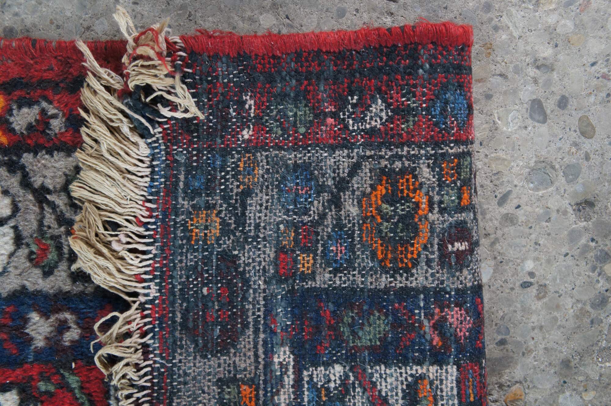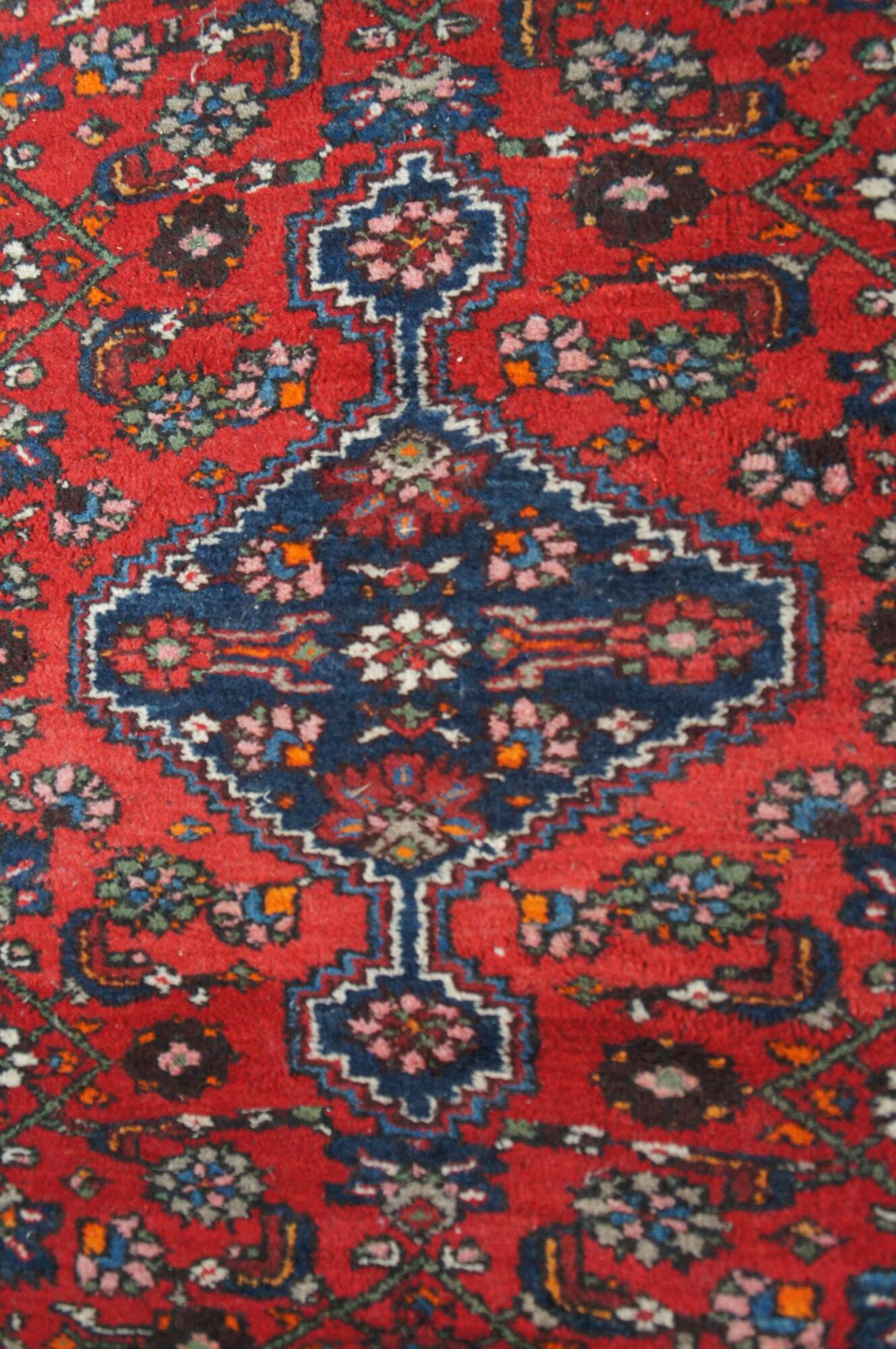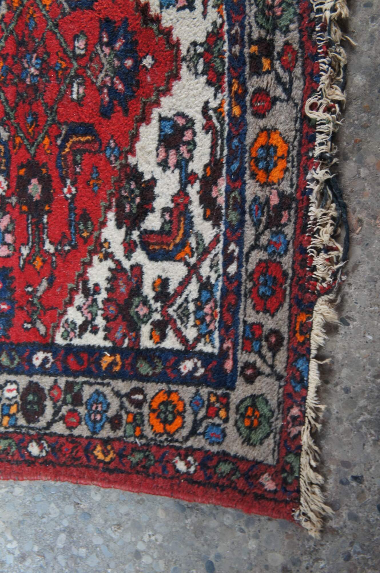 An oriental area rug or carpet, circa 1980s. Features a red foreground with geometric medallion and foliate fetail. Features shades of blue, green, orange and beige