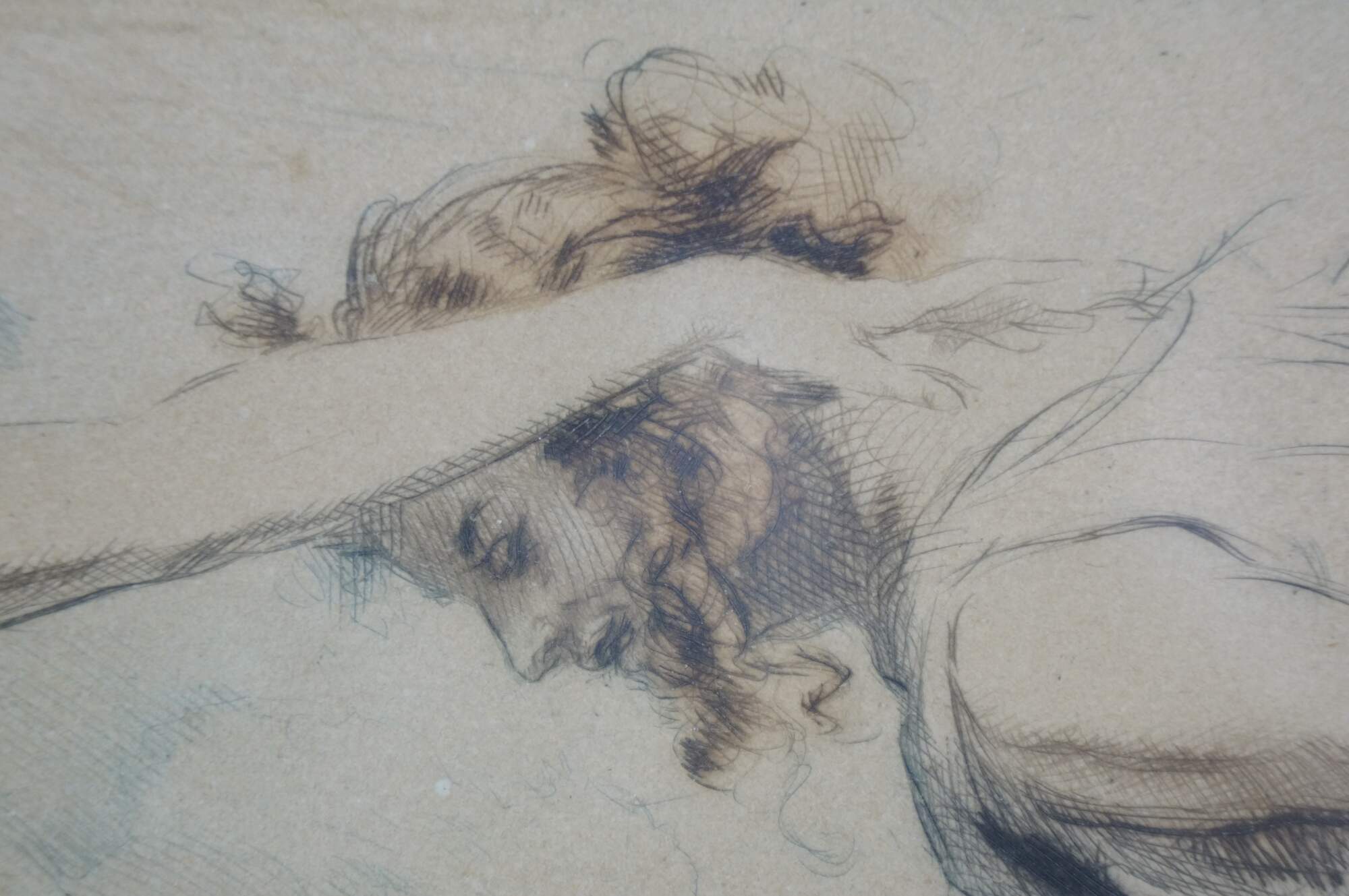 Vintage colored etching depicting a man and woman dressed in classical Grecian style clothing dancing gracefully on the beach with figures in the background. Pencil signed and titled, lower edge. Gilt painted and crackled beveled frame; no mat.