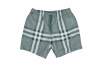 Vintage Burberry London England men's sage green plaid swim shorts / swim trunks. Two front side pockets; key loop; right hand watch pocket. One velcro flap back pocket. Elastic and drawstring waist. Mesh lining. Made in Thailand.
