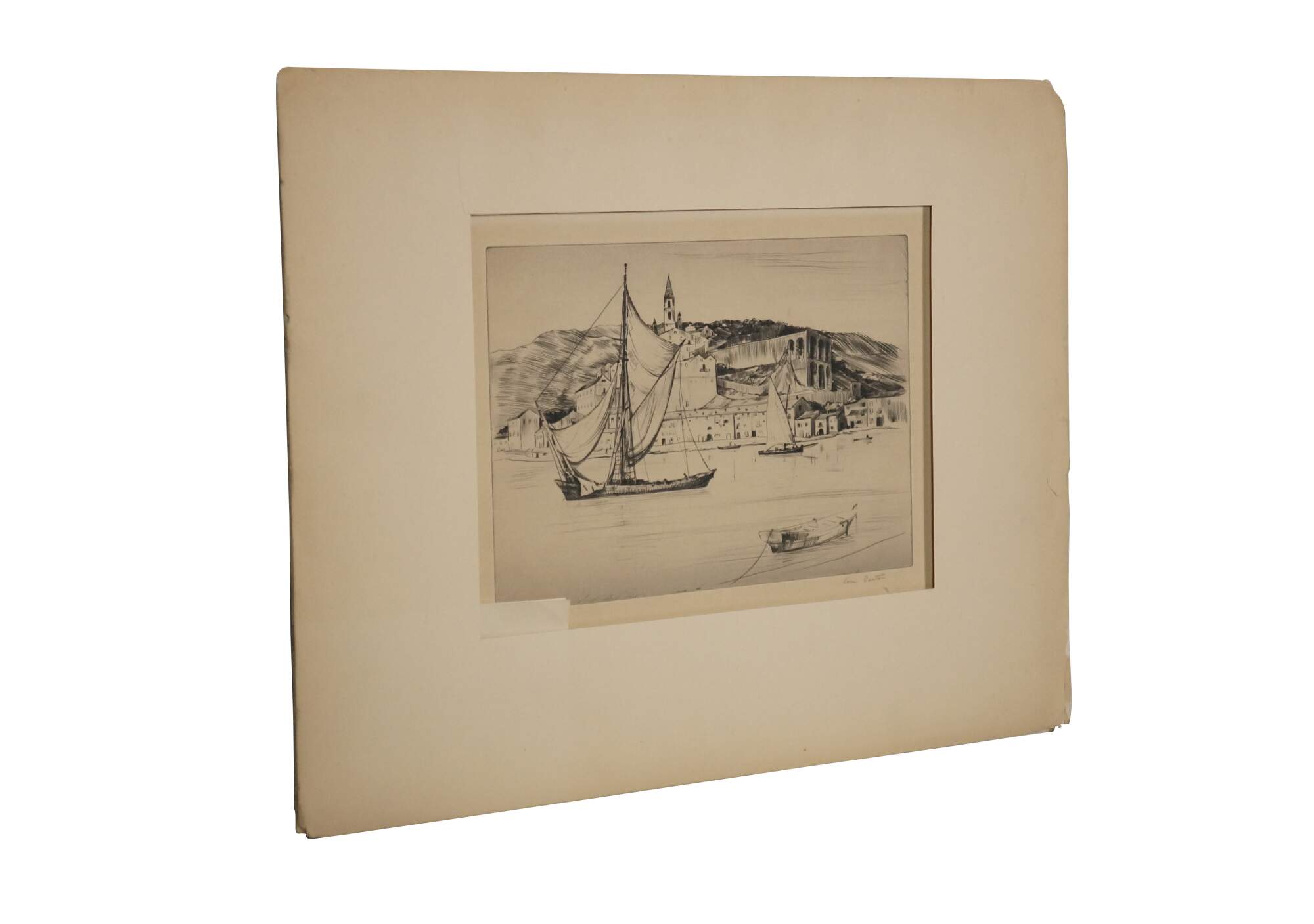 Early 20th century black and white etching titled "Ventimiglia" by Loren Roberta Barton. Coastal seascape of Ventimiglia Italy, with a large ship / sailboats in the foreground. Pencil signed, lower right. Paper in white cardstock mat; unframed.