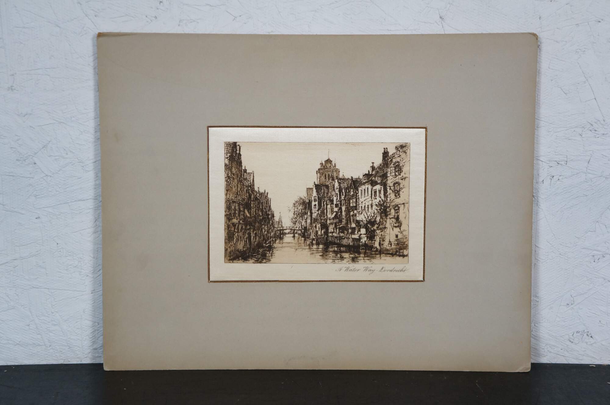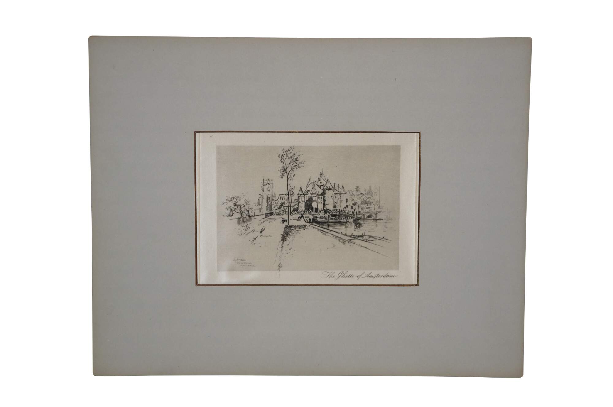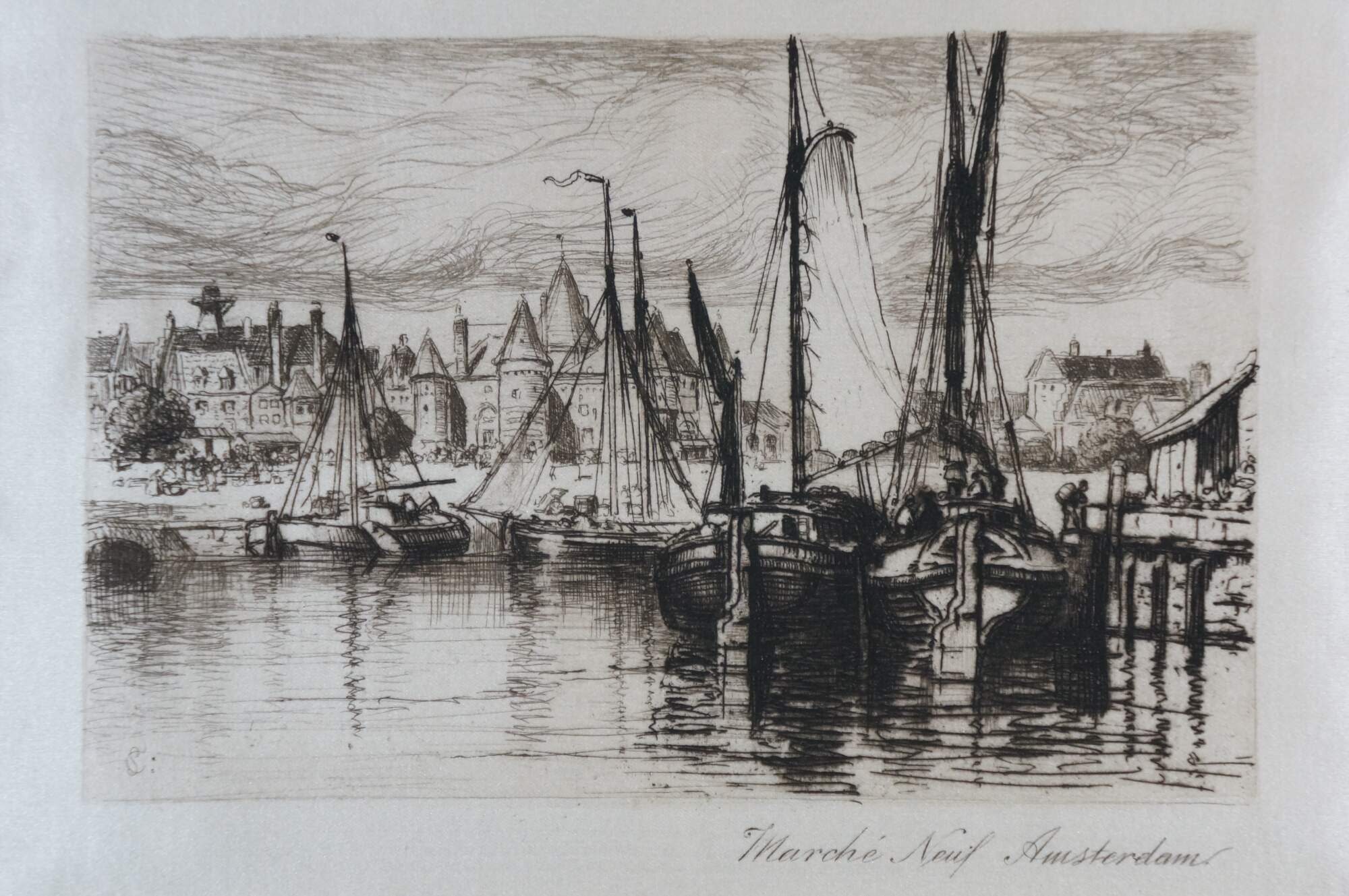 Set of four vintage black and white European etchings. Includes: "Marche Neuf Amsterdam" by Samuel Colman (1832-1920); "A Water Way - Dordrecht" by Charles A. Venderhoof; "On the Dyke" by Charles A. Vanderhoof; and "The Ghetto of Amsterdam" by Joseph Pennell from a sketch by M. Lalanne. Slightly metallic cloth/paper in gray cardboard mats. Cityscape, seascape, architecture, sailboats / ships / harbor.