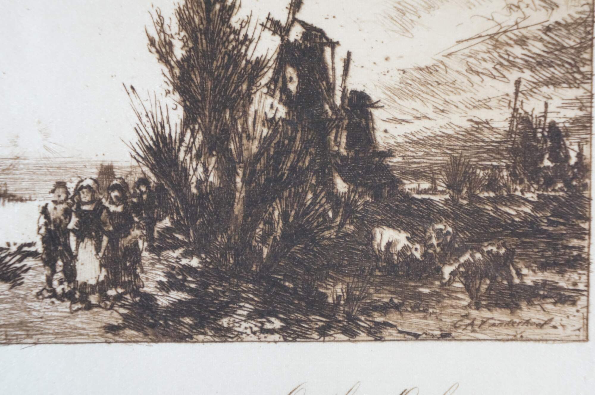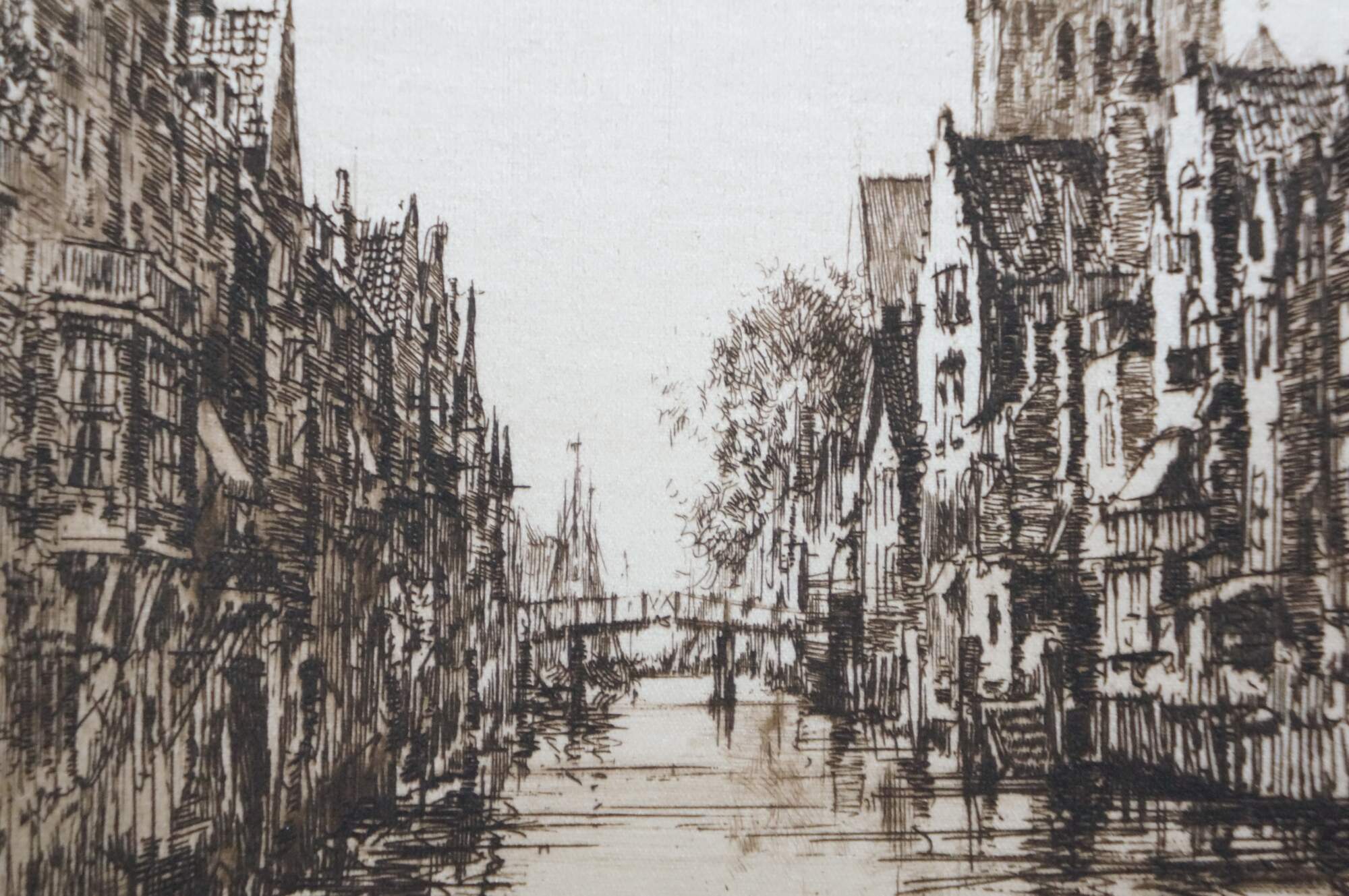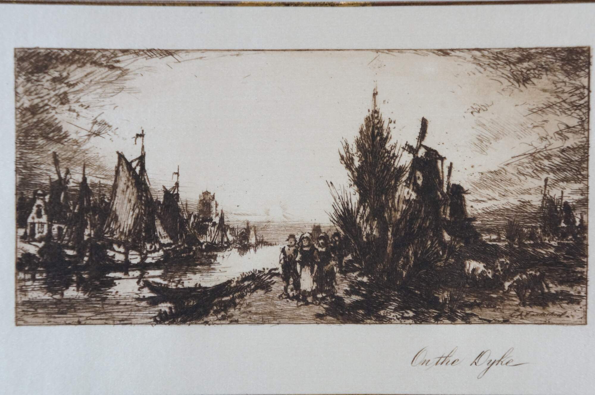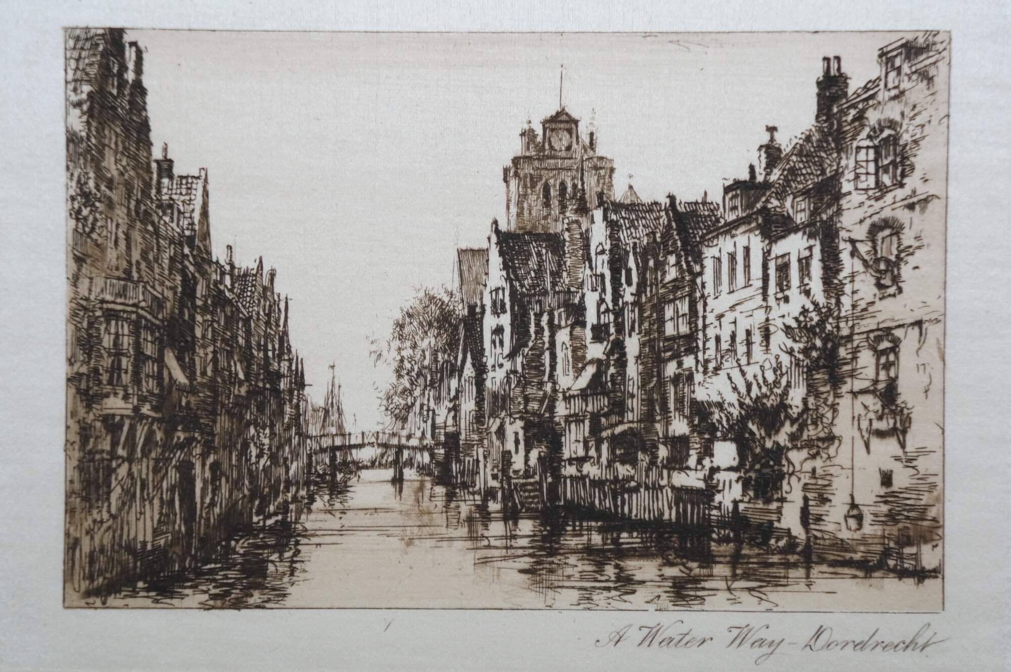 Set of four vintage black and white European etchings. Includes: "Marche Neuf Amsterdam" by Samuel Colman (1832-1920); "A Water Way - Dordrecht" by Charles A. Venderhoof; "On the Dyke" by Charles A. Vanderhoof; and "The Ghetto of Amsterdam" by Joseph Pennell from a sketch by M. Lalanne. Slightly metallic cloth/paper in gray cardboard mats. Cityscape, seascape, architecture, sailboats / ships / harbor.