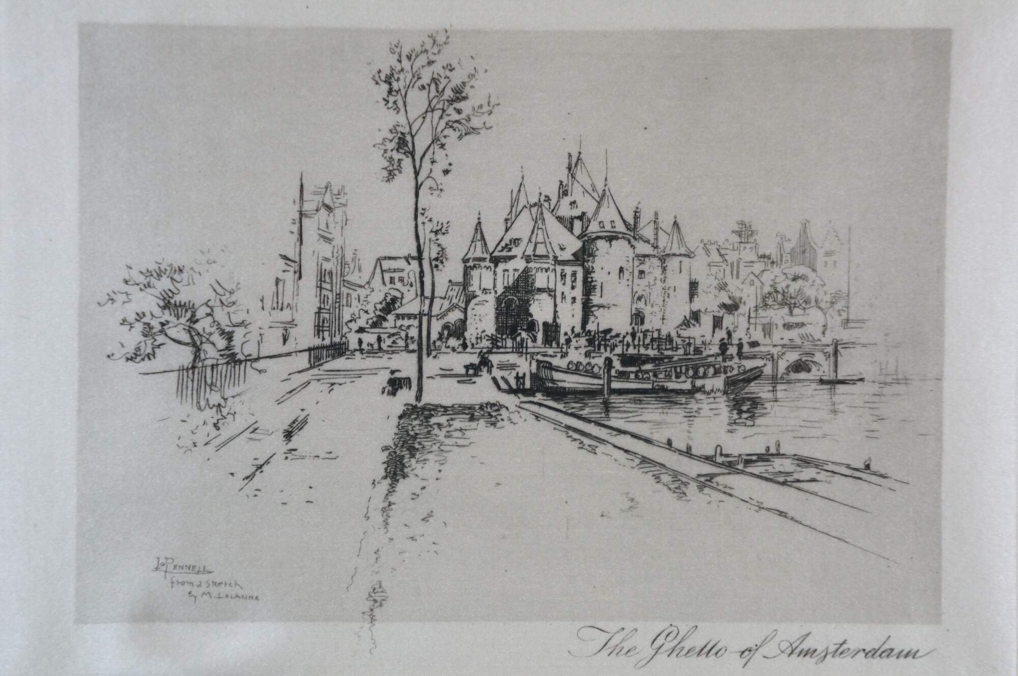 "Joseph Pennell, painter, illustrator, etcher, lecturer, critic, author, teacher, was born in Pennsylvania in 1857, the son of Philadelphia Quaker parents and briefly attended the School of Industrial Design now called the Philadelphia College of Art. He was a pupil in the Pennsylvania Academy of Fine Arts between 1878-80, and his unusual ability in etching was early recognized by his instructor, James L. Claghorn. In his time Pennell had "acquired no small measure of fame as a public lecturer, critic and author. He also taught at the Art Students' League. As an illustrator for a time he worked in New Orleans in collaboration with Cable, the novelist. In 1881 he went to Europe to illustrate some of the Italian writings of W. D. Howells. There he received recognition from Philip Gilbert Hamerton who secured his services in illustrating a book on a tour along the river Seine. "The fame of his work soon brought him all the commissions he wished," and he collaborated with Henry James, Justin McCarthy and Sir Walter Besant in illustrating the "picturesque buildings and streets of London. He also collaborated with Andrew Rensselaer in portraying "the Majesty and beauty of the English cathedrals". He did so with his wife Elizabeth Robbins Pennell. About his drawings an etchings one critic of the time said they are: "legion in number and must be seen to be appreciated [he completed over 1800 etchings and lithographs, executed mostly in Europe before 1917]. His etchings (he has destroyed all his early plates to prevent prints from worn-out plates finding their way into the market), run up into the hundreds and have an average excellence rarely maintained by a devotee of the needle, his Philadelphia, New Orleans, Italian, and London series, all have their own charm and excellence." Another critic wrote: "Mr. Pennell invests every one of his drawings with rare mood. His skies of dawn, noon , sunset, storm, and sunshine are chosen and painted with supreme skill, making pictures of high emotional value. As an etcher Mr. Pennell is without a peer." His style was strongly influenced by James Whistler. Pennell was known for taking up causes and upon his return to the United States he took up a "strenuous fight against unsightly billboards. His art was unique, peculiarly his own. His draftsmanship was legendary and one historian wrote: "the world produced few equals and no superior. With rare exception everything he has done has in an eminent degree, the quality of the artistic." (Brush & Palette 12:81) He did a famous series of twenty-three lithographs of the Panama Canal that gained him much notoriety, and the Italian government has purchases for the Uffizi Gallery the originals. They also purchased his lithographs of the Grand Canyon and the Yosemite that he did while traveling in the American West in 1912 and 1915. Pennell also did scenes of San Francisco during those trips. That was the first time lithographs were acquired for the Uffizi and conferred the distinction of the "talented American Artist." He also did lithographs for the United States and Great Britain during the war that were "high class propaganda-to stir the war spirit and to stimulate national pride." He won numerous awards for his work including: 1st class gold medal, Paris Expo., 1900; Dresden, 1902; Grand Prize, St. Louis Expo., 1904; gold medal, Liege, 1905; Grand Prix, Milan, 1906; Barcelona, 1907; Brussels, 1910; Diplome d'Honneur, Amsterdam, 1912; 2 medals, London, 1913; Florence,1914; Commemorative medal, Florence, 1915 and others. Joseph Pennell was elected an Associate of the National Academy in 1907, and an Academician in 1909. Pennell was a member of the New York Etching Club and author of "Lithography and Lithographers, 1900; The Authorized Life of J. McN. Whistler (with Mrs. Pennell, 1910; and Pictures of War Work in America, 1918. He also illustrated a great number of books and was a contributor to the leading magazines of his day. He passed away April 23rd, 1926." (askART)