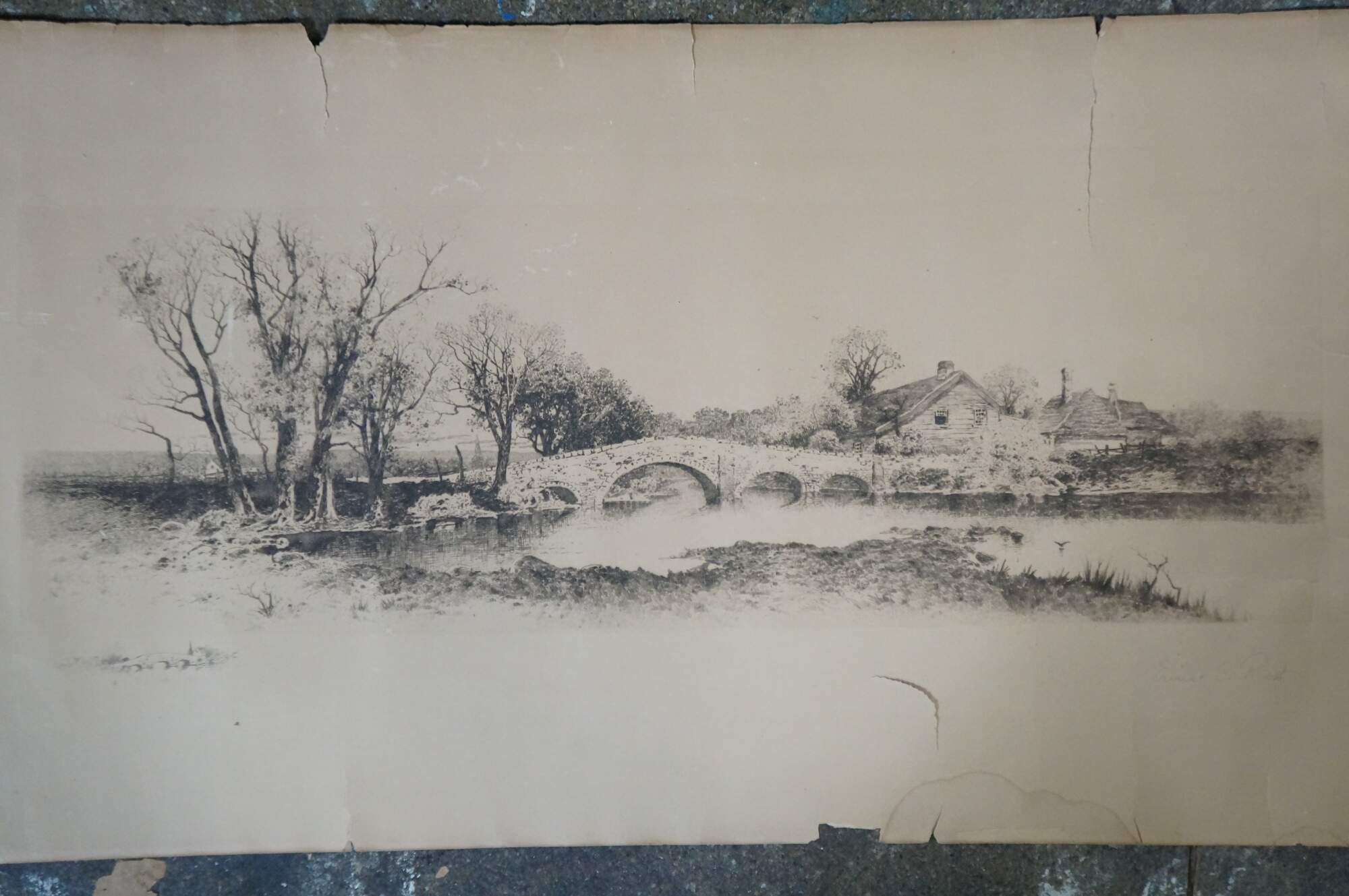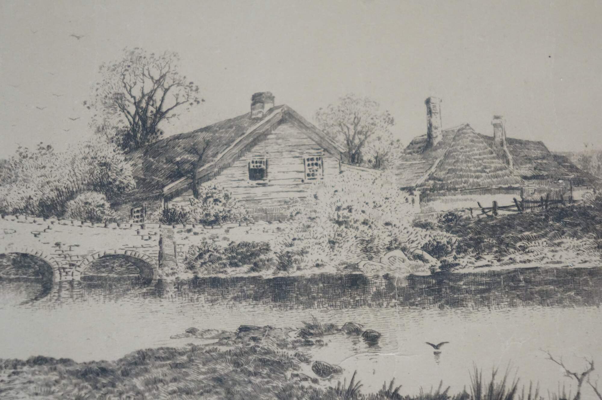 Early 20th century black and white etching by Ernest C. Rost. Panoramic landscape showing a stone bridge across a river near cottages. Remarke of a stone bridge, lower edge. Signed in plate. Published by James Tyroler, New York, 1902. Paper; unframed.