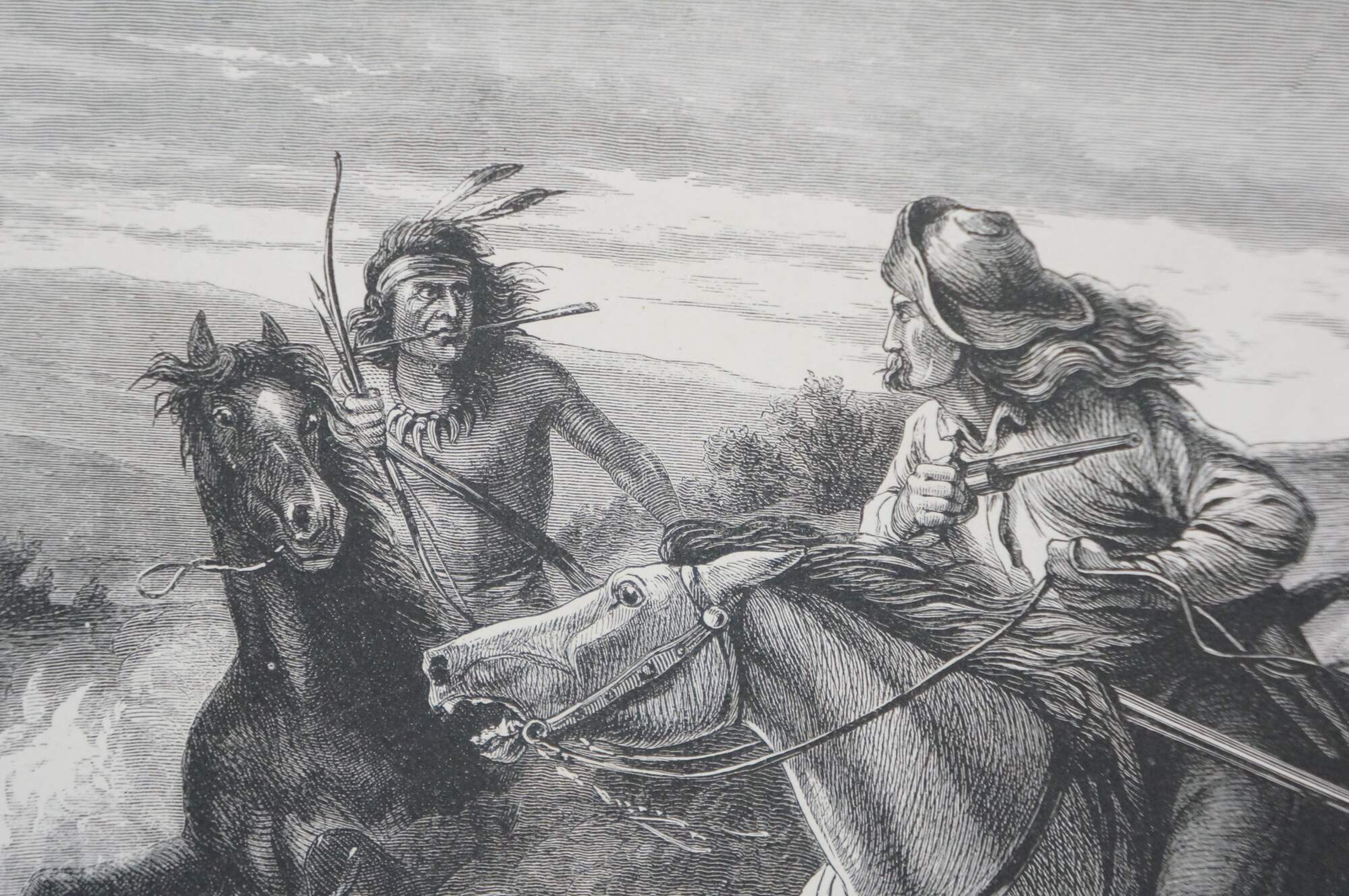 Late 19th century black and white etching titled "Maifest Destiny" by William de la Montagne Cary, as published by Richard Brend'amour. Amrican Western landscape featuring a settler and Native American glaring at each other as they ride horseback hunting a bison. Signed in plate. Paper; unframed.