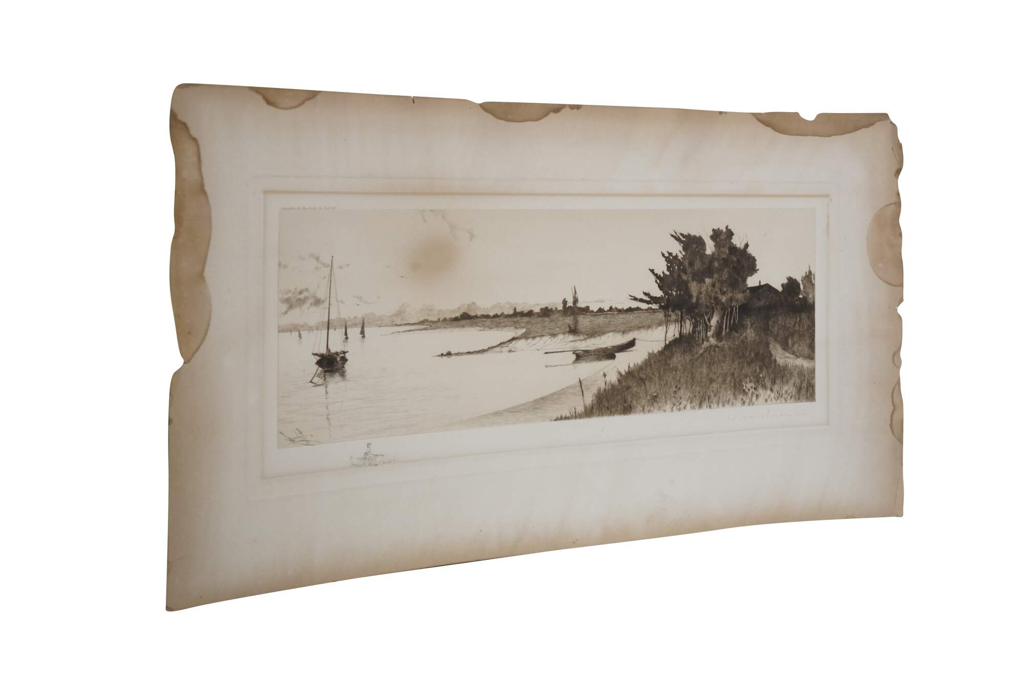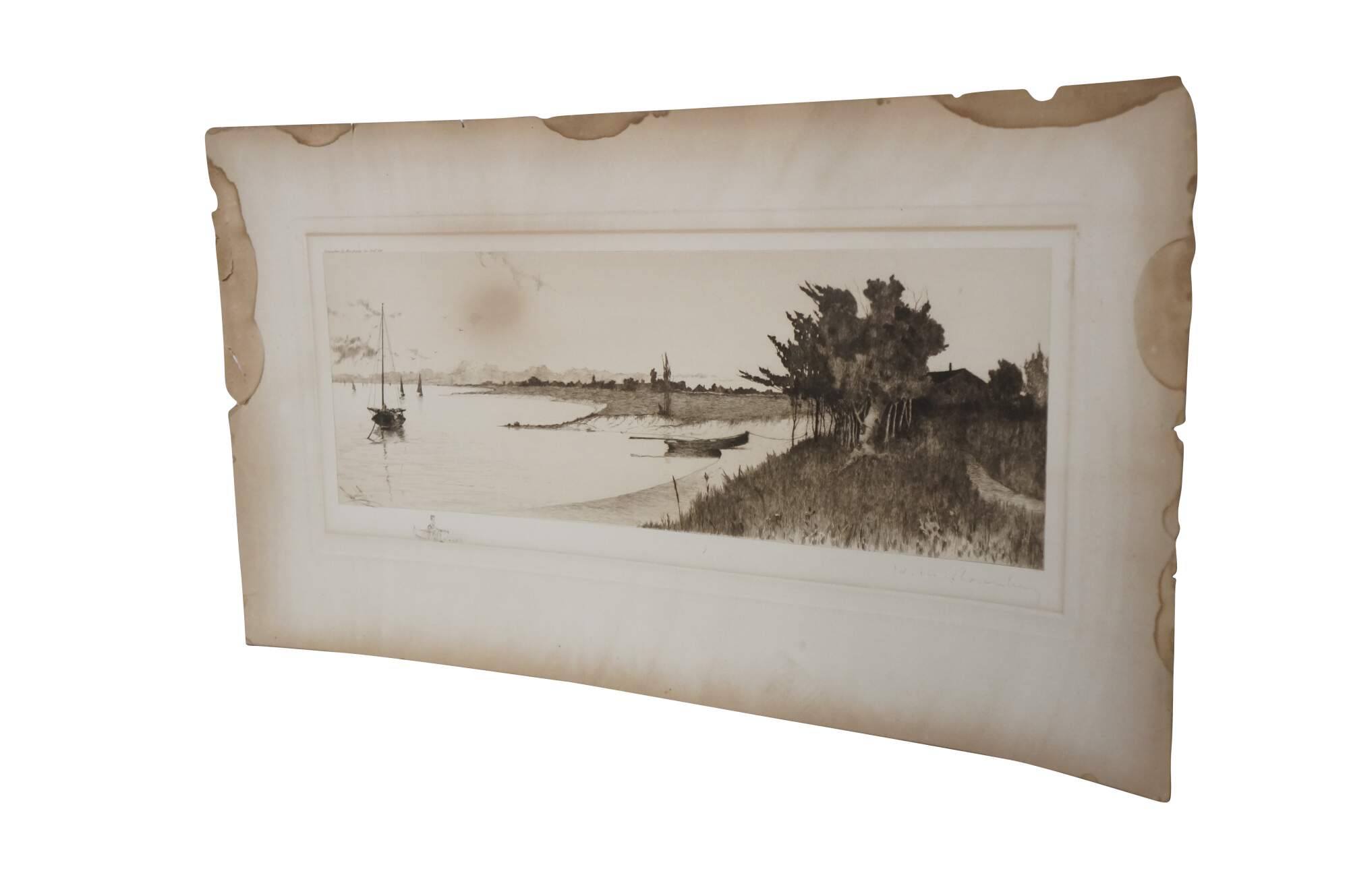 Late 19th century black and white etching by Henry Mortikar Rosenberg. Panoramic riverscape of a shorline and sailboats. Copyrighted by Max Jacoby, New York, 1890. Signed in plate; dated Feb. 90. Remarke of a Victorian woman seated on a boat, lower edge. Pencil signed, lower right. Paper on cardstock; unframed.