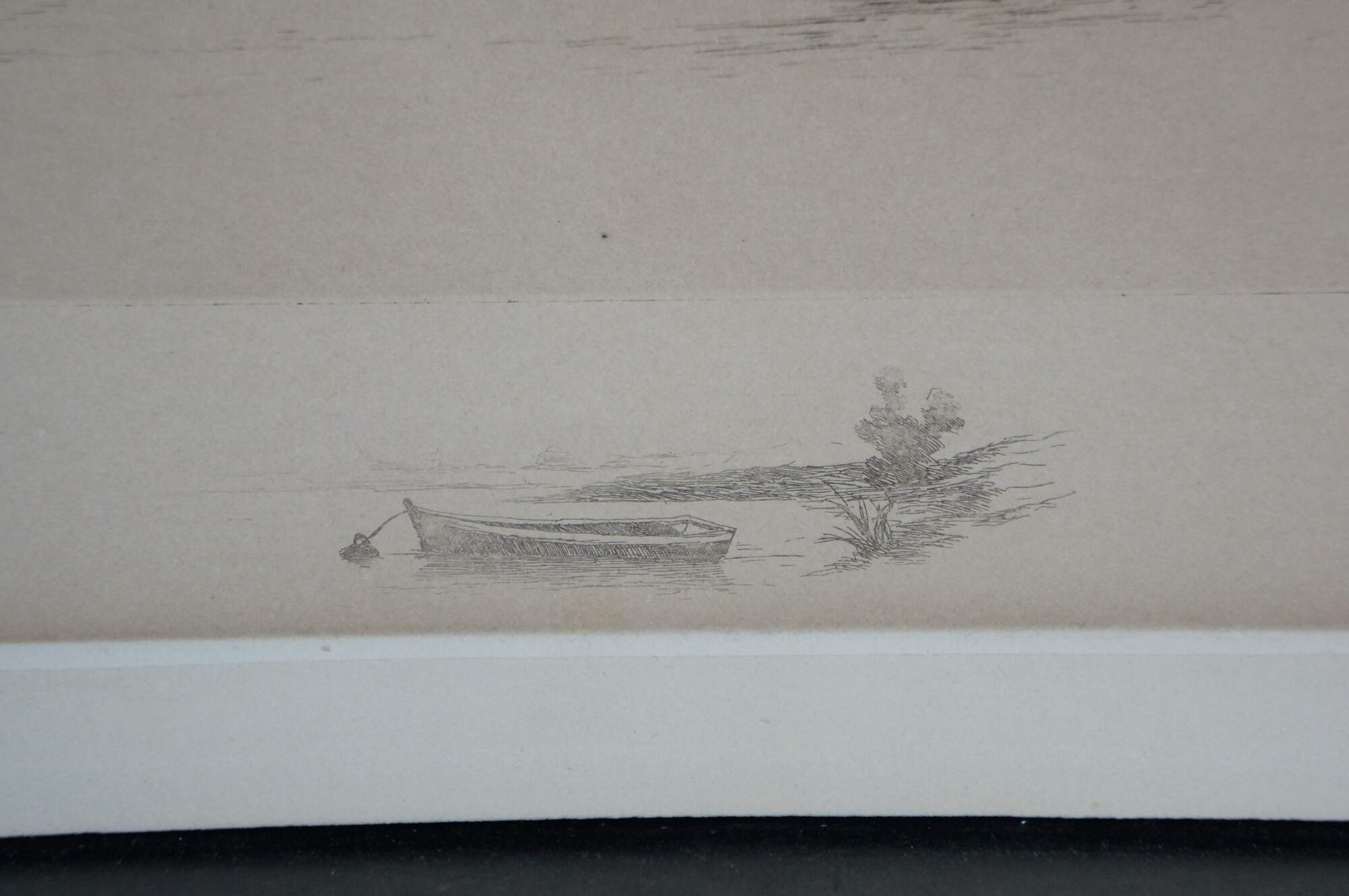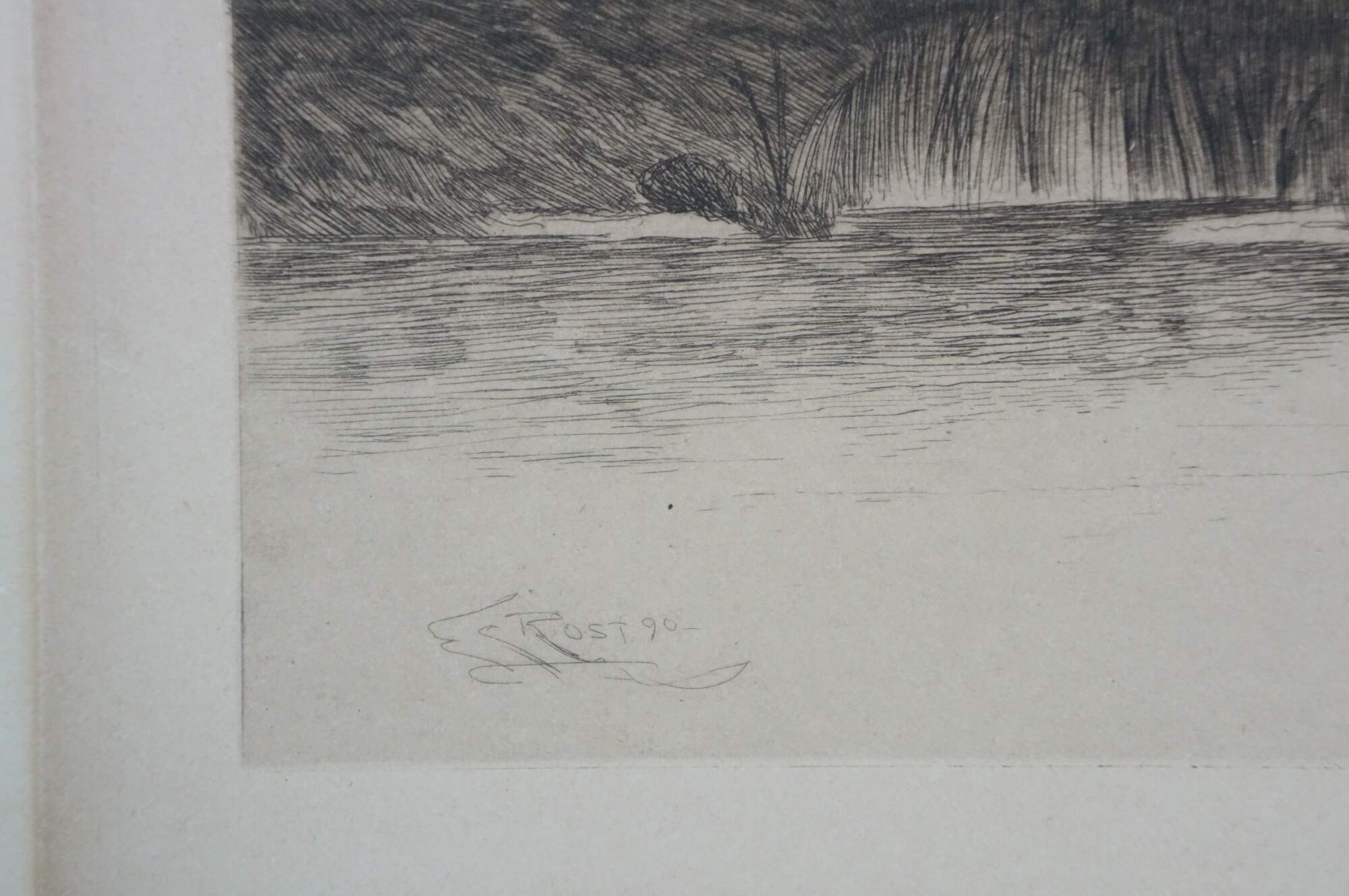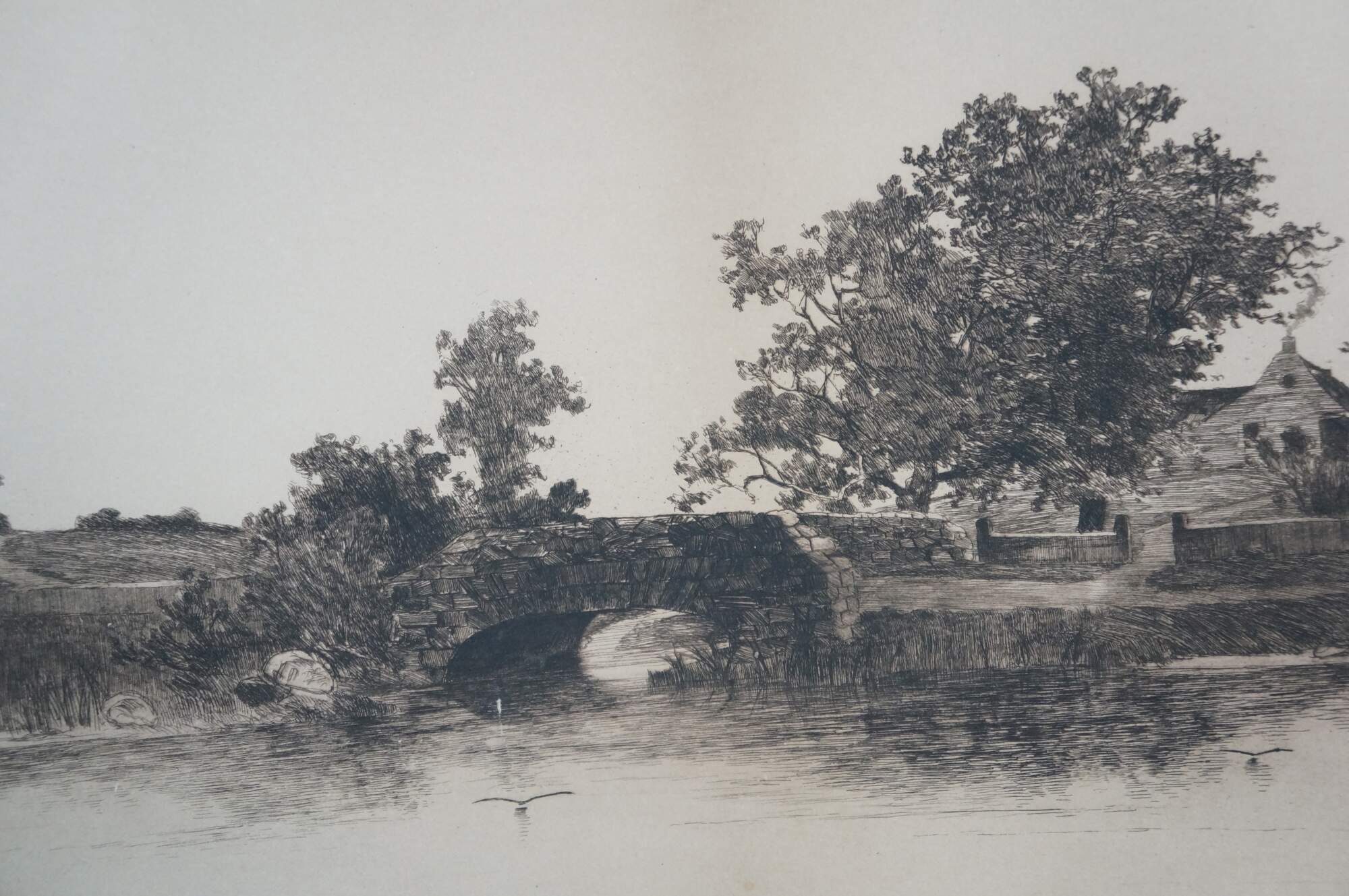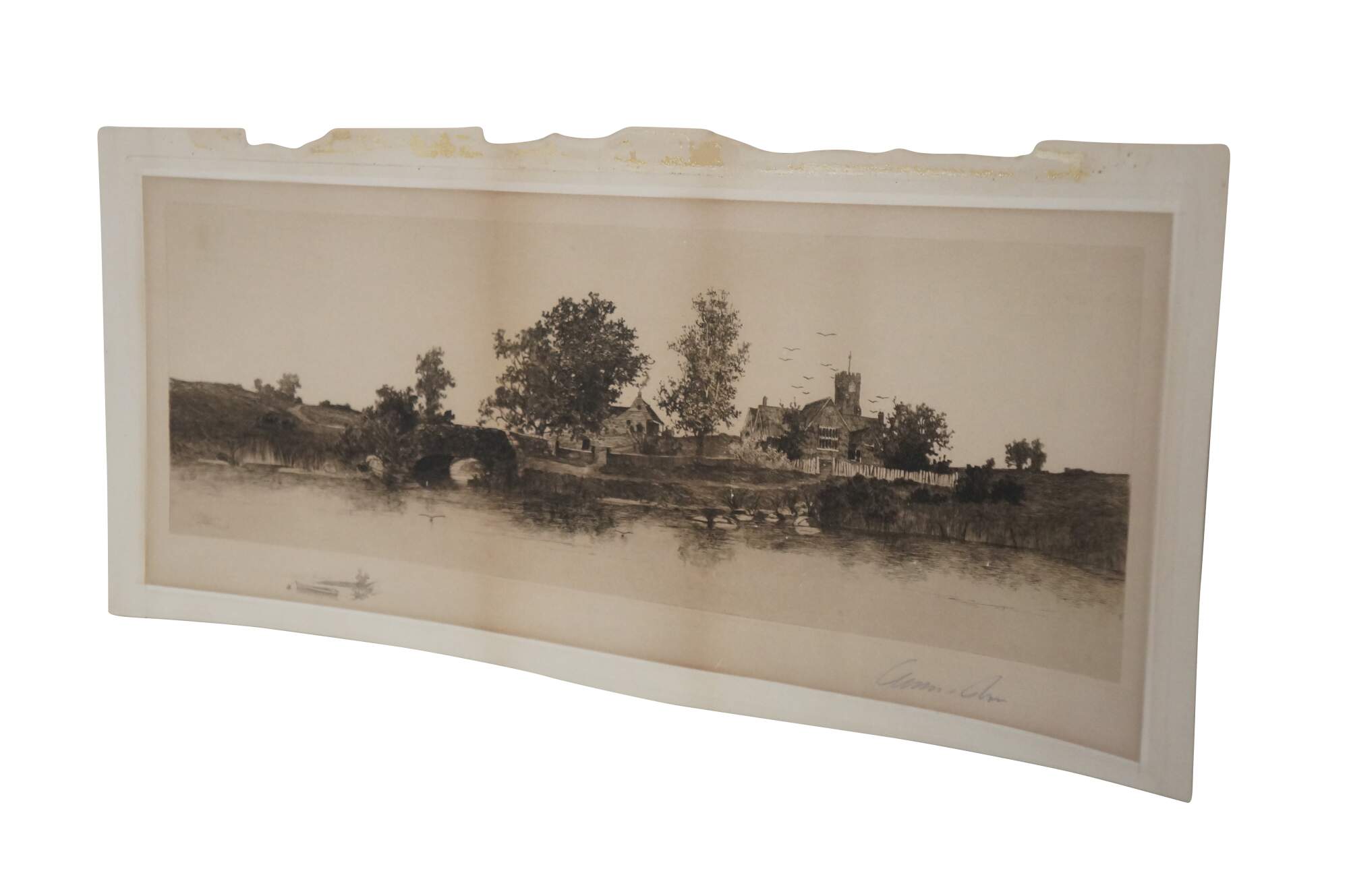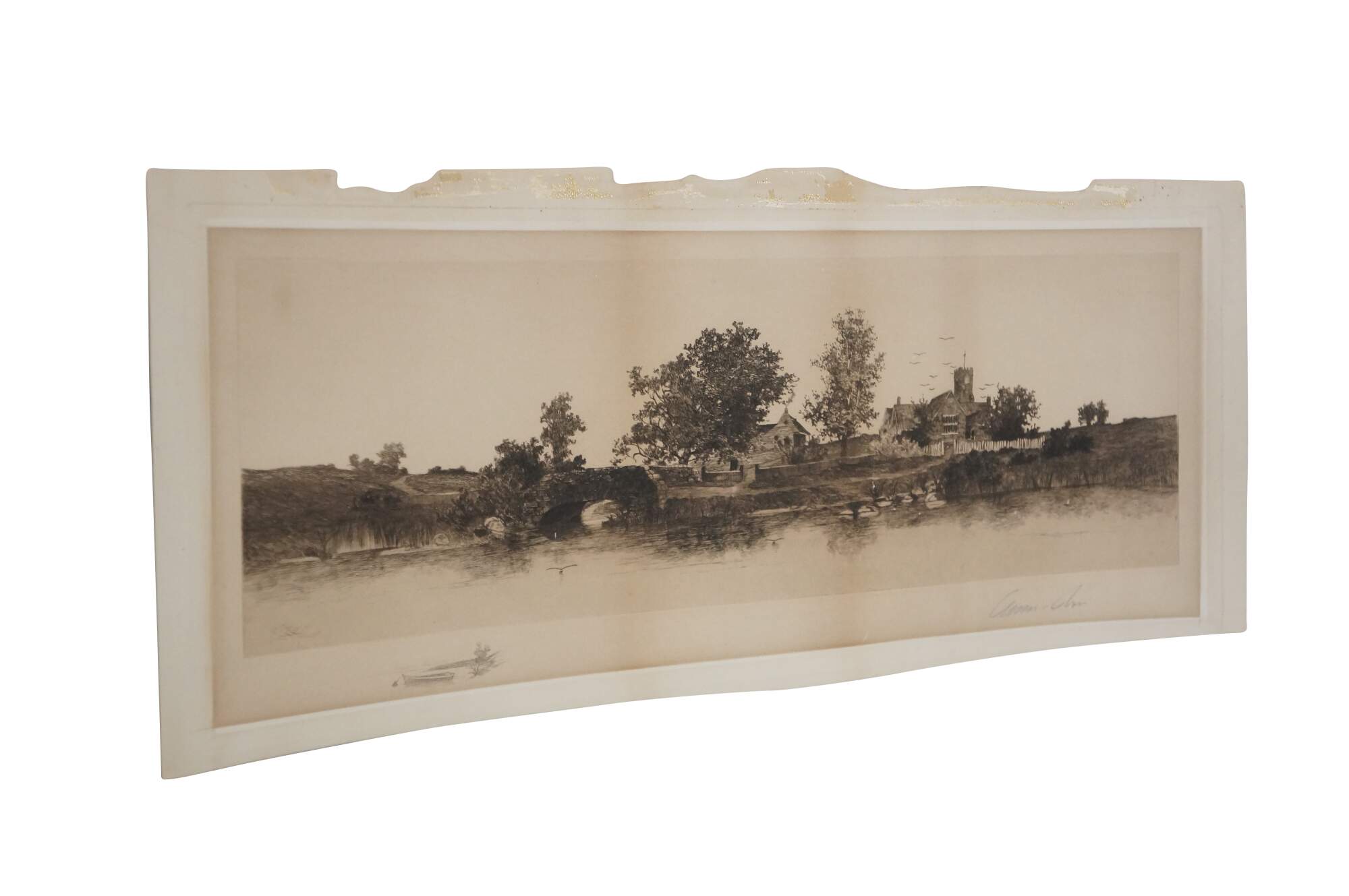 Late 19th century black and white etching by Ernest C. rost. Panoramic landscape of a stone bridge and village along a river. Published by Fishel, Adler & Schwartz, New York. Signed in plate; dated 90. Remarke of a rowboat, lower edge. Pencil signed, lower right. Paper; unframed.