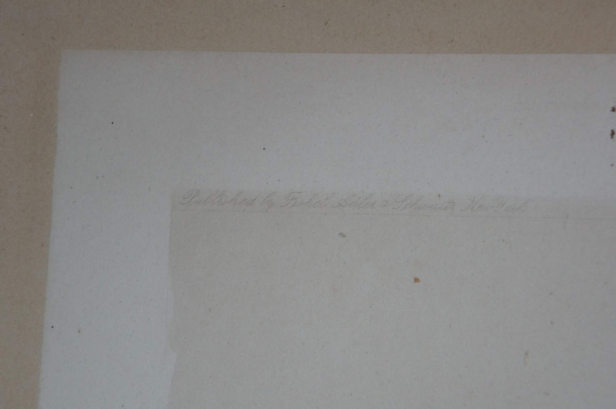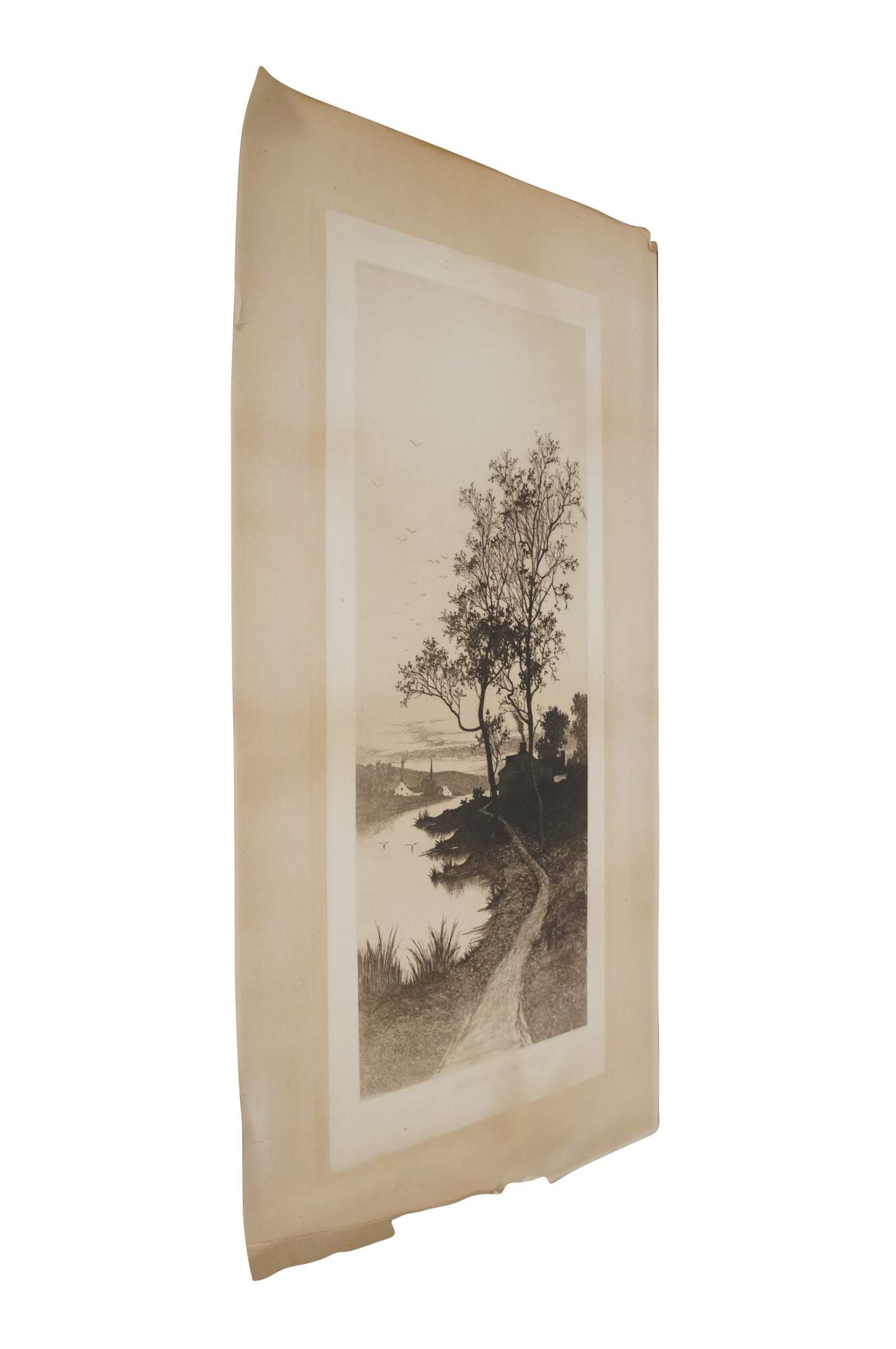 Late 19th century black and white etching titled "September Sunset" by Ernest C. Rost. Vertical landscape showing a narrow footpath next to water. Published by Fishel, Adler & Schwartz, New York. Signed and titled in plate. Paper; unframed.